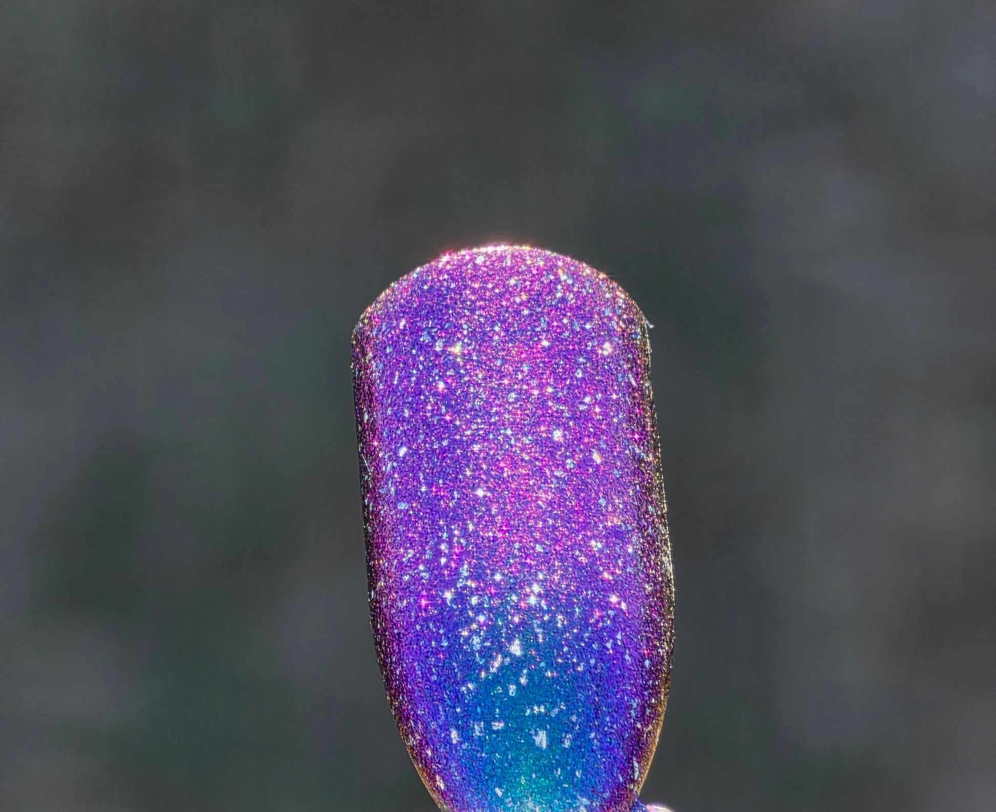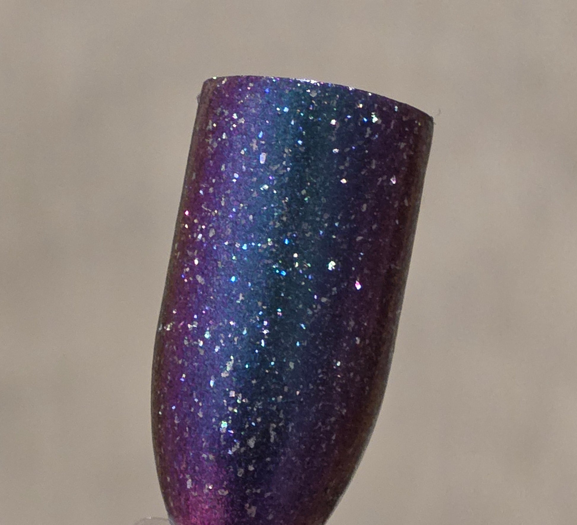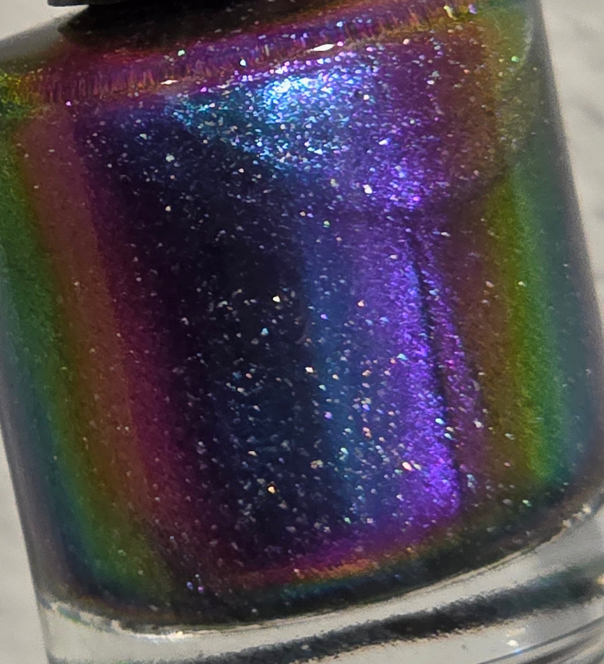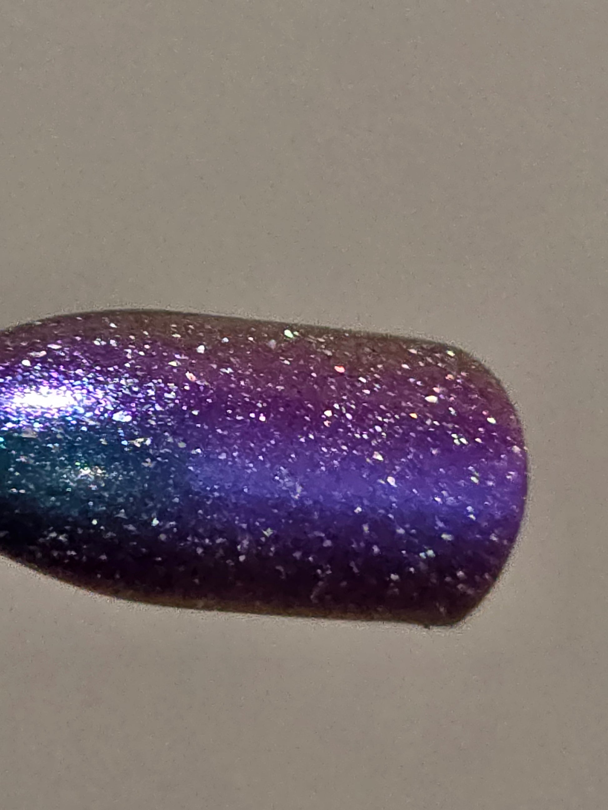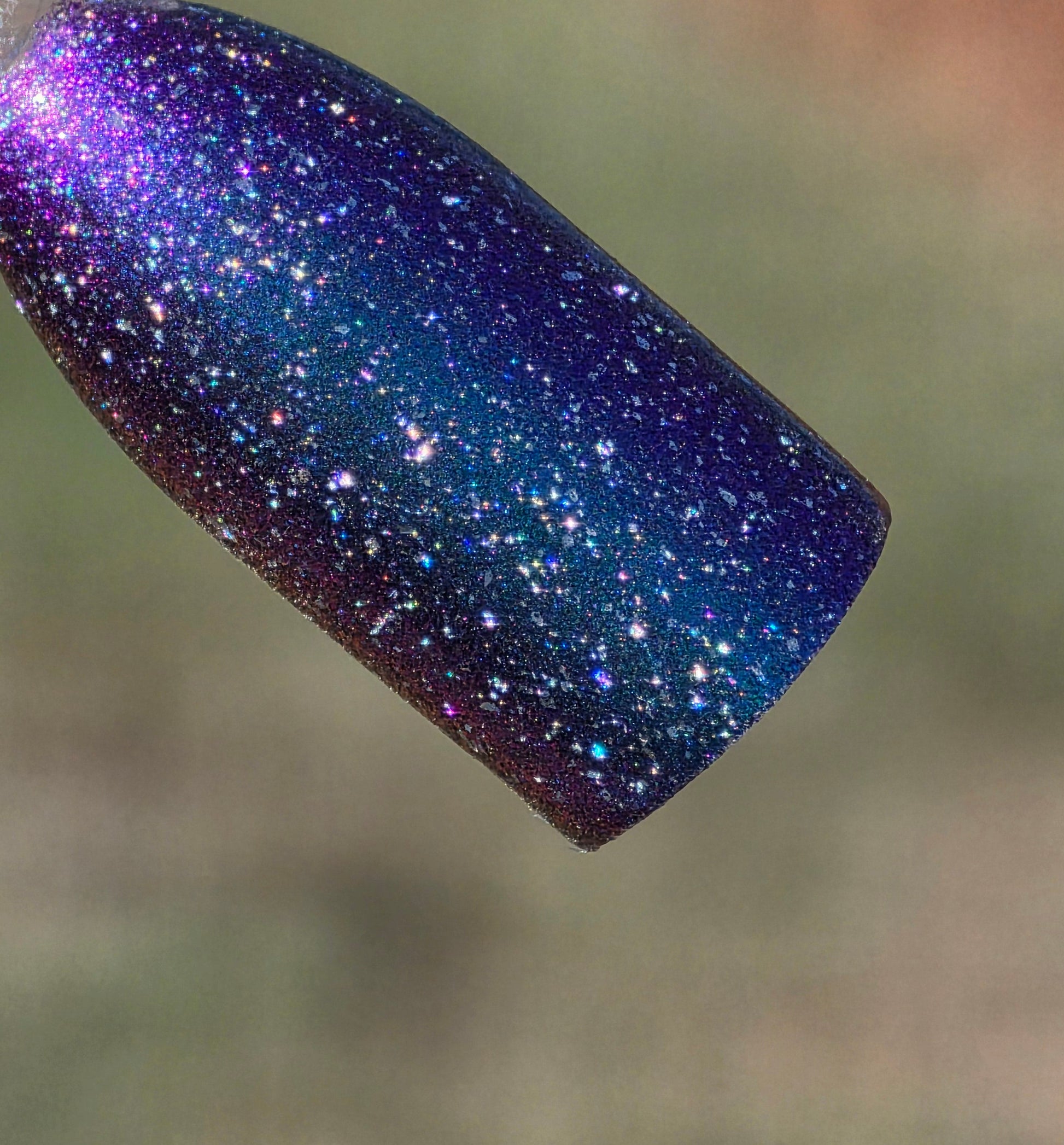 Beyond the Realm is a dark blue multichrome that shifts purple/pink/orange/green/teal, and has holo flakes throughout. The color shifts in this polish is amazing.