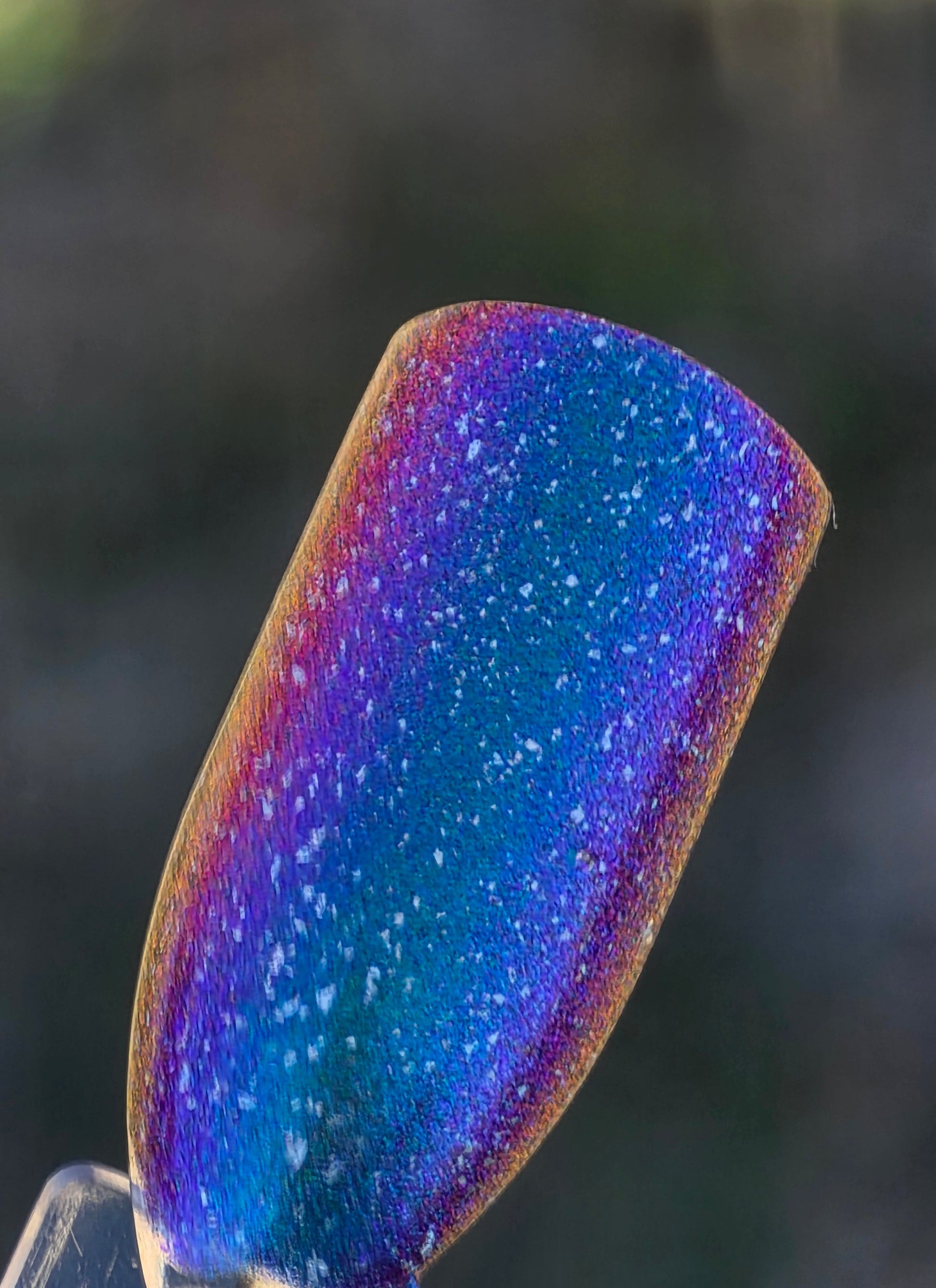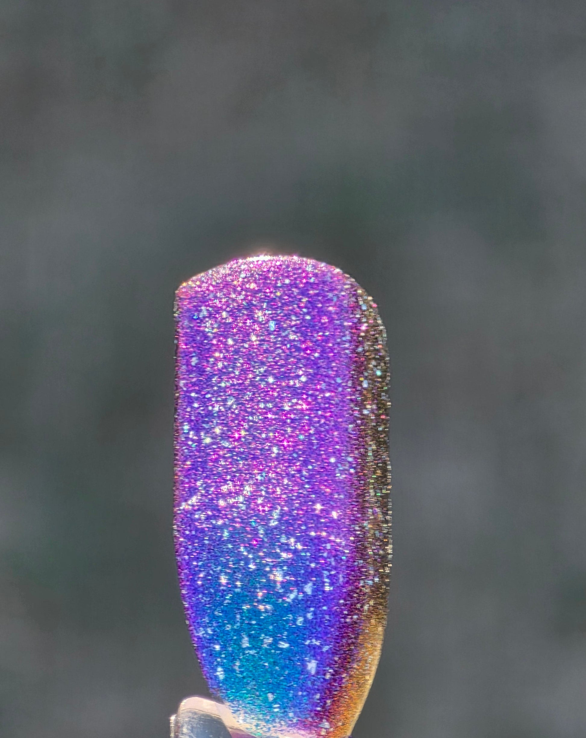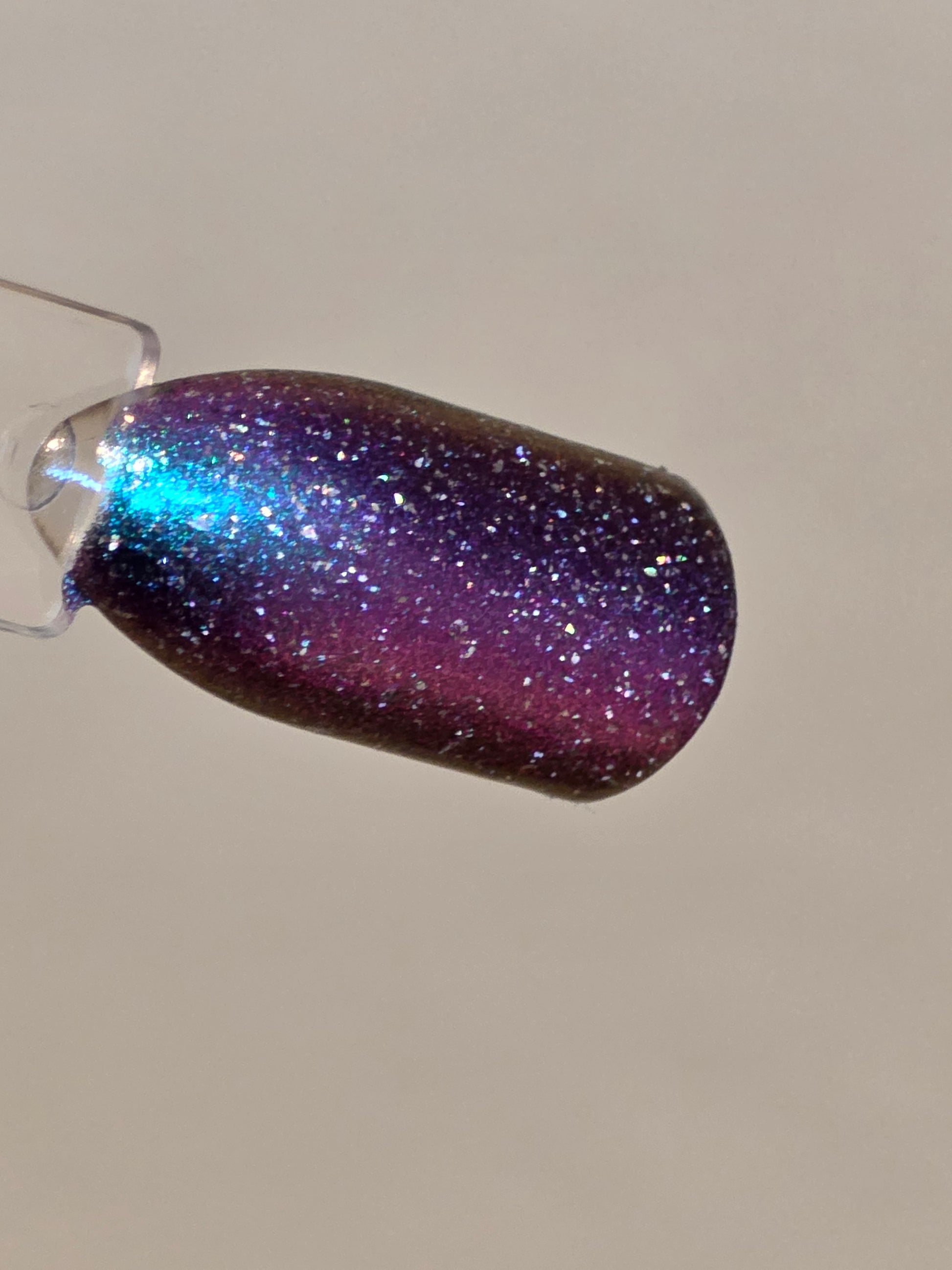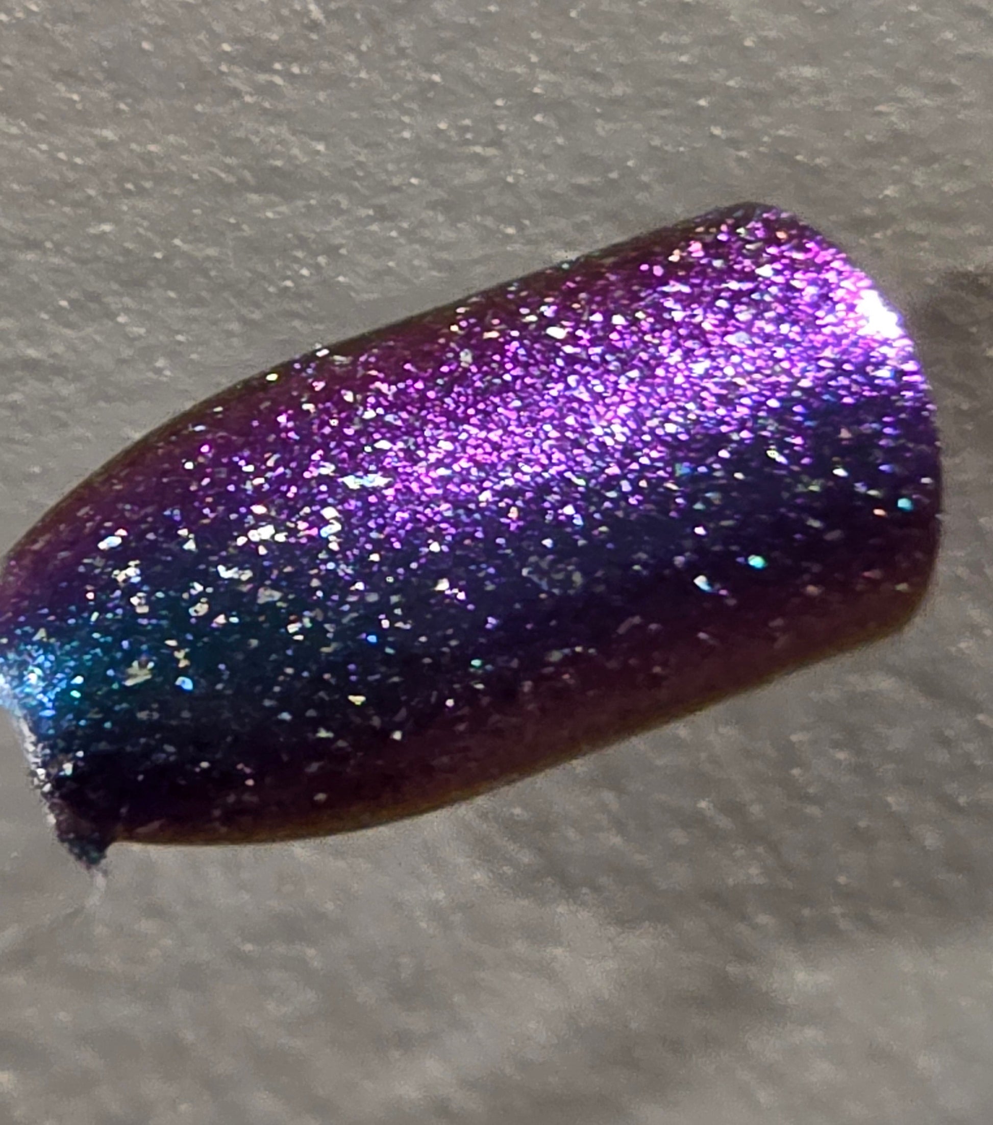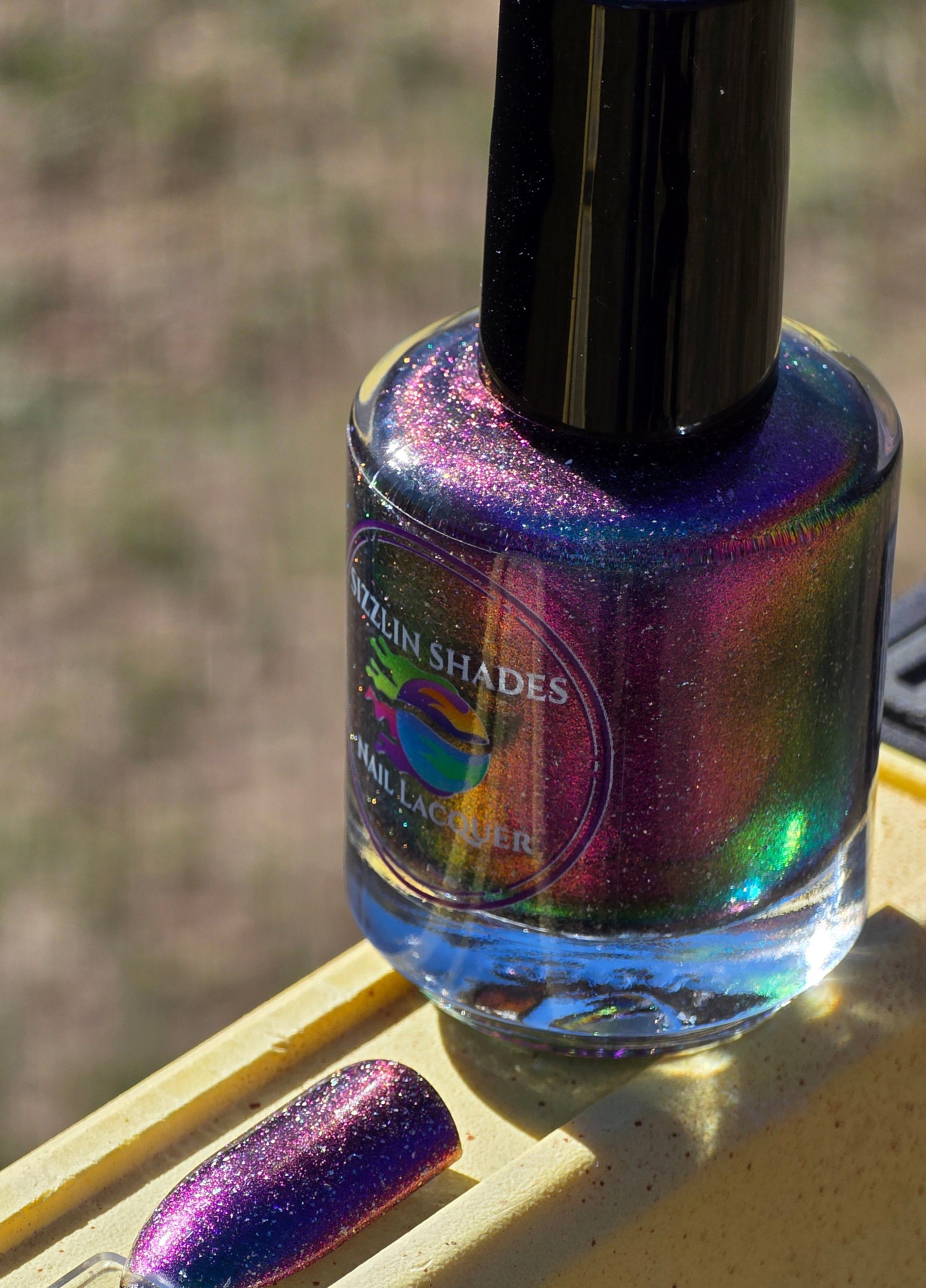 Beyond the Realm is a dark blue multichrome that shifts purple/pink/orange/green/teal, and has holo flakes throughout. The color shifts in this polish is amazing.