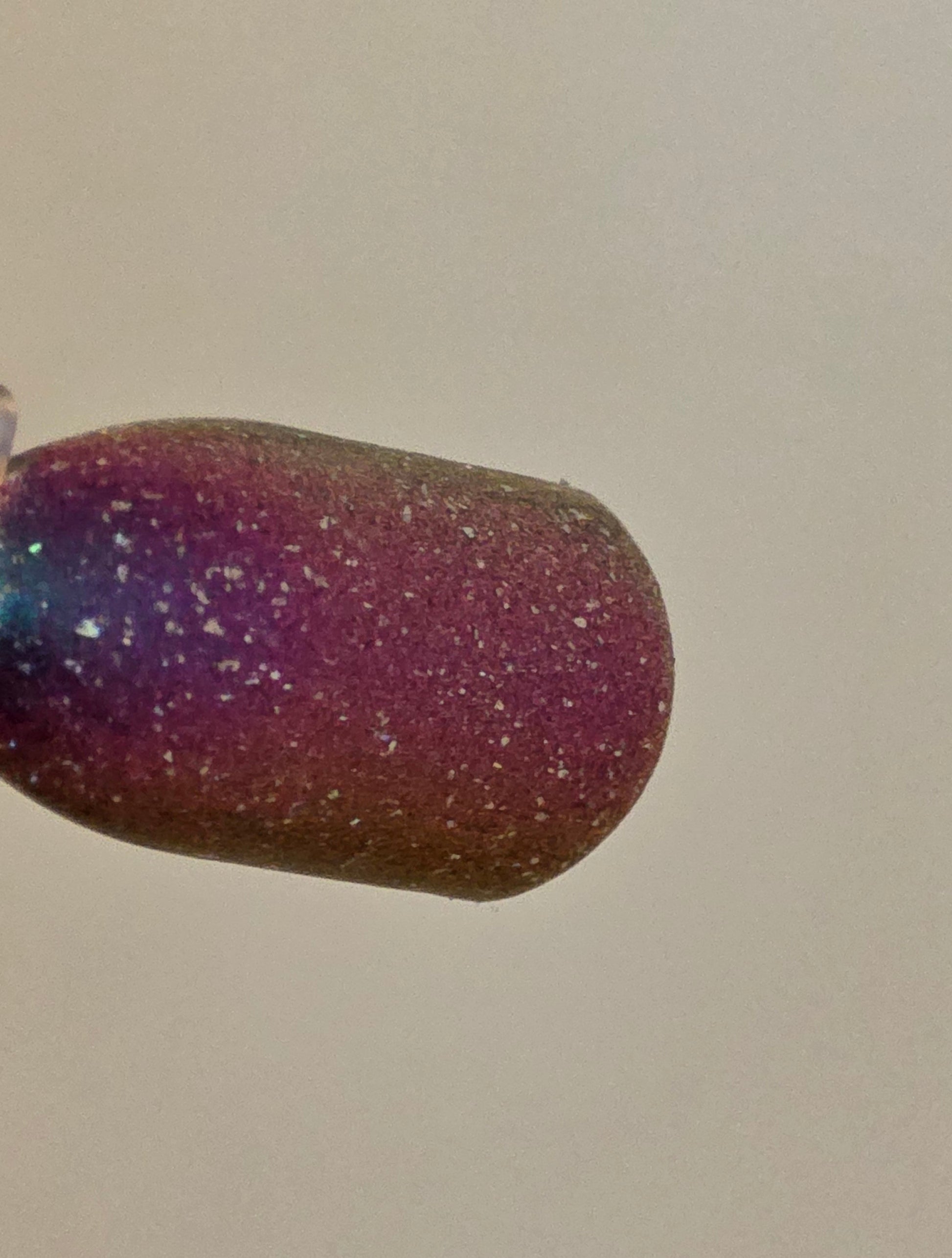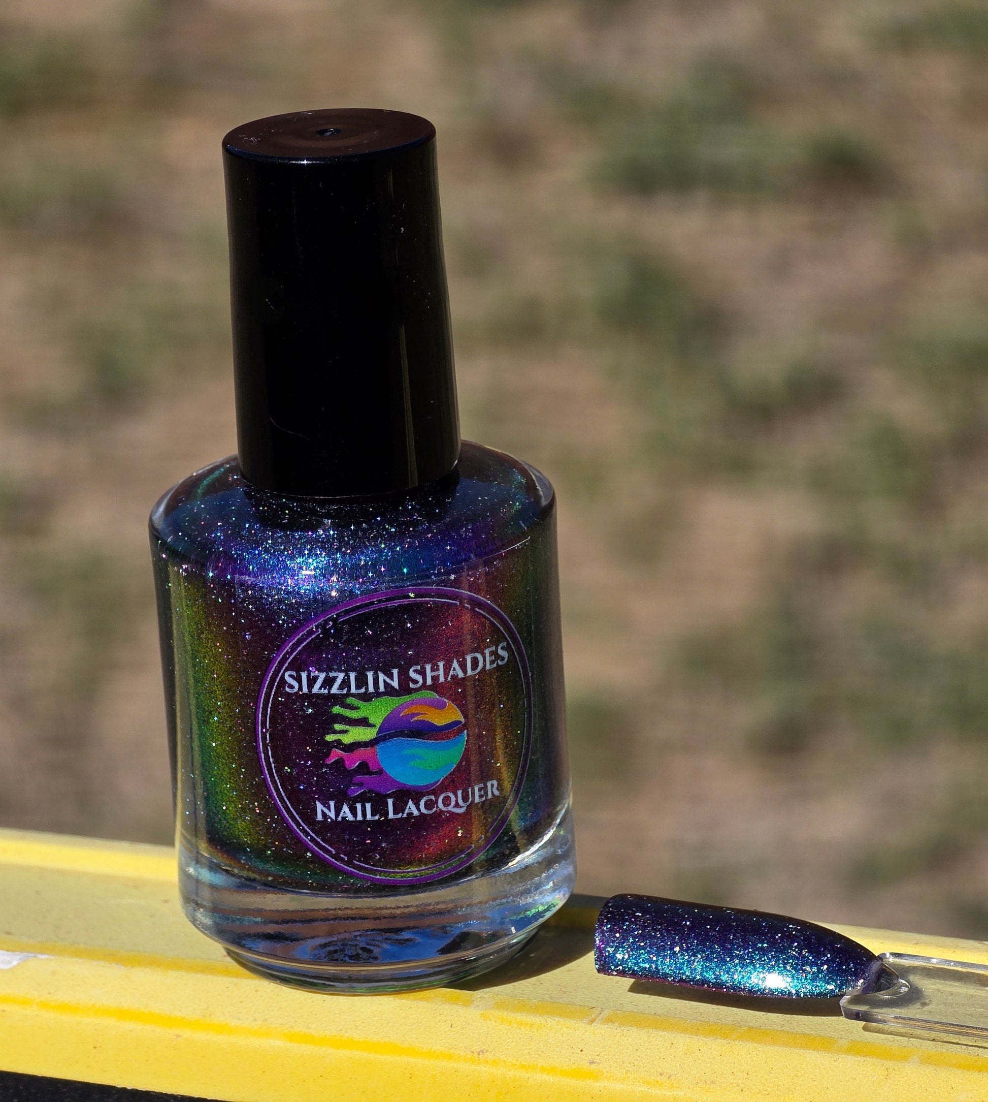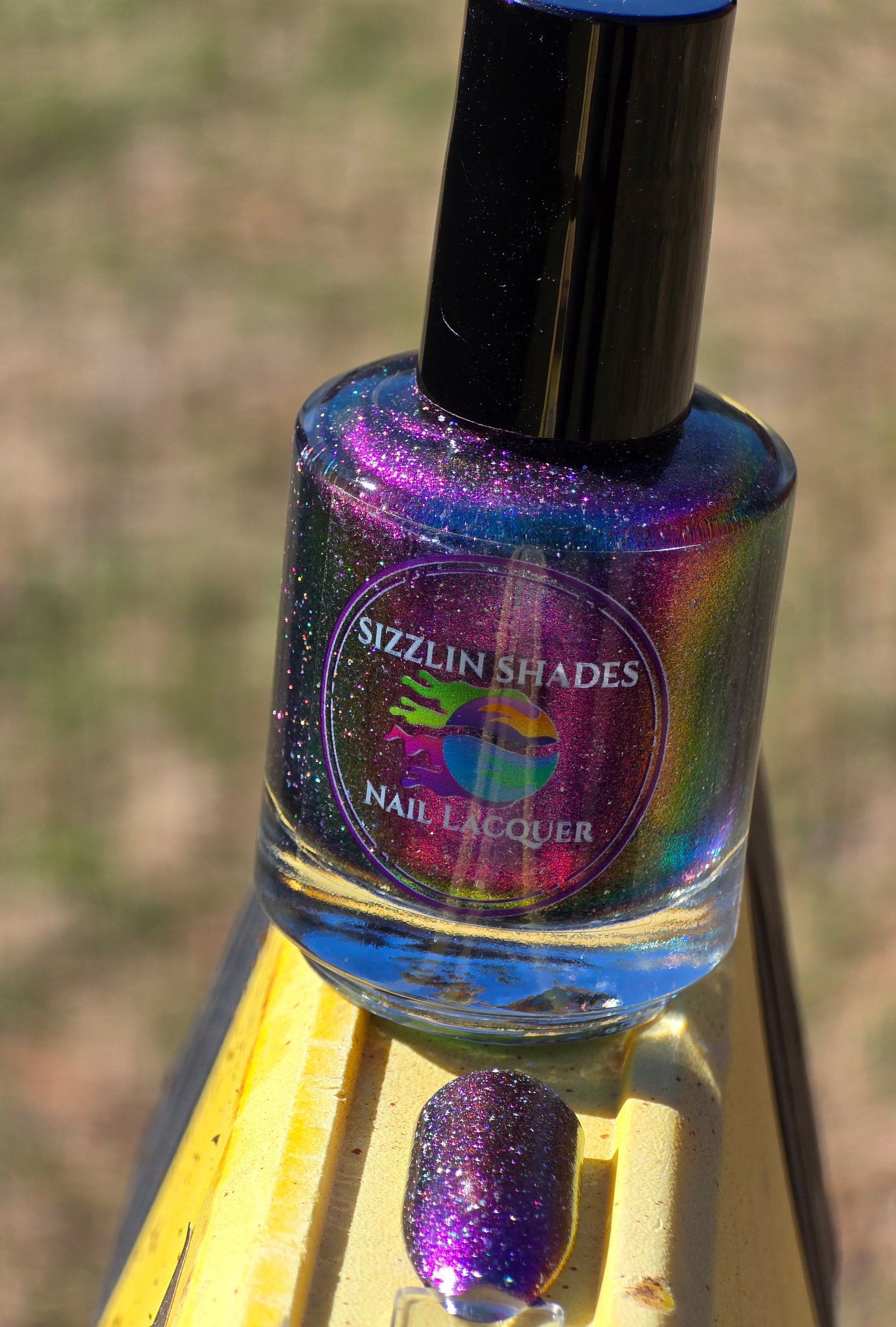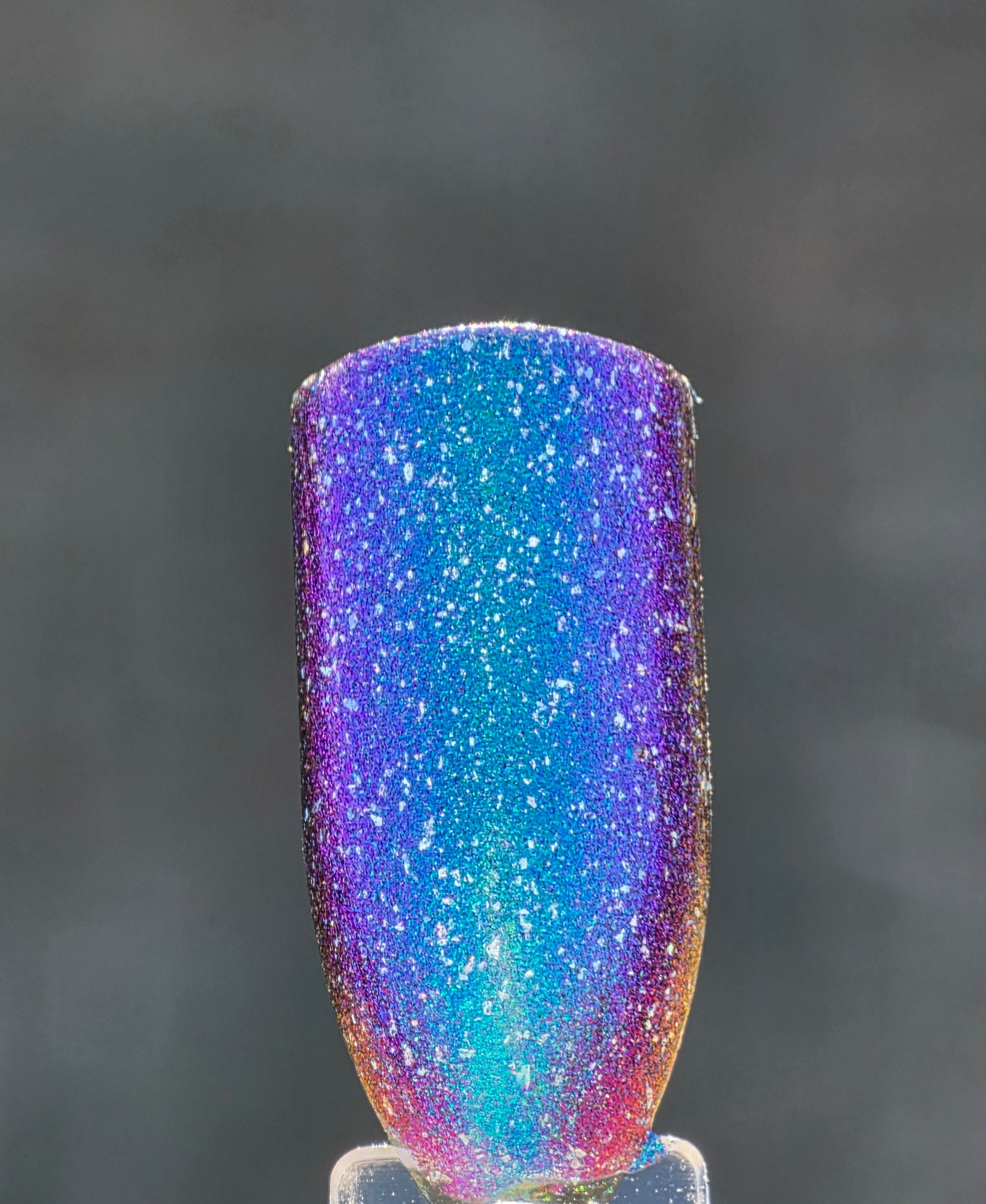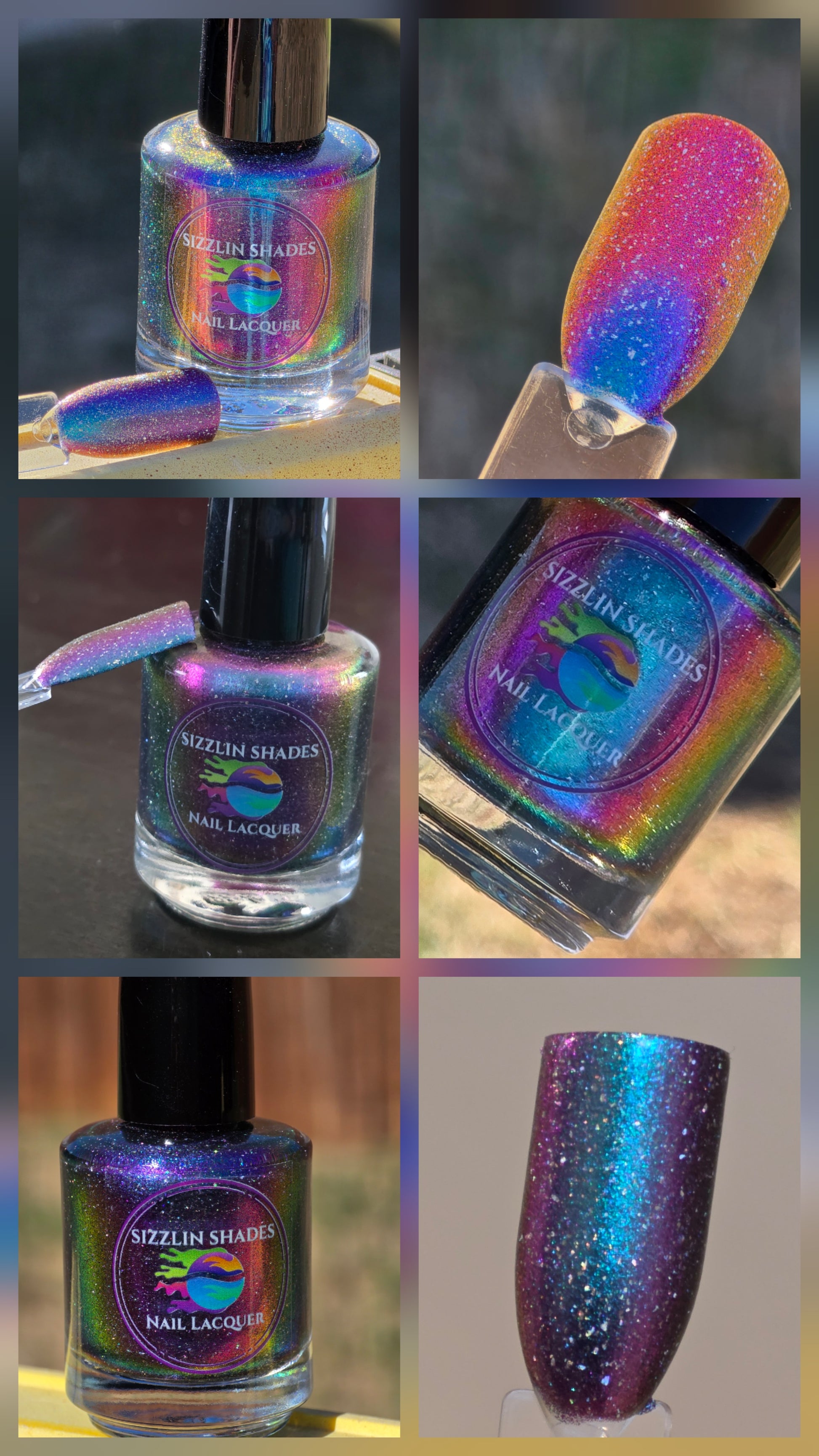 Beyond the Realm is a dark blue multichrome that shifts purple/pink/orange/green/teal, and has holo flakes throughout. The color shifts in this polish is amazing.