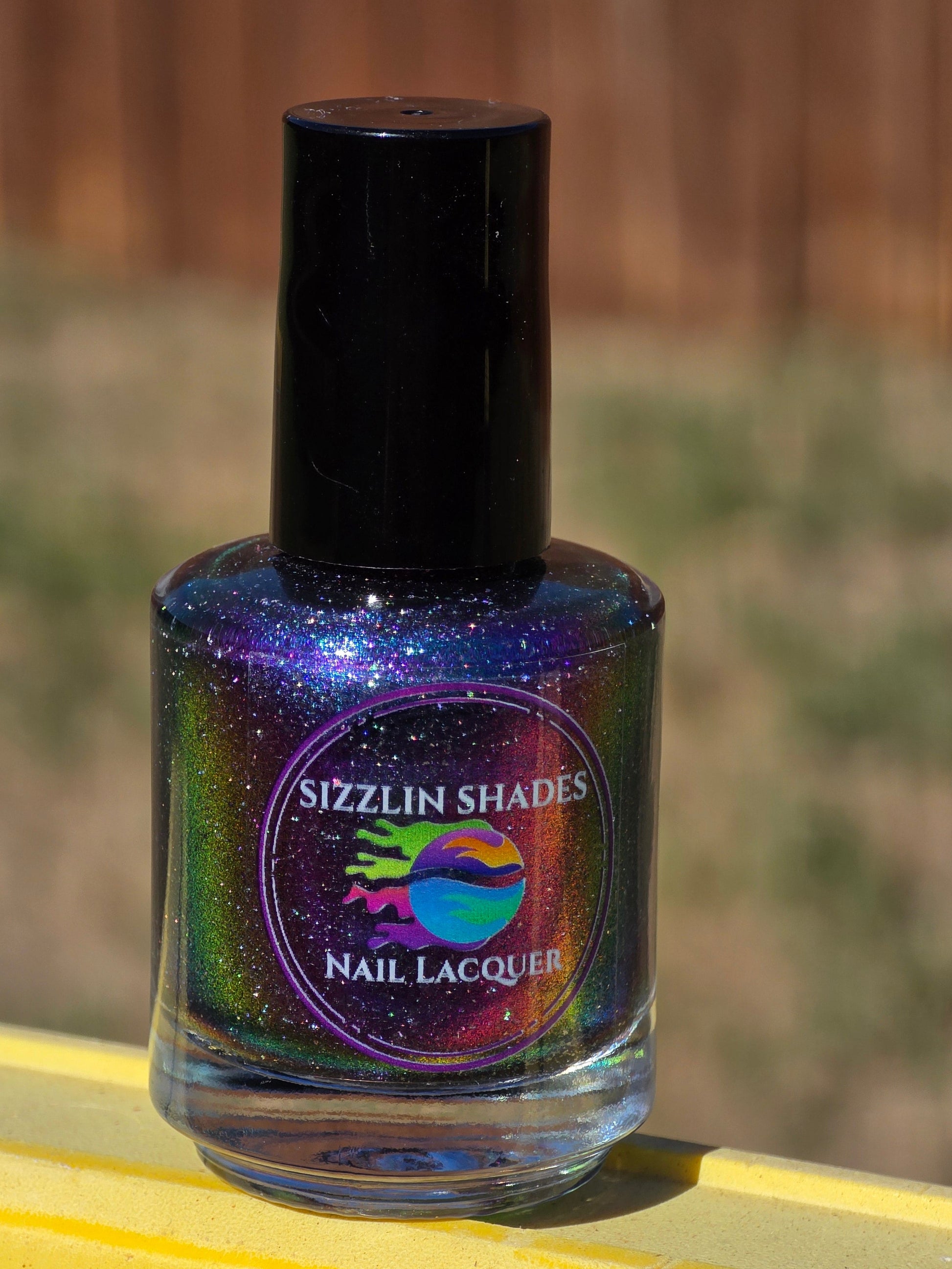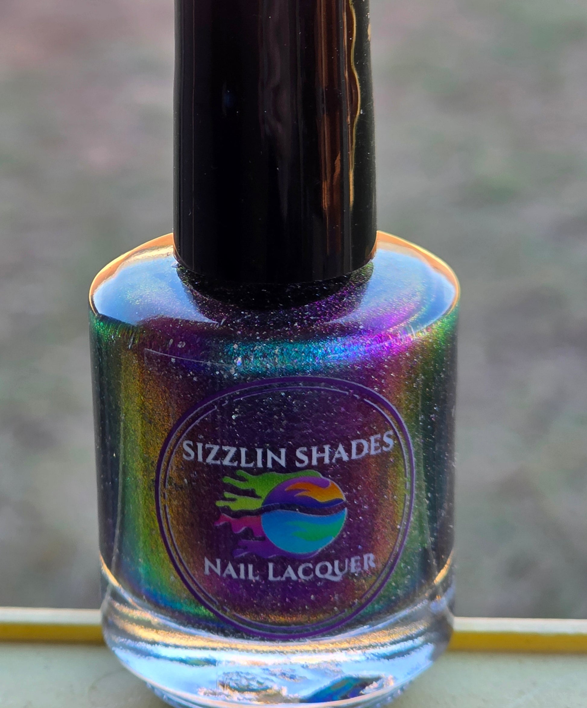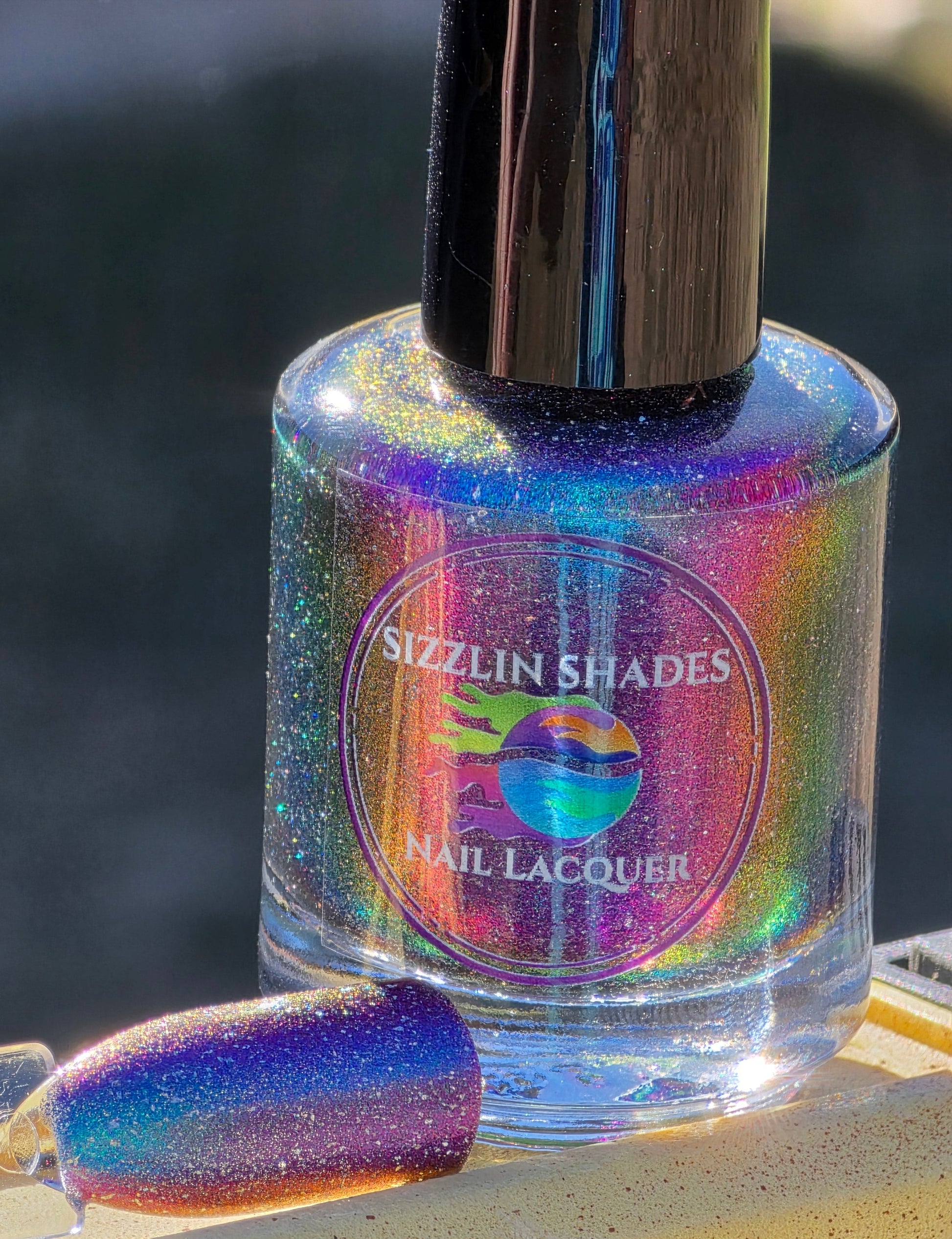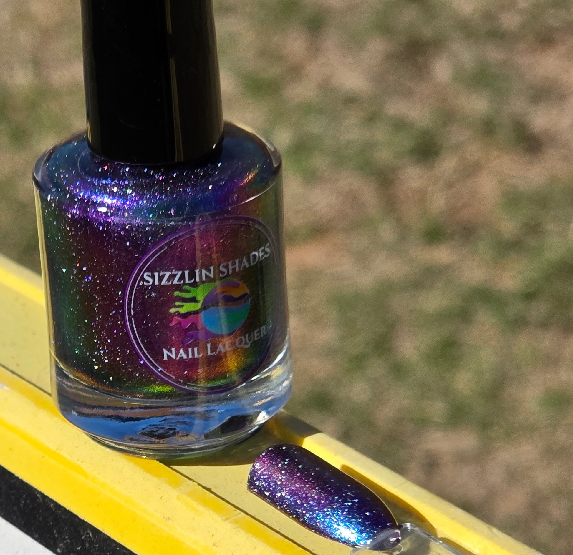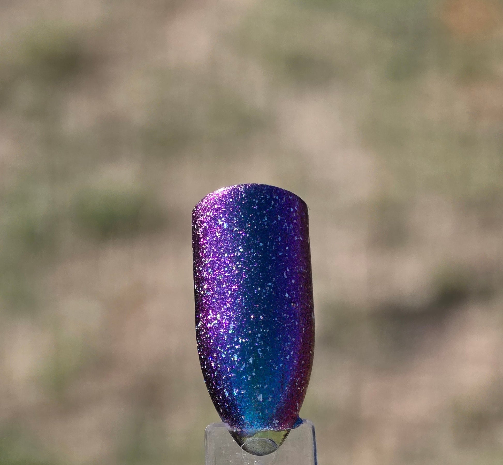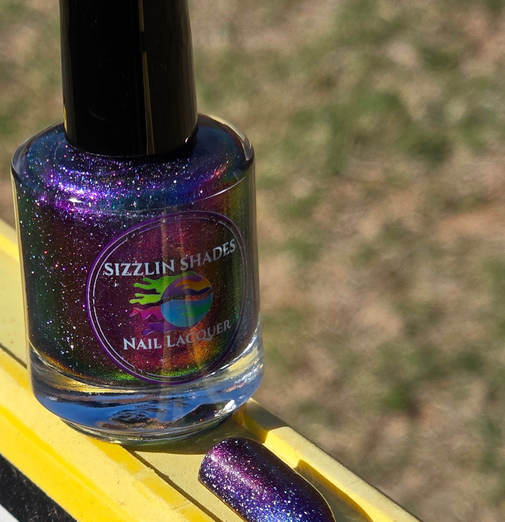Beyond the Realm is a dark blue multichrome that shifts purple/pink/orange/green/teal, and has holo flakes throughout. The color shifts in this polish is amazing.