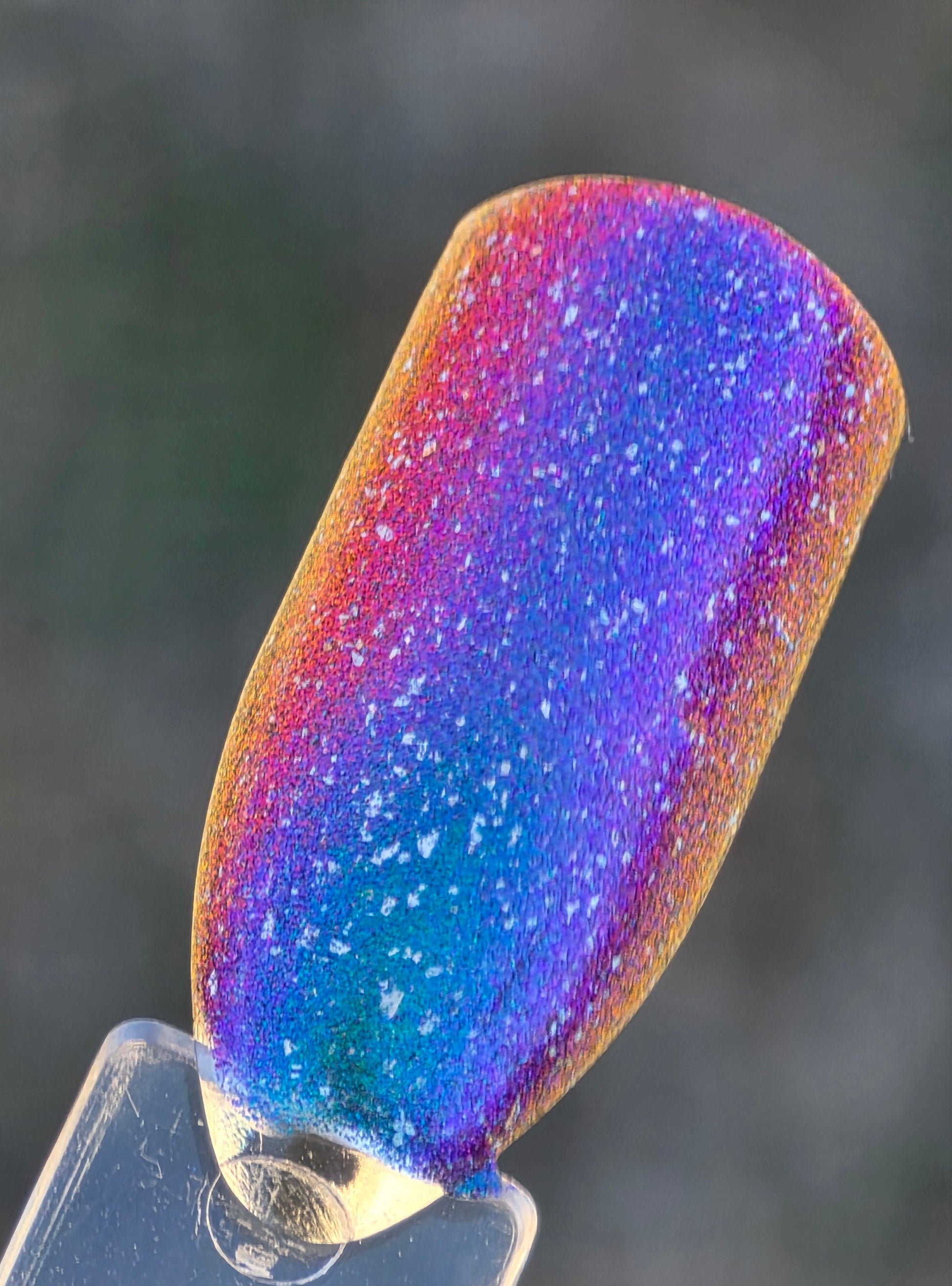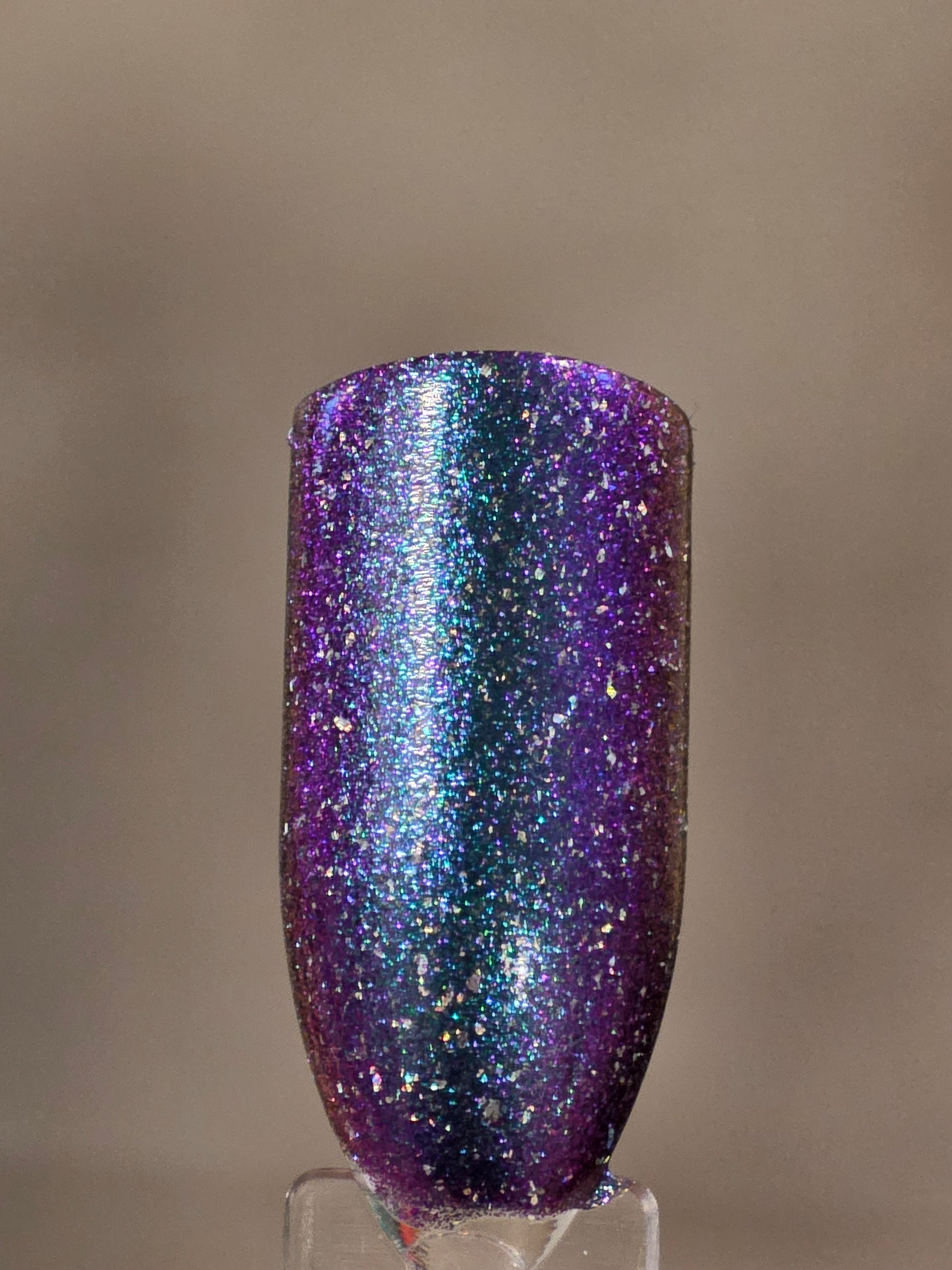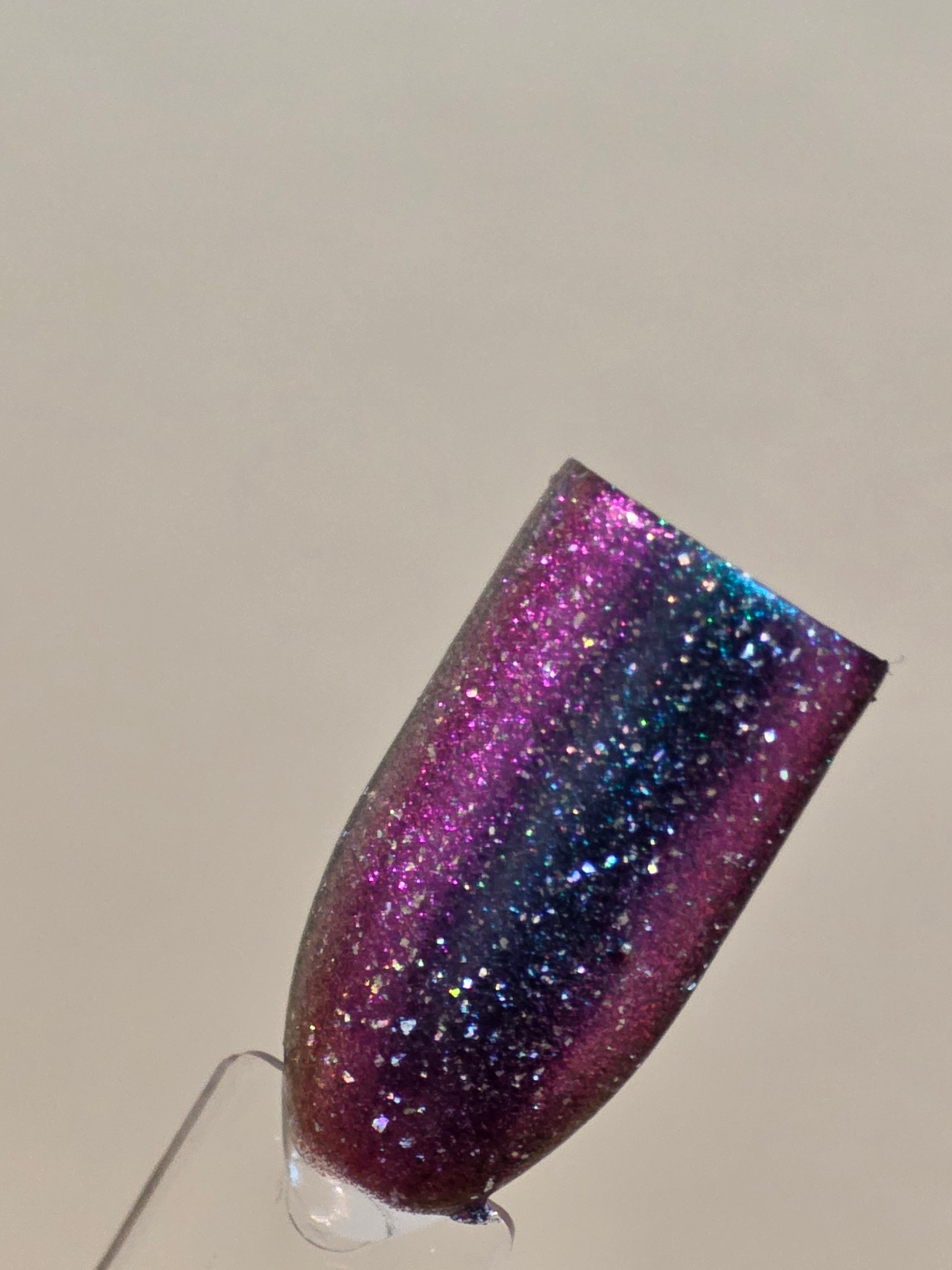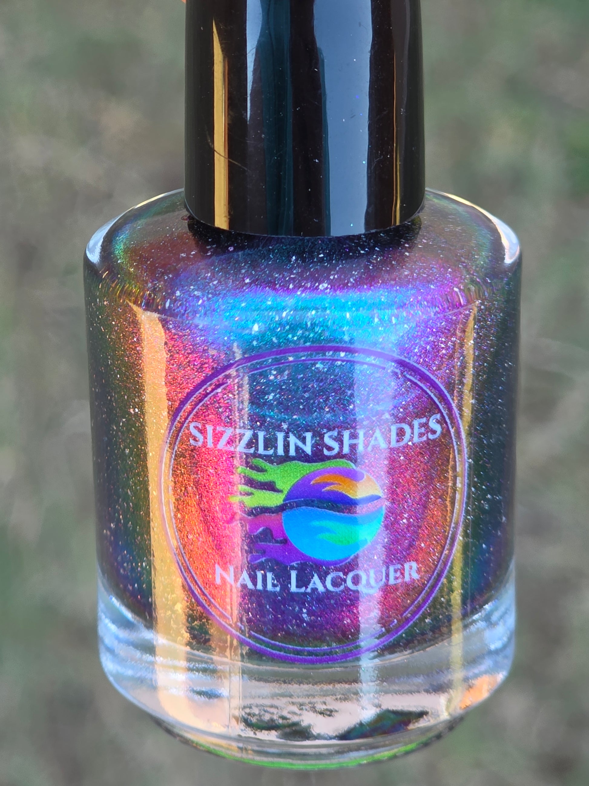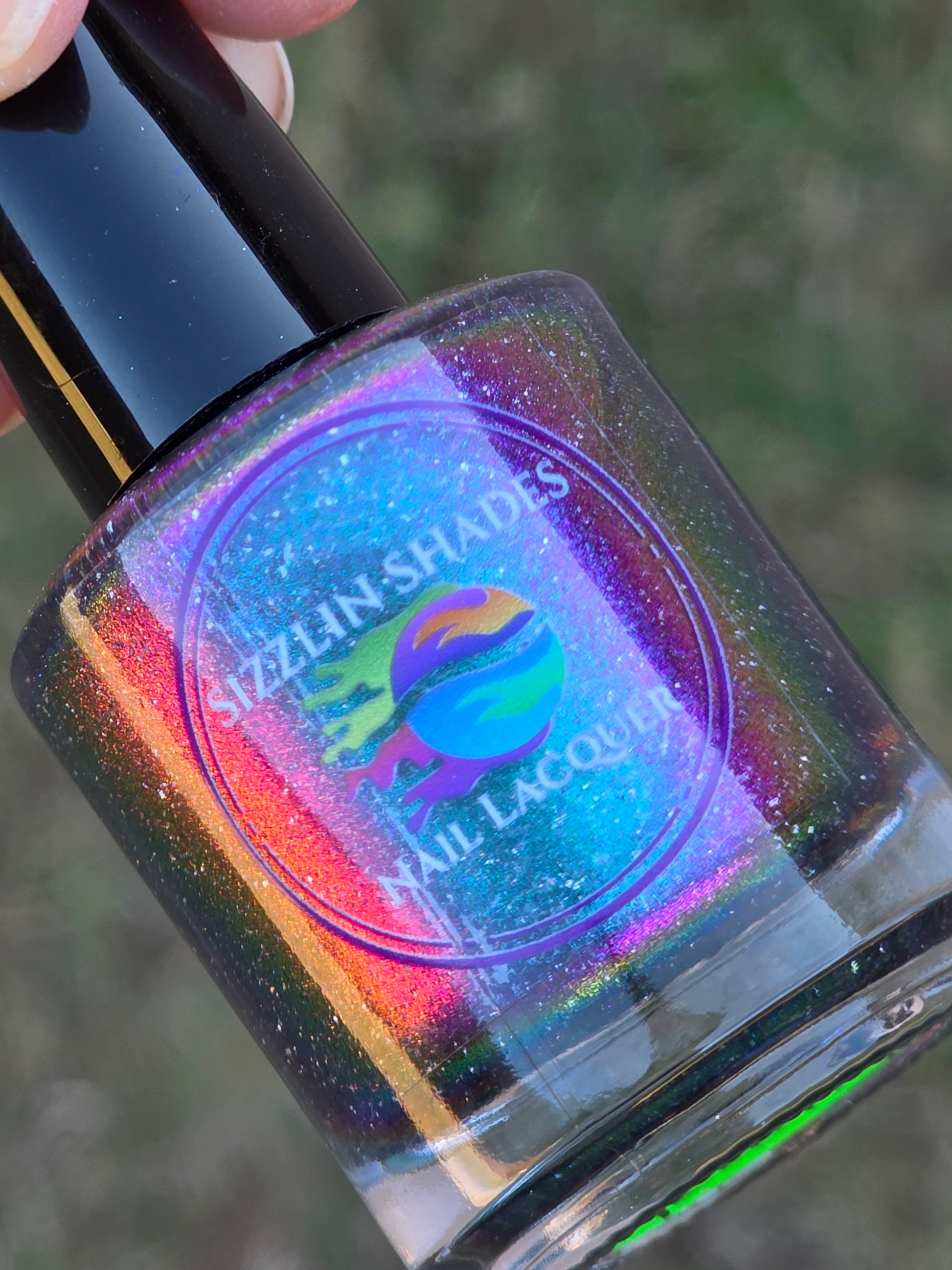 Beyond the Realm is a dark blue multichrome that shifts purple/pink/orange/green/teal, and has holo flakes throughout. The color shifts in this polish is amazing.