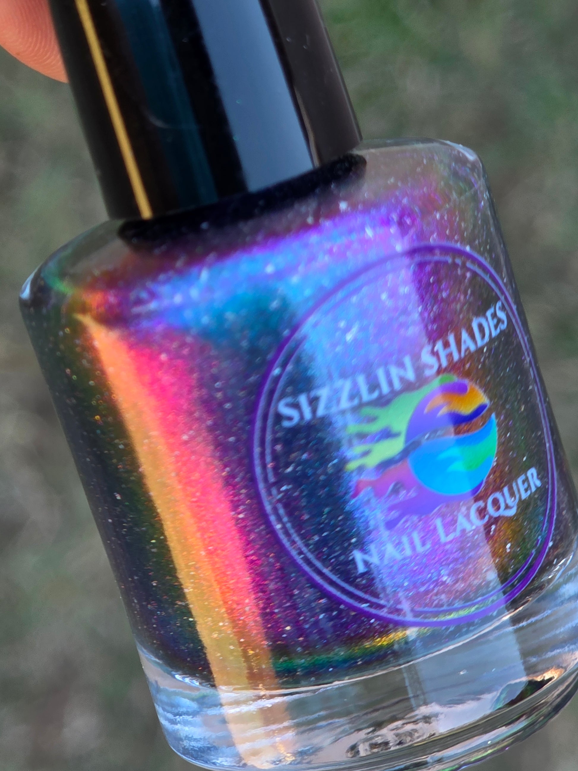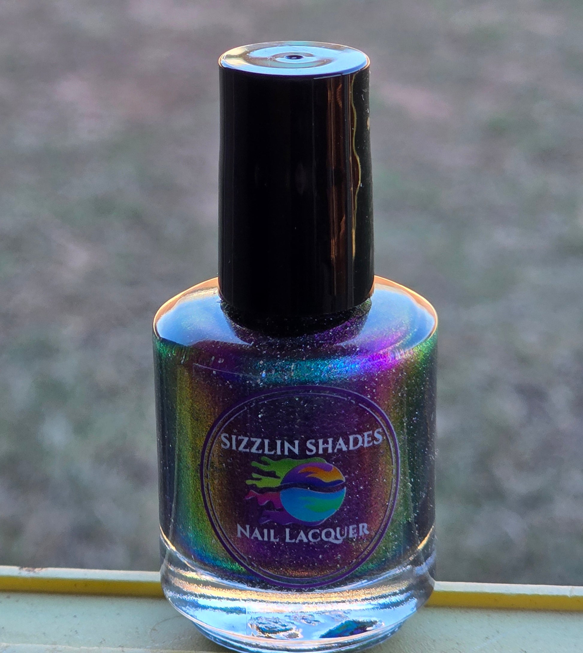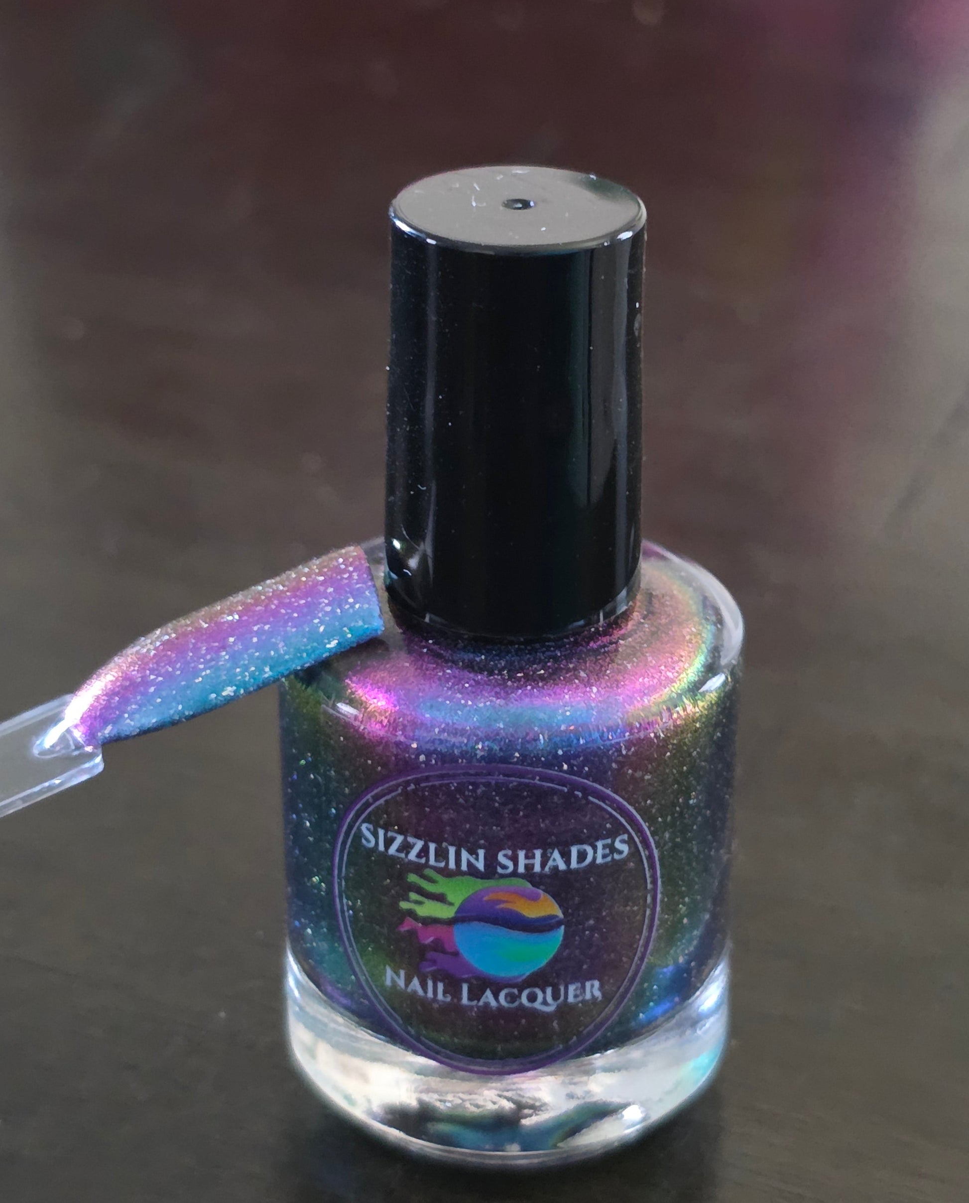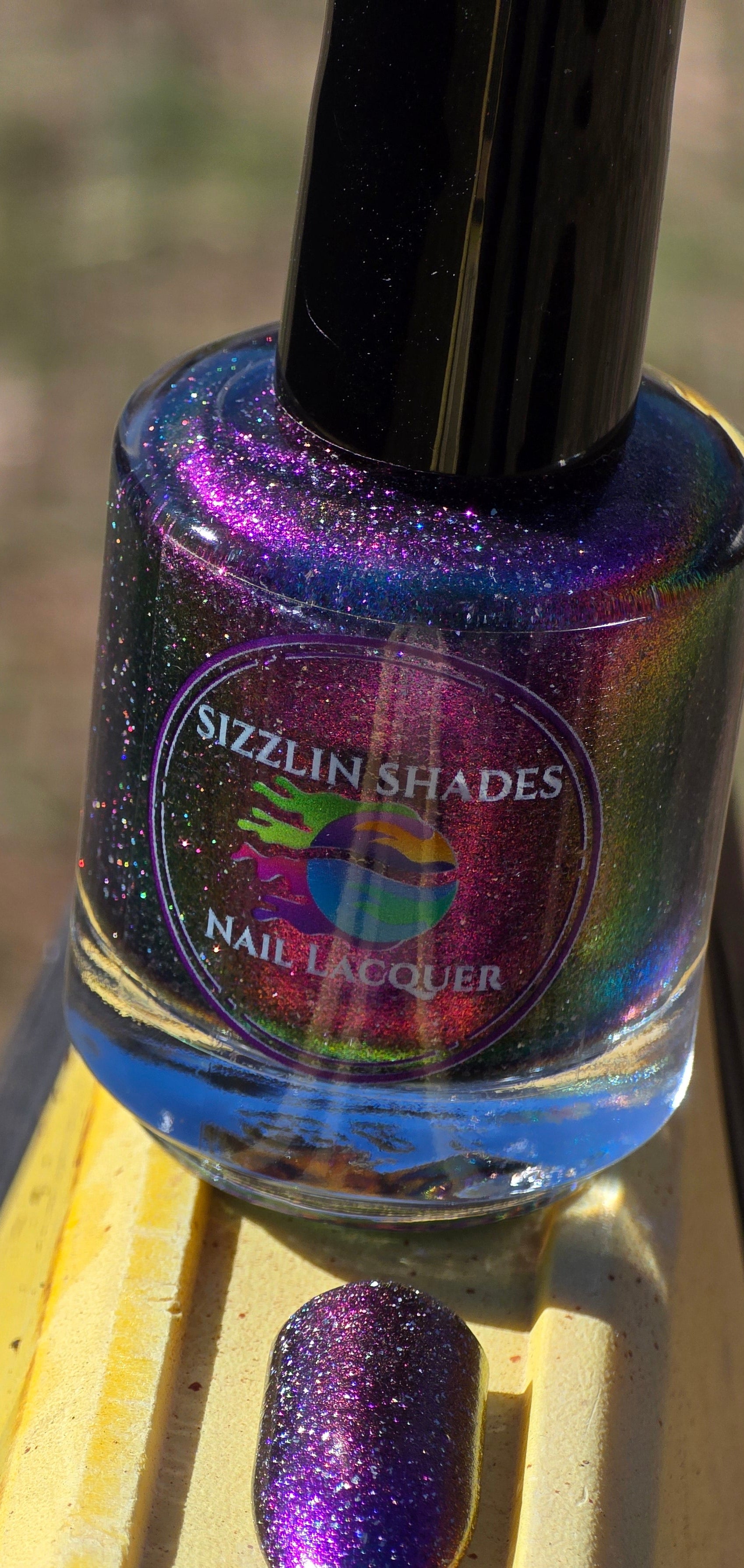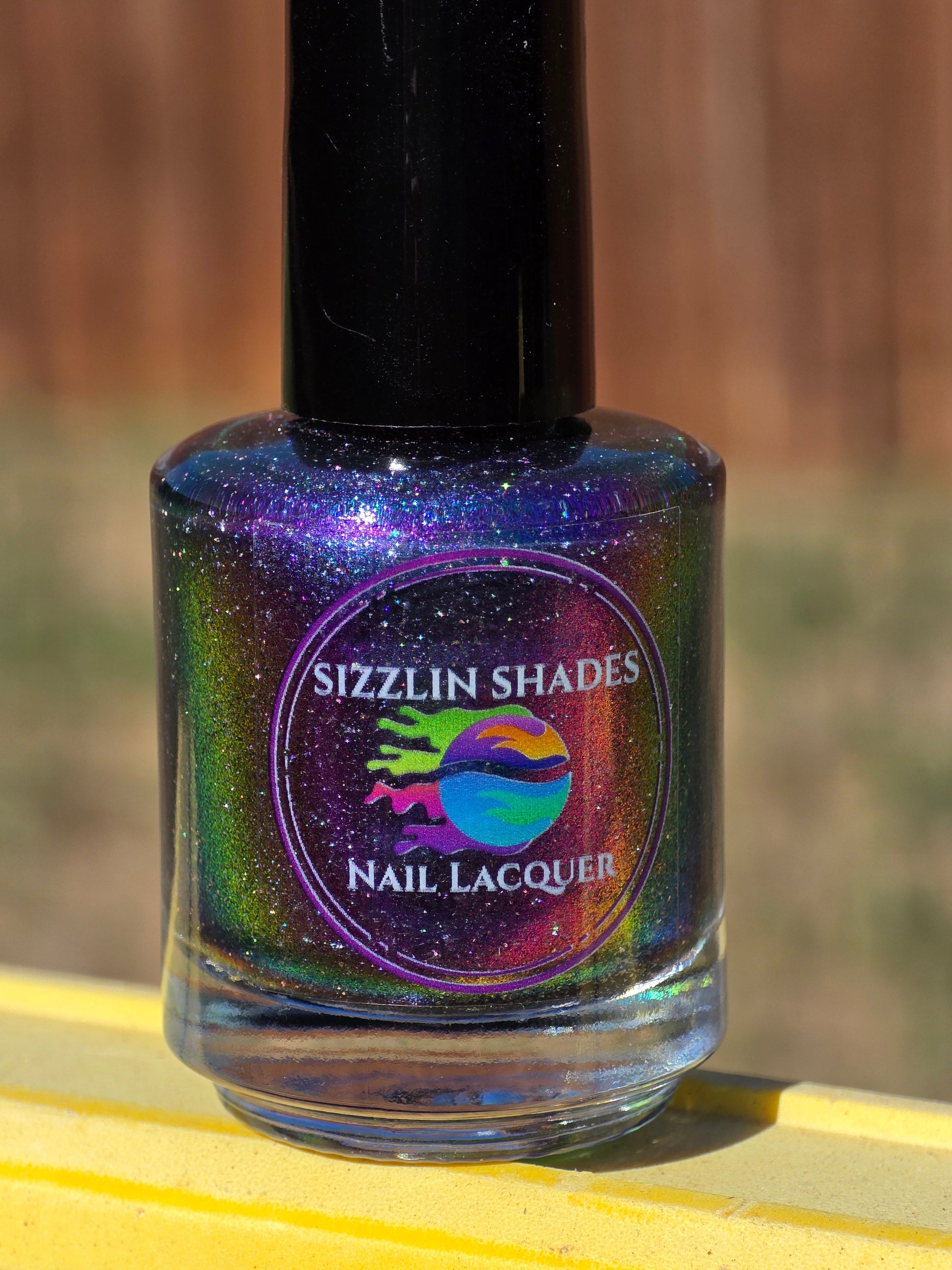 Beyond the Realm is a dark blue multichrome that shifts purple/pink/orange/green/teal, and has holo flakes throughout. The color shifts in this polish is amazing.