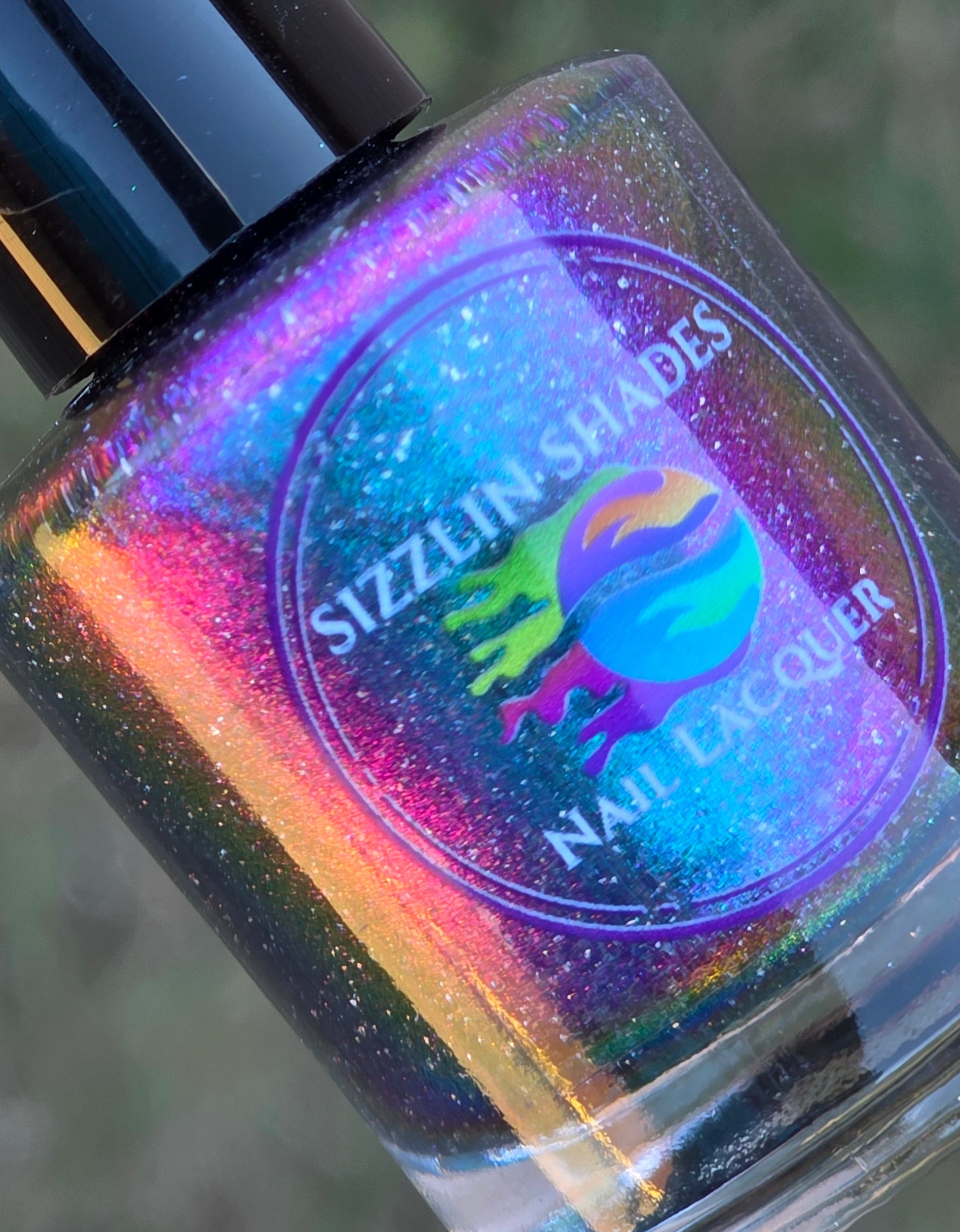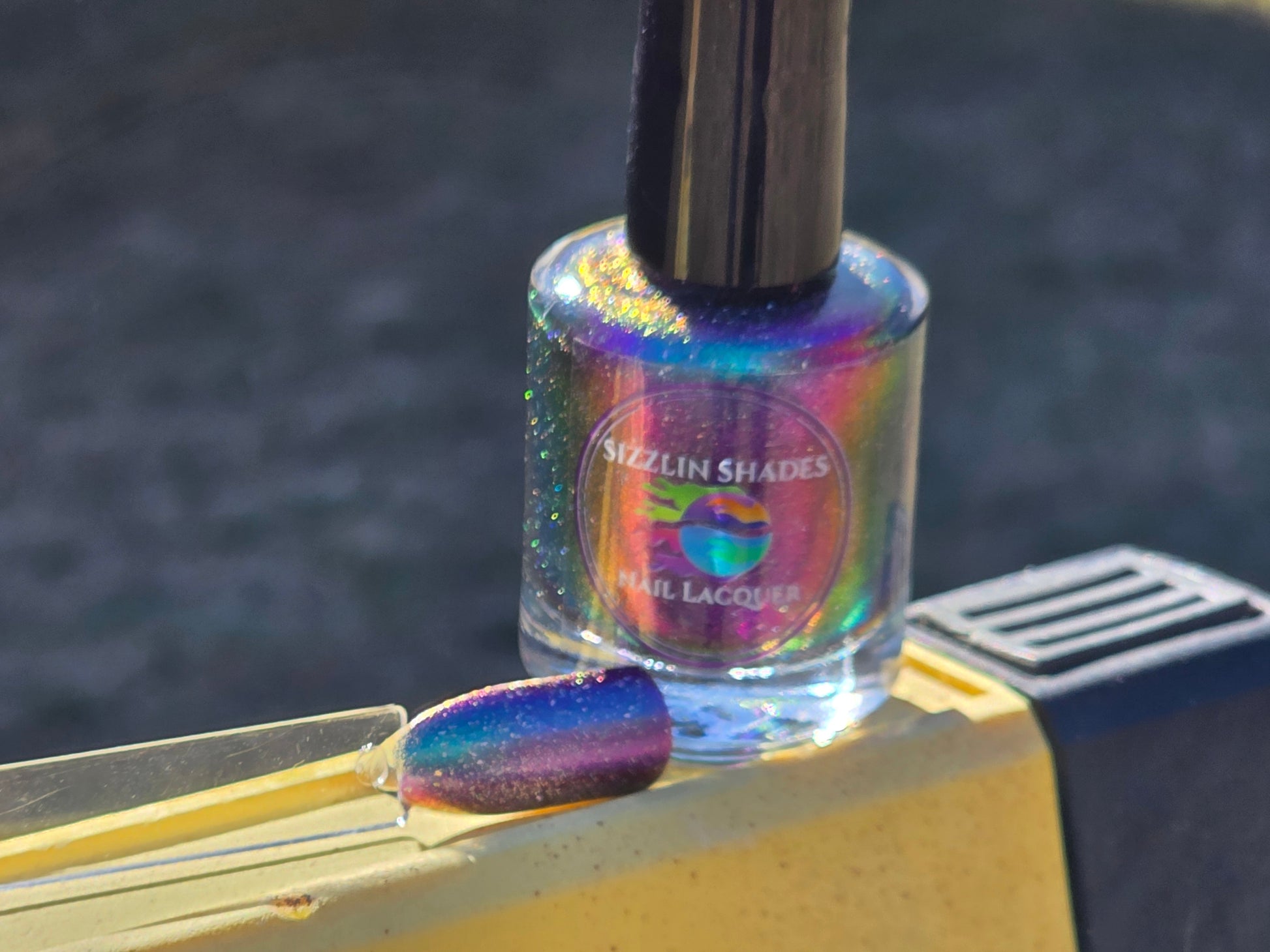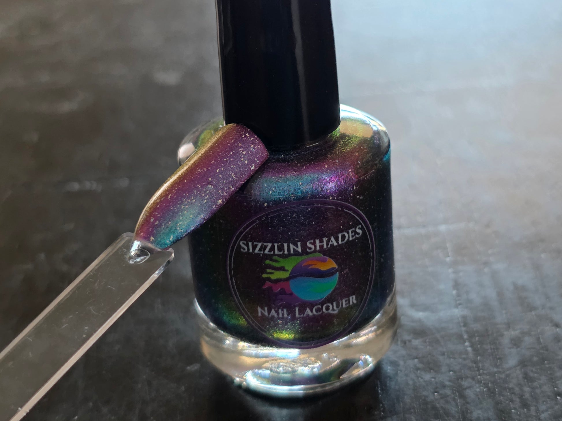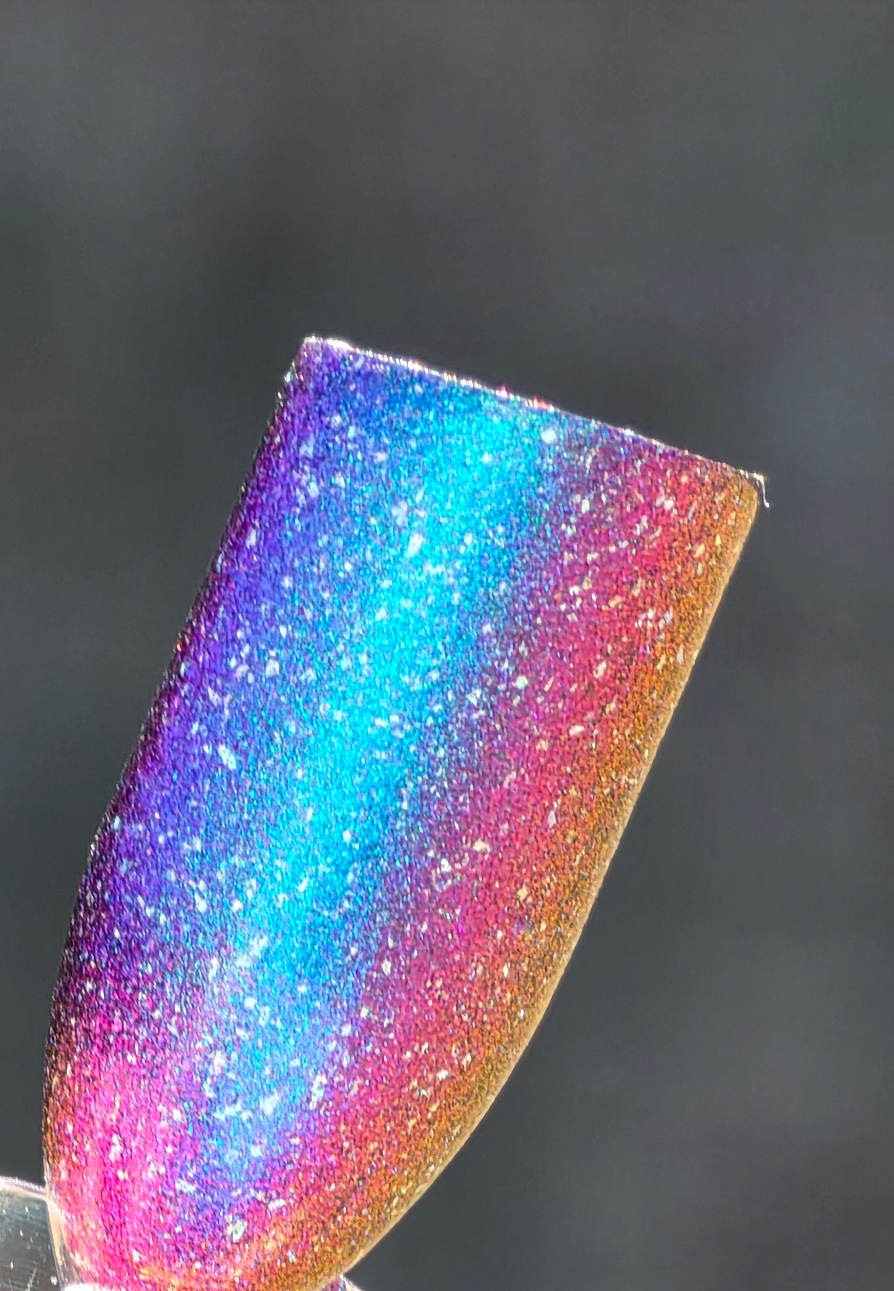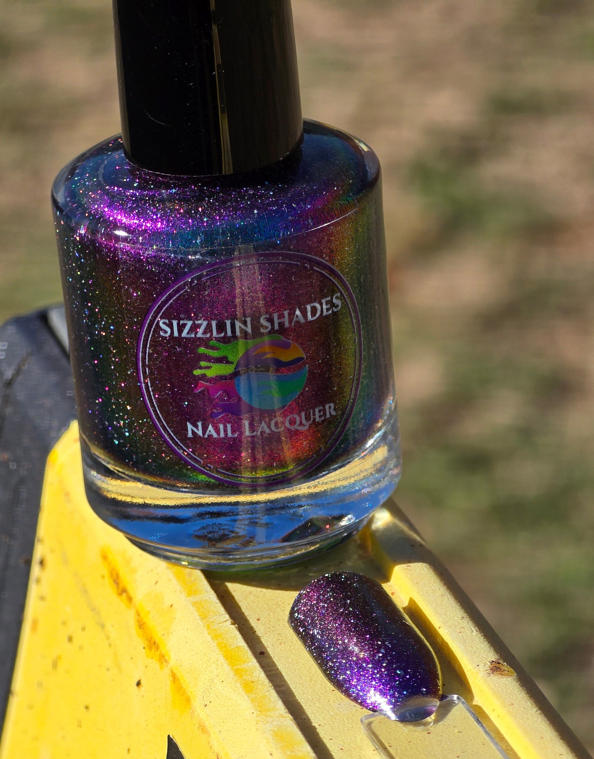 Beyond the Realm is a dark blue multichrome that shifts purple/pink/orange/green/teal, and has holo flakes throughout. The color shifts in this polish is amazing.