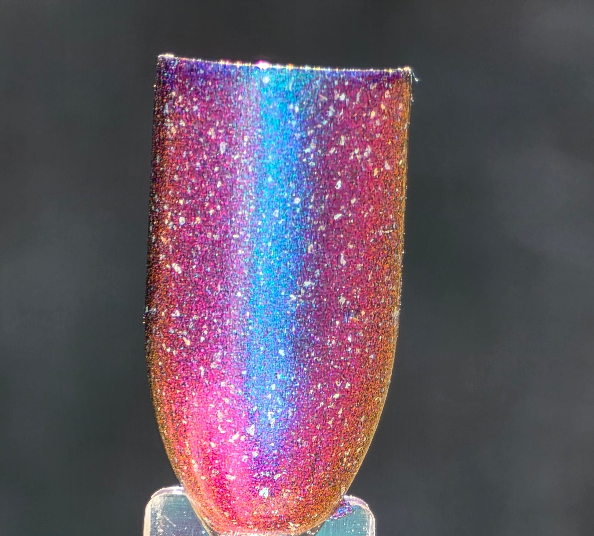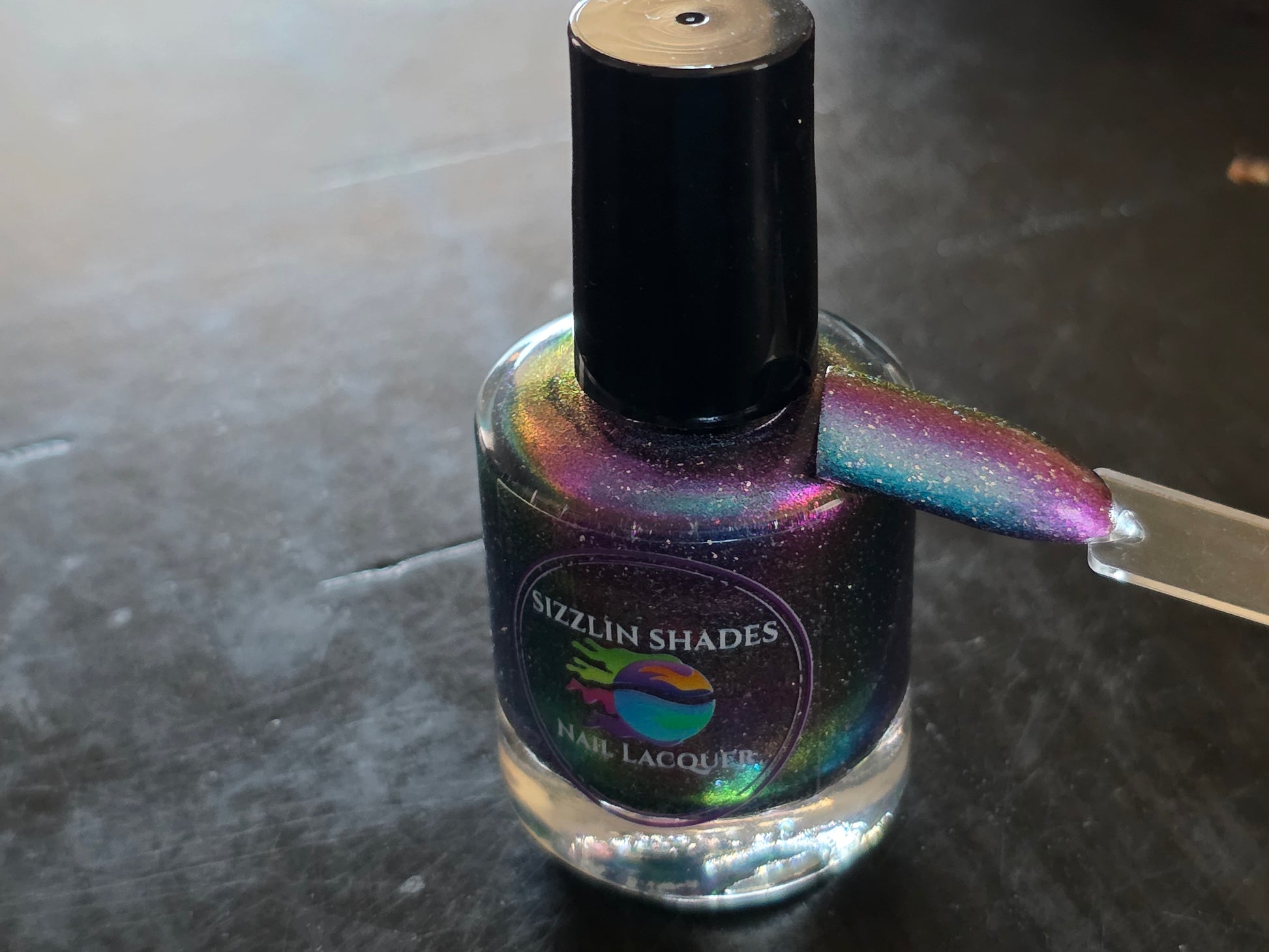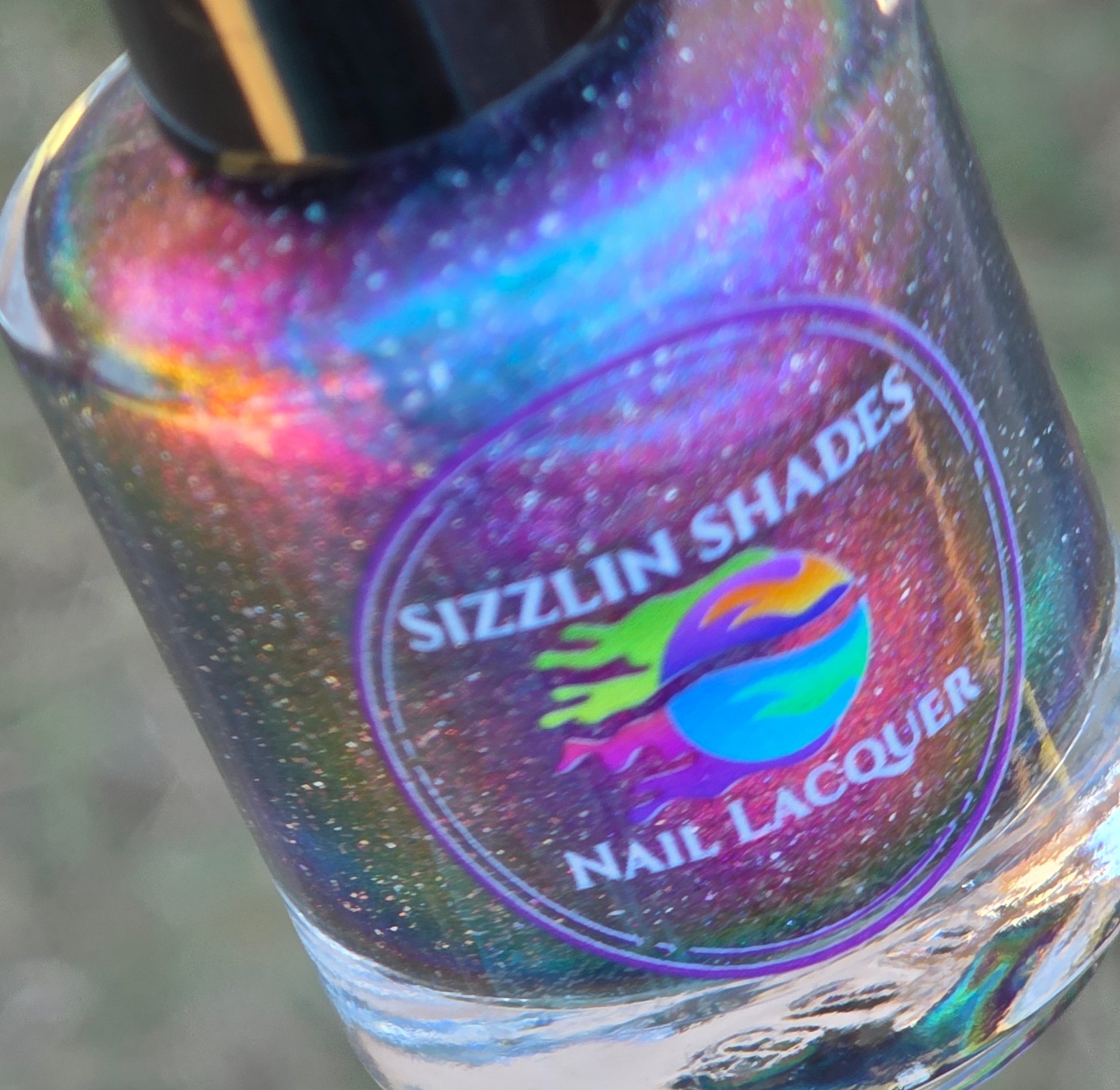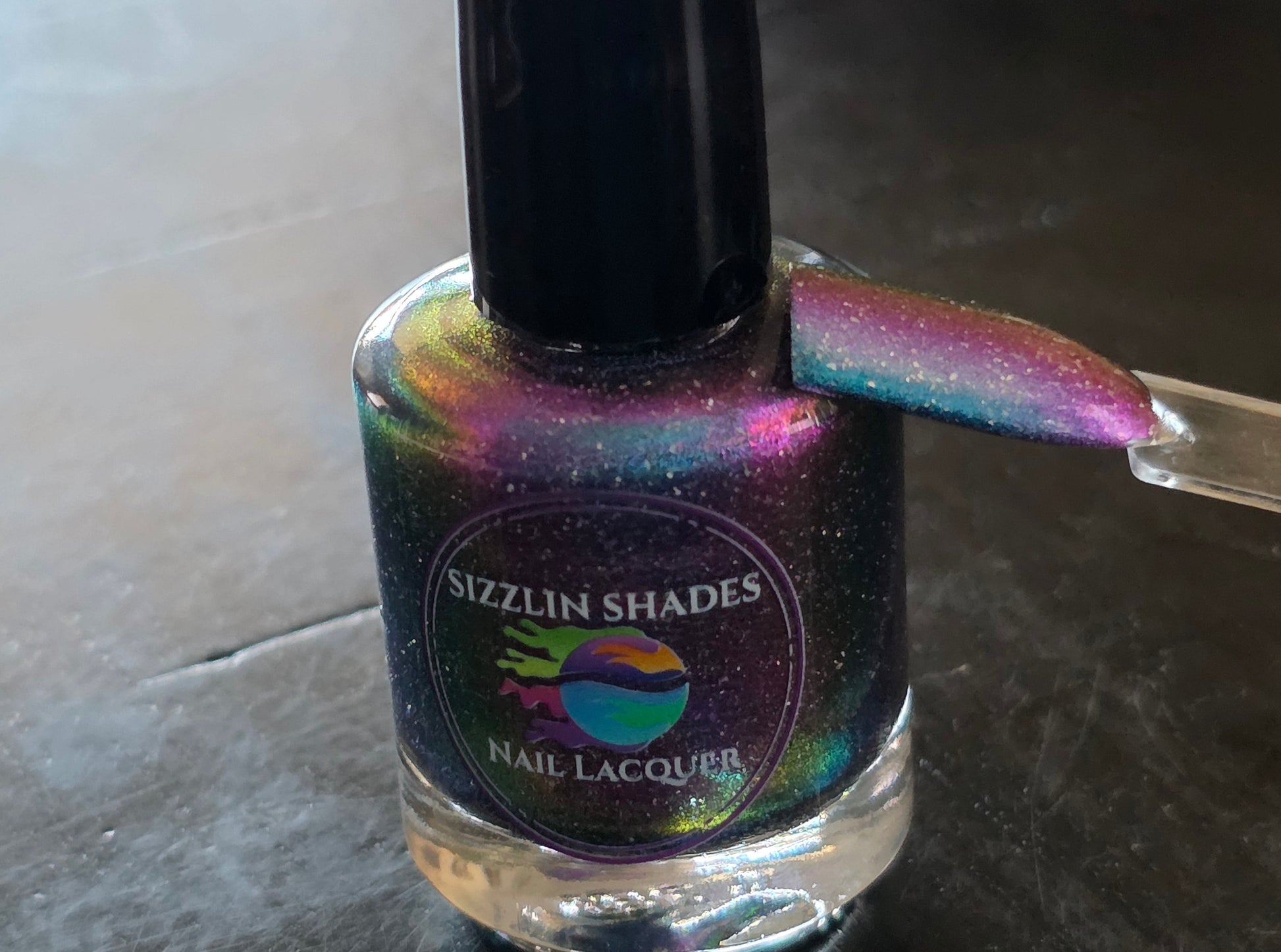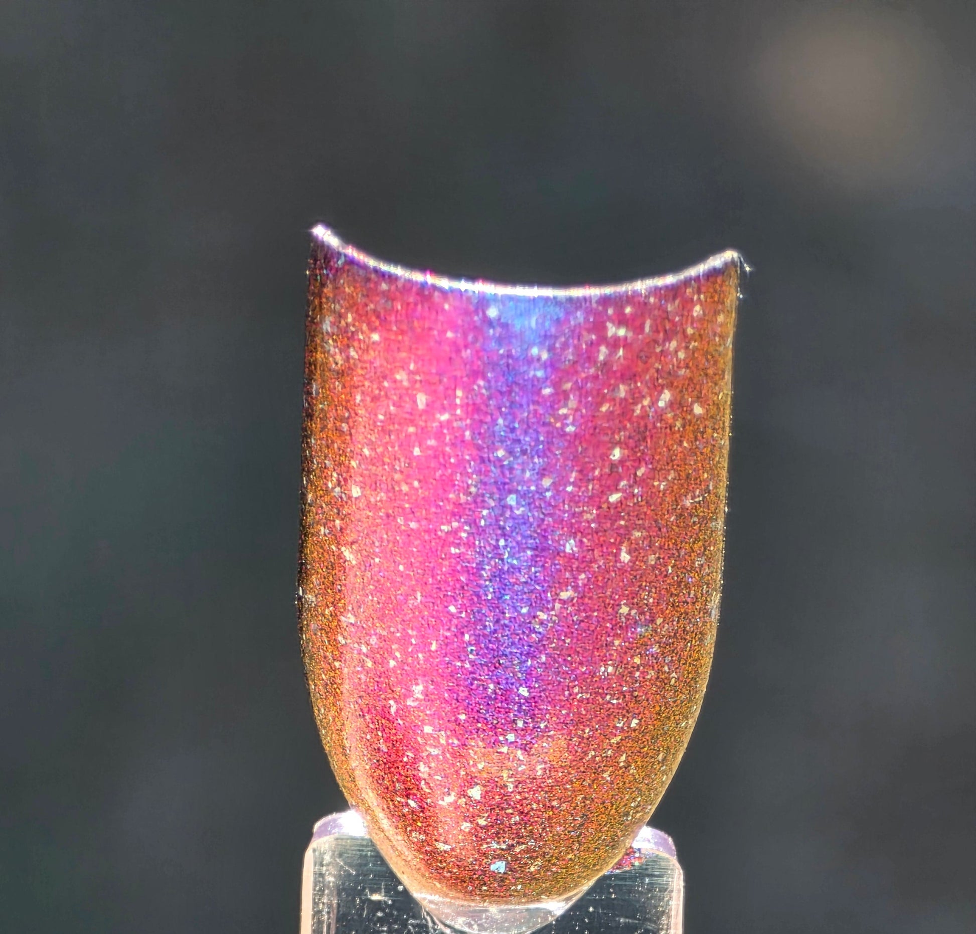Beyond the Realm is a dark blue multichrome that shifts purple/pink/orange/green/teal, and has holo flakes throughout. The color shifts in this polish is amazing.