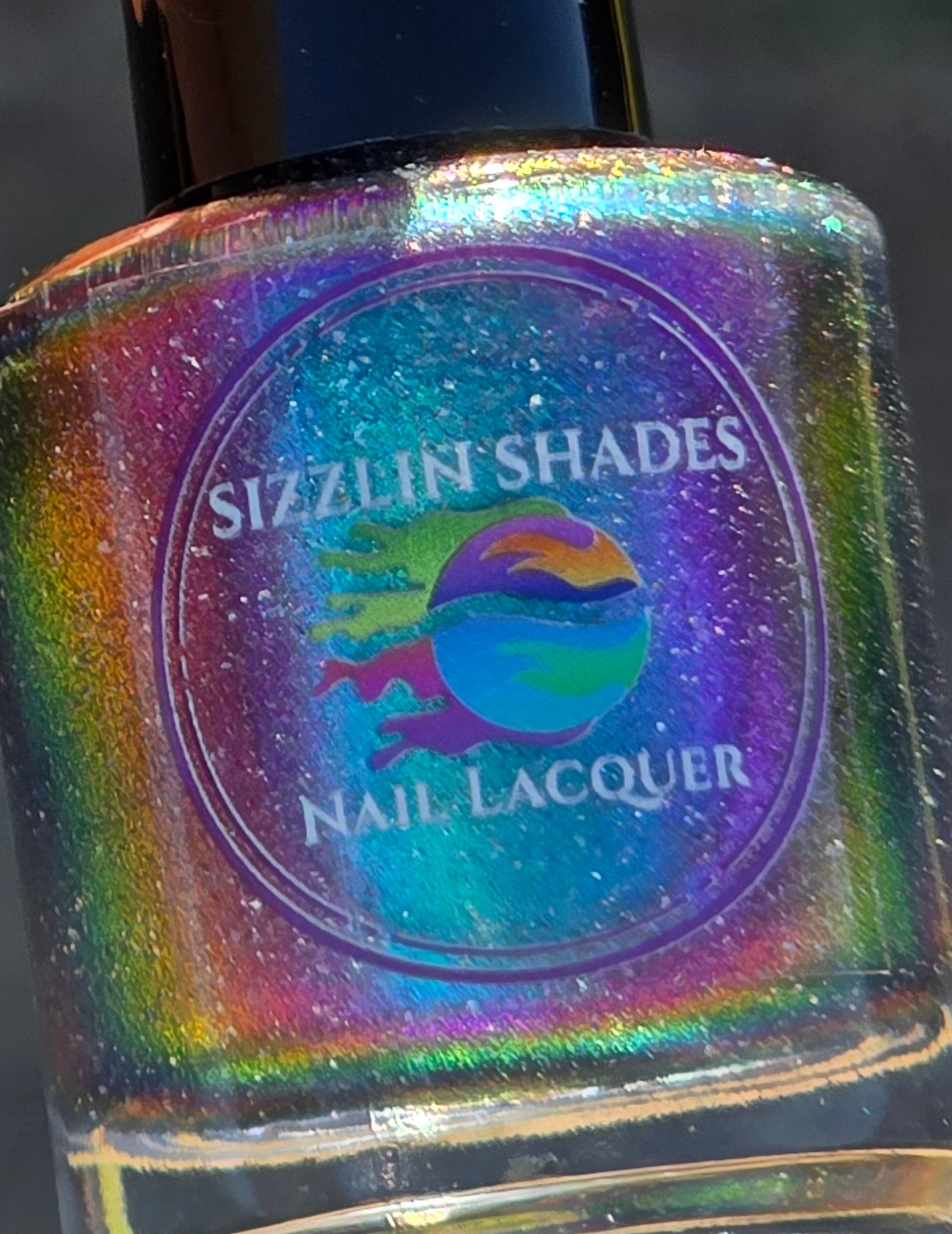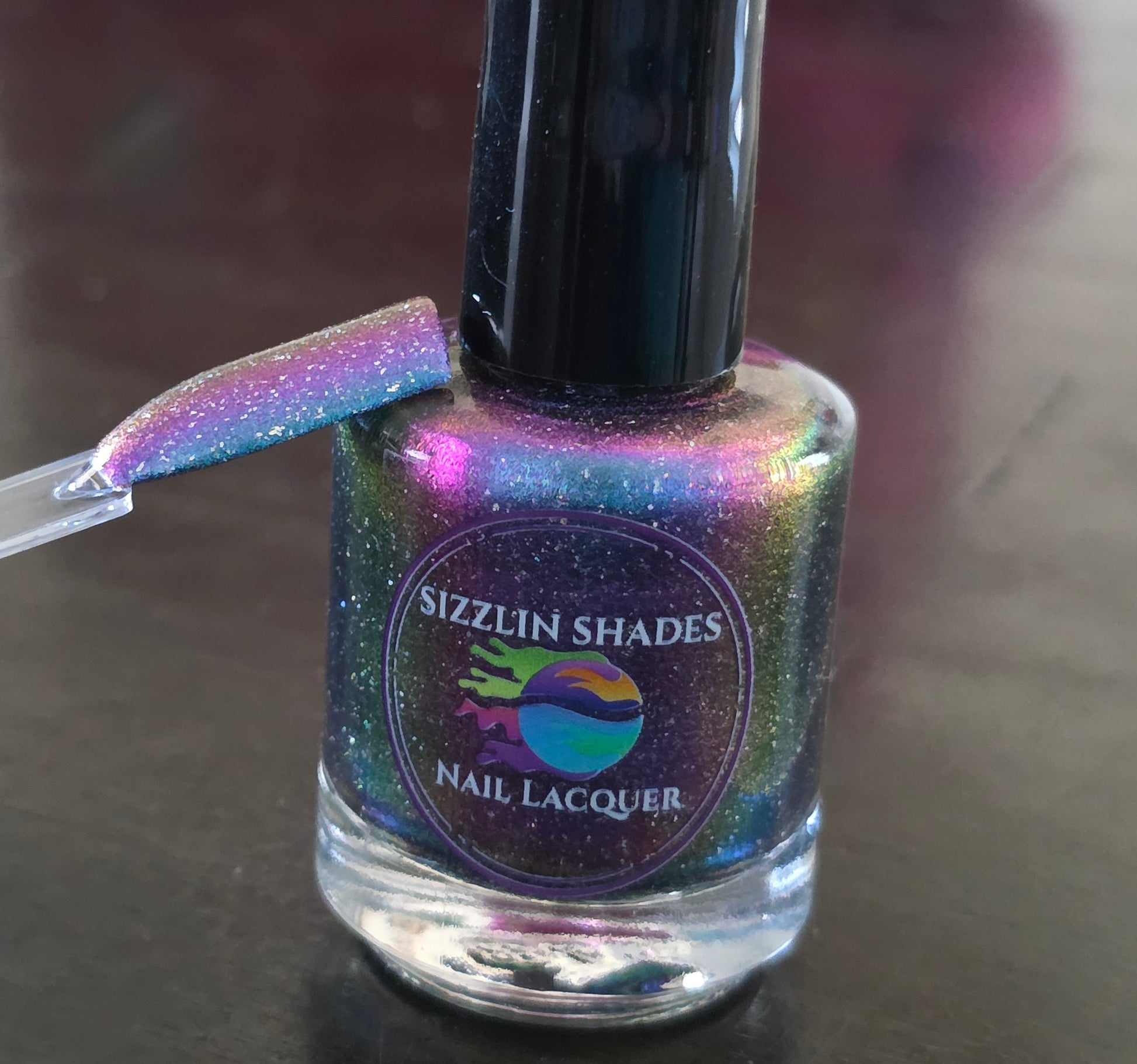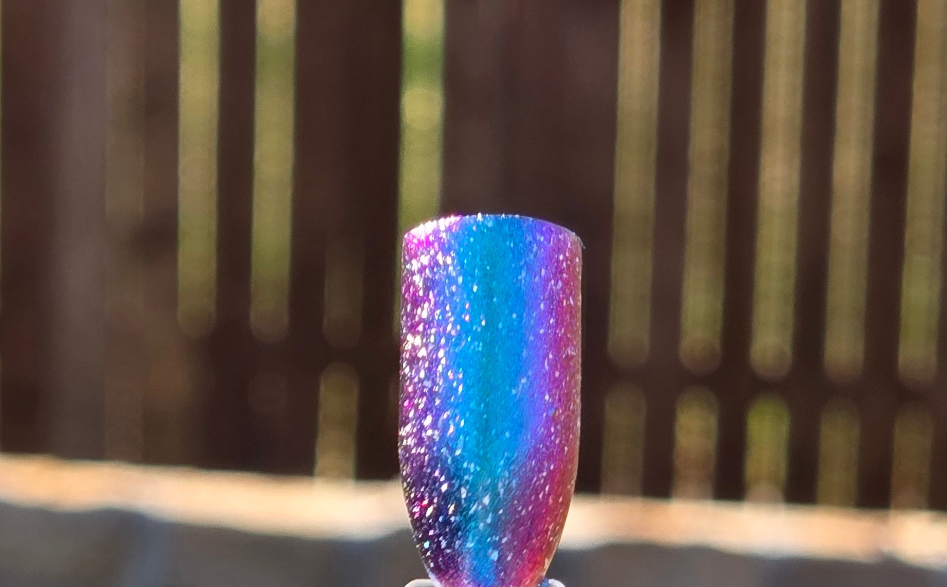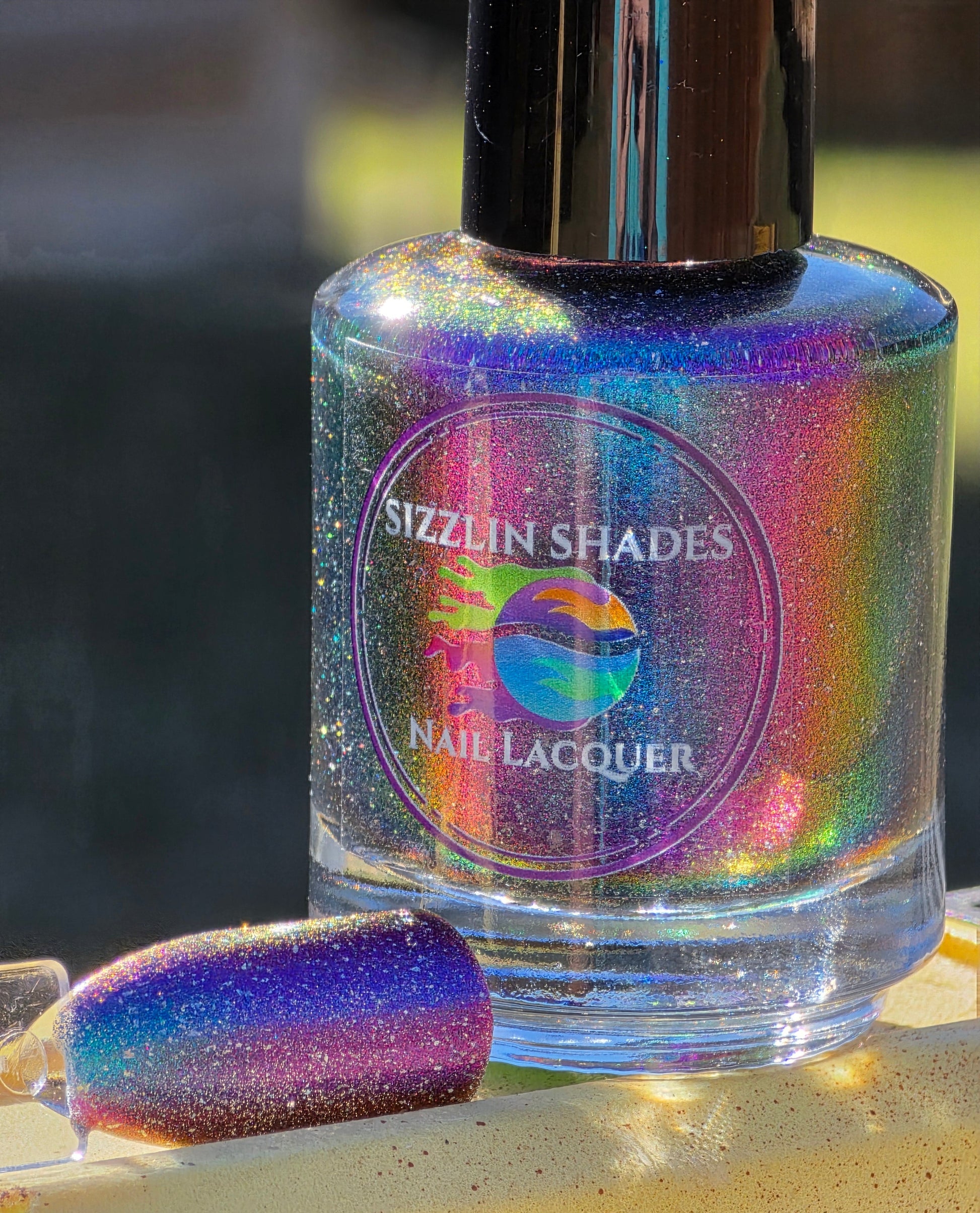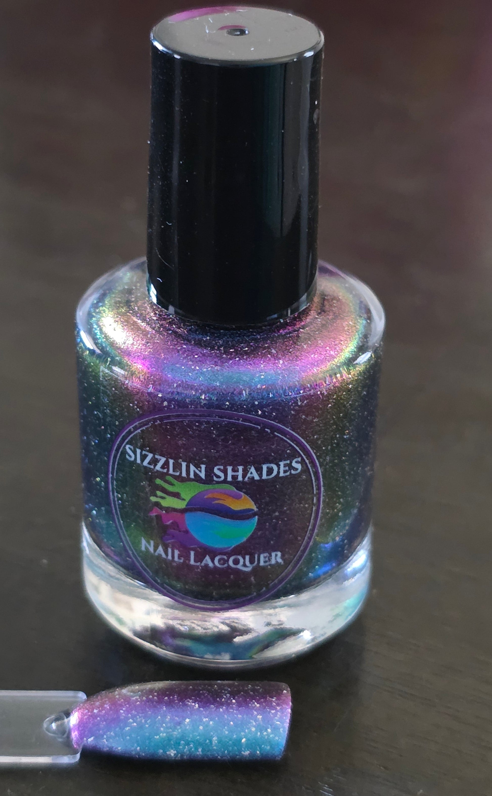 Beyond the Realm is a dark blue multichrome that shifts purple/pink/orange/green/teal, and has holo flakes throughout. The color shifts in this polish is amazing.