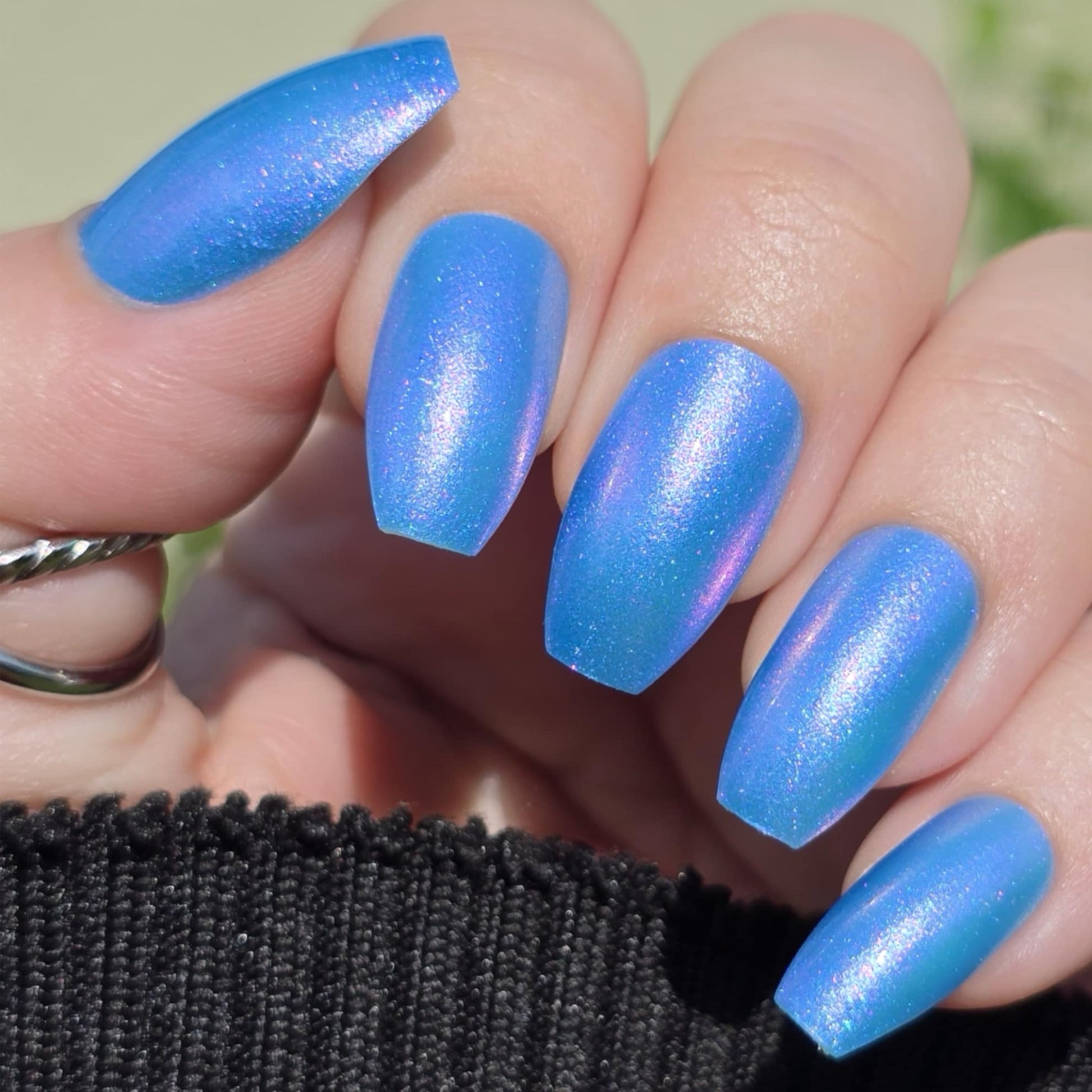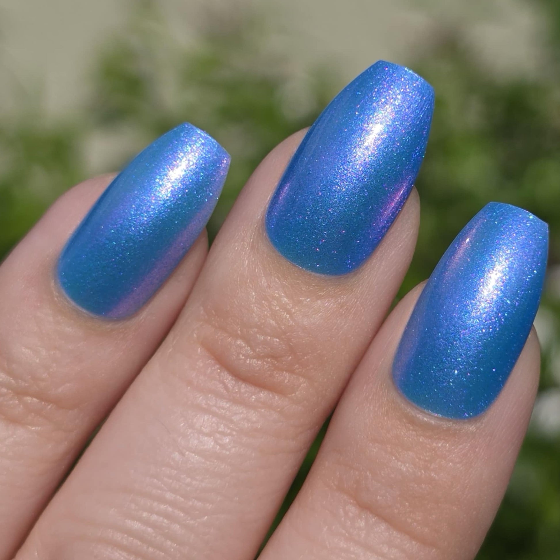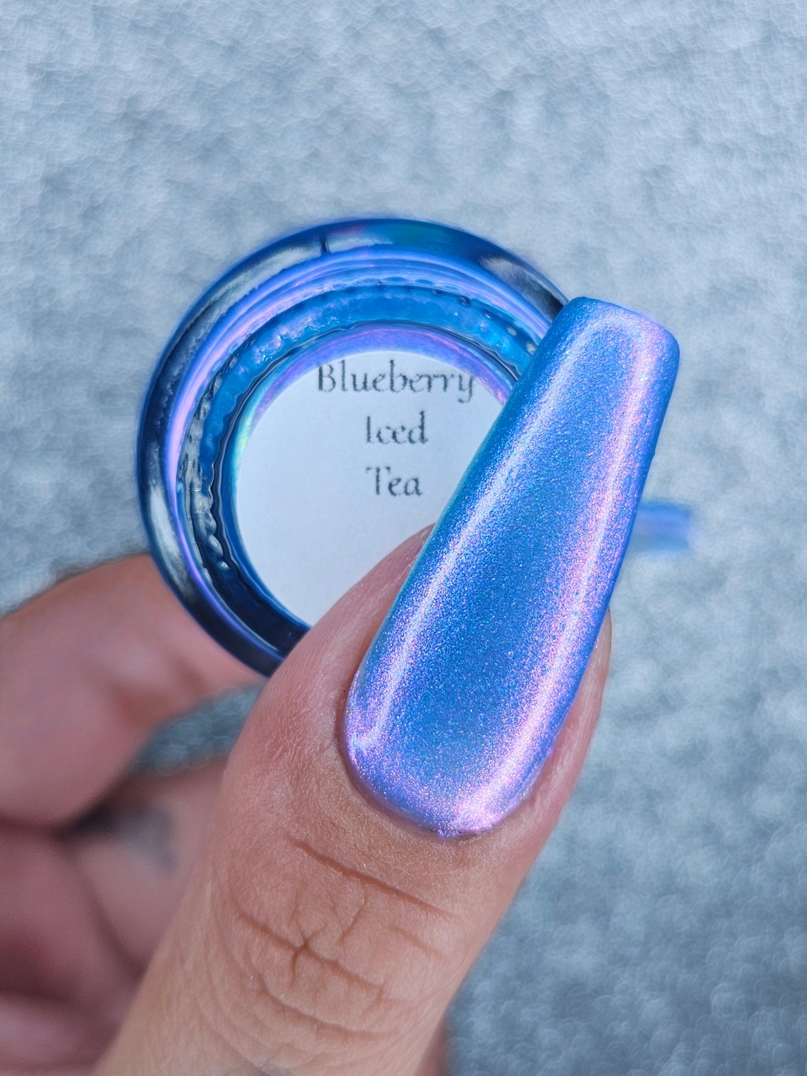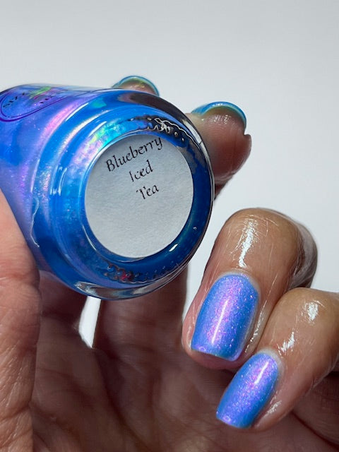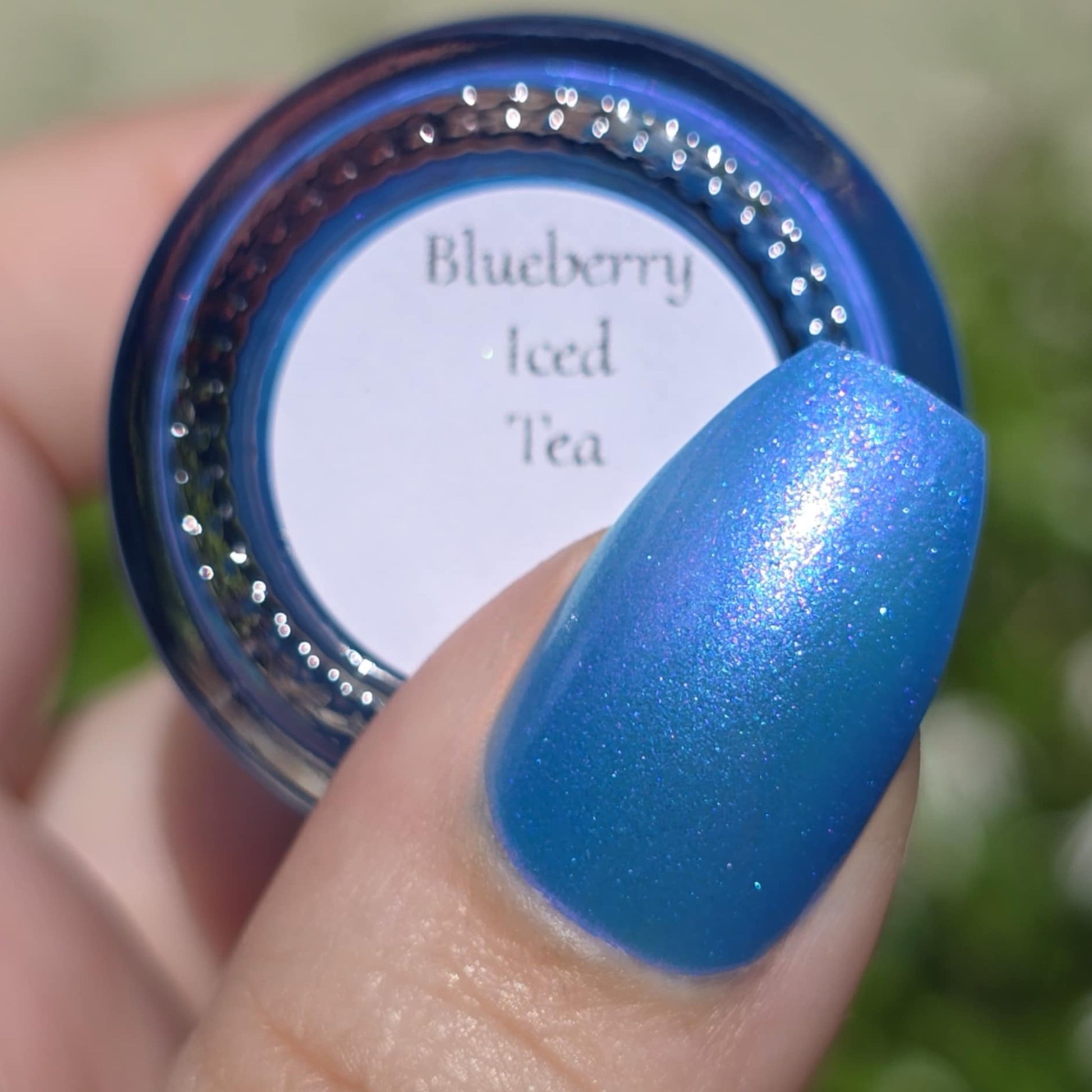 Blueberry Iced Tea is a cornflower blue polish with a purple/pink shimmer