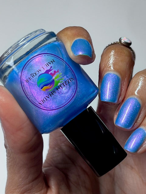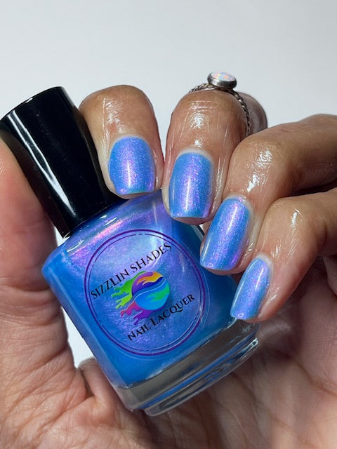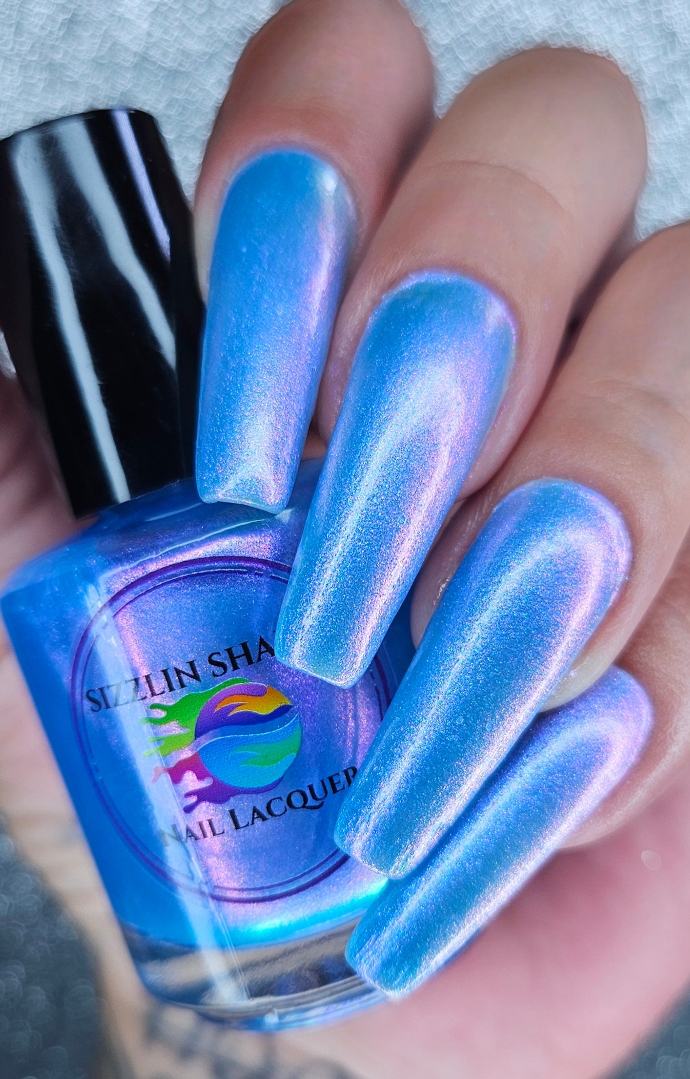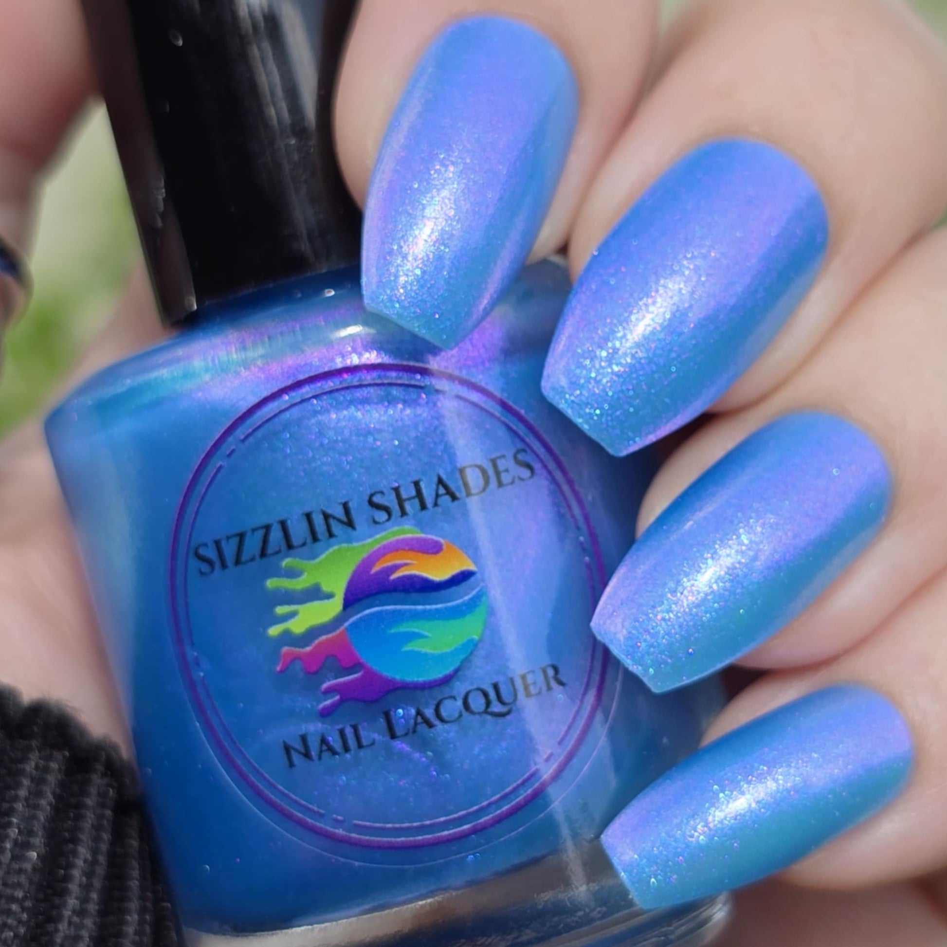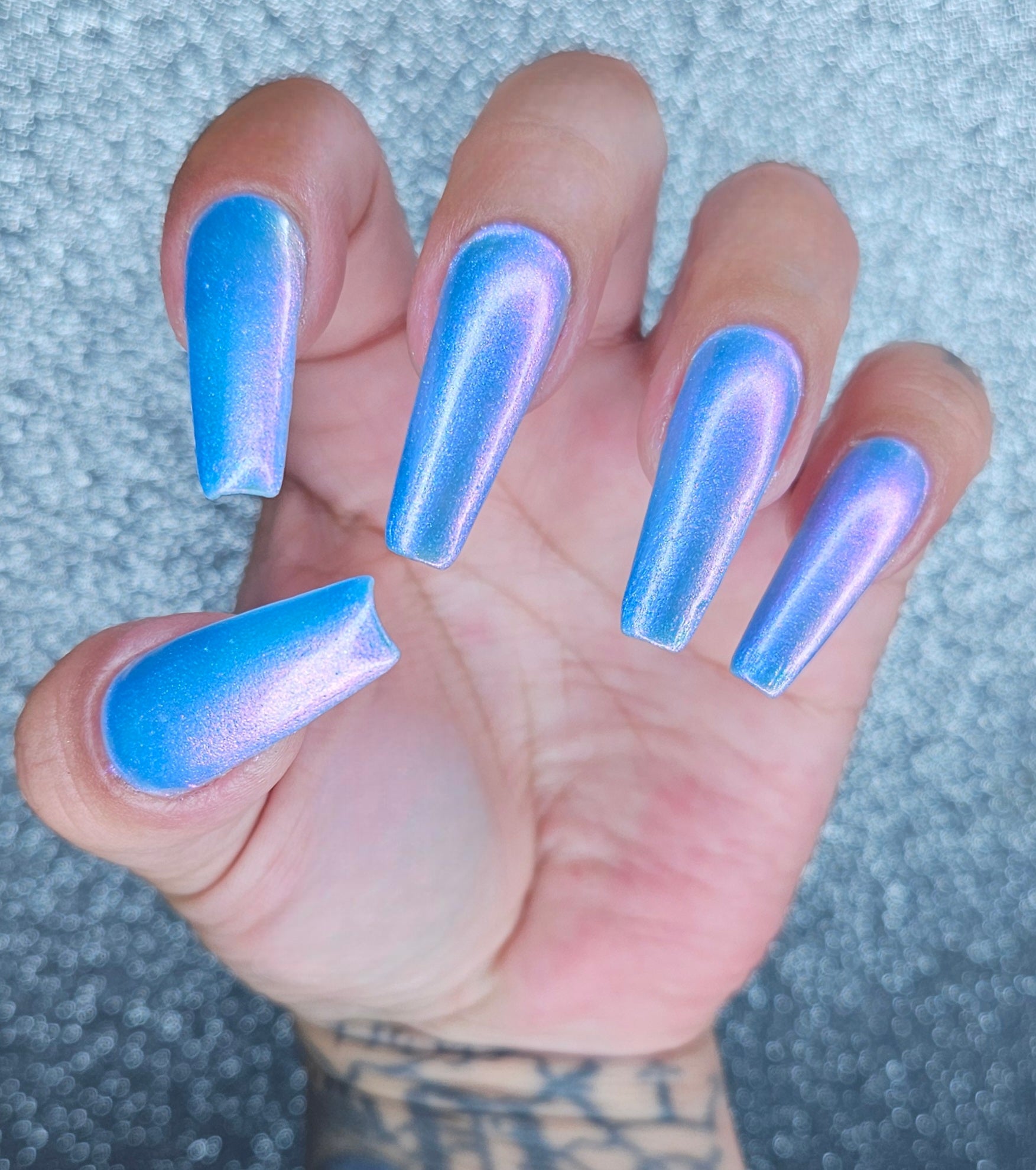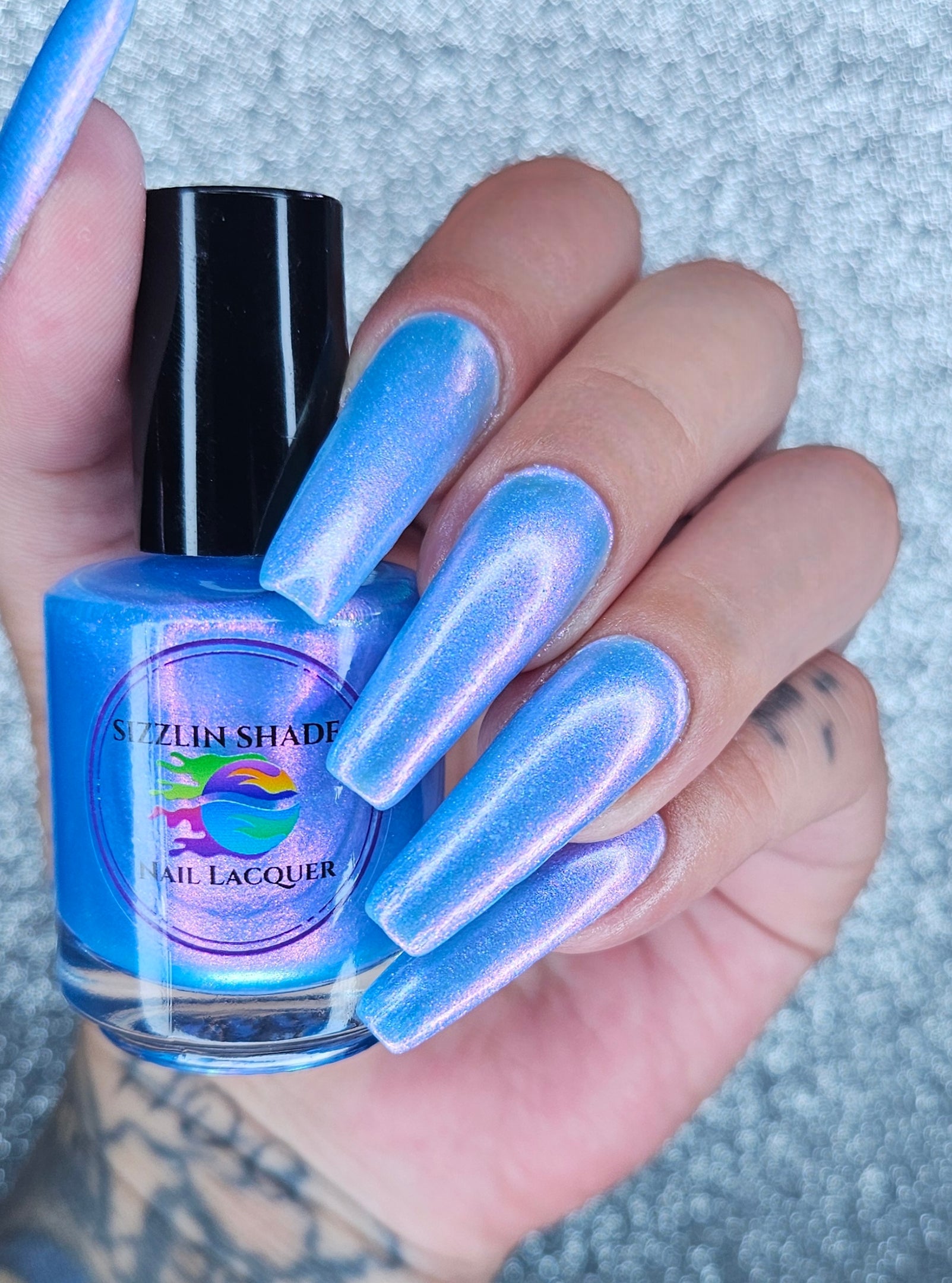 Blueberry Iced Tea is a cornflower blue polish with a purple/pink shimmer