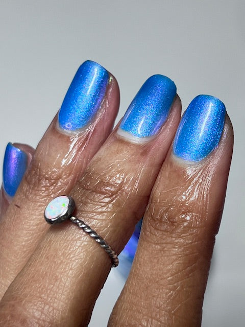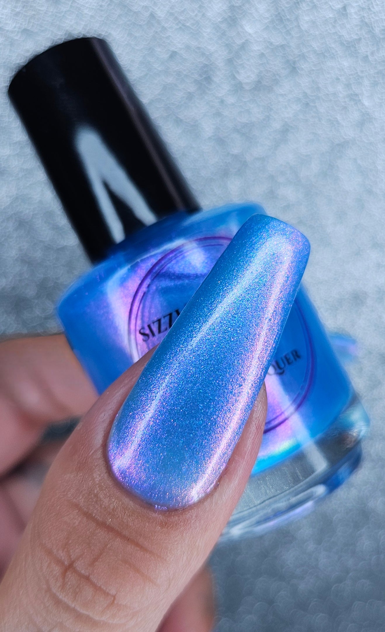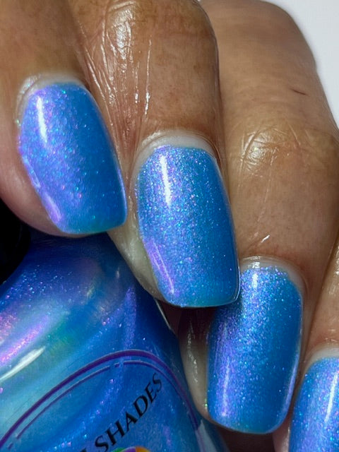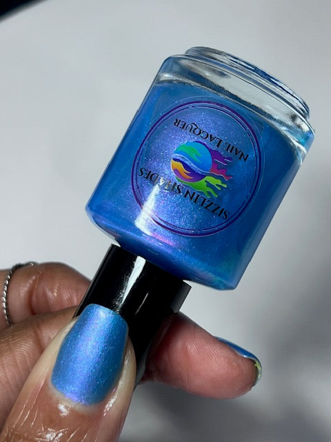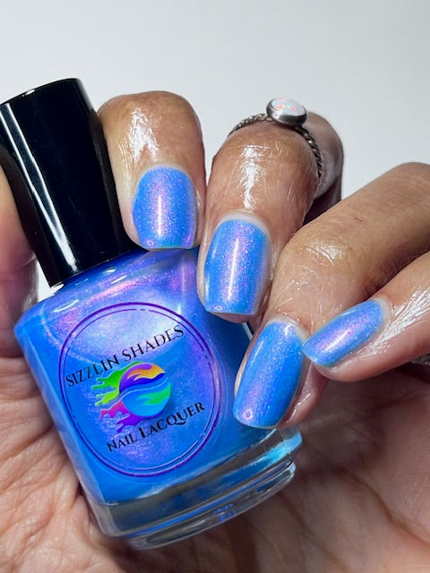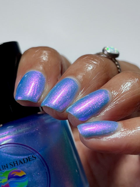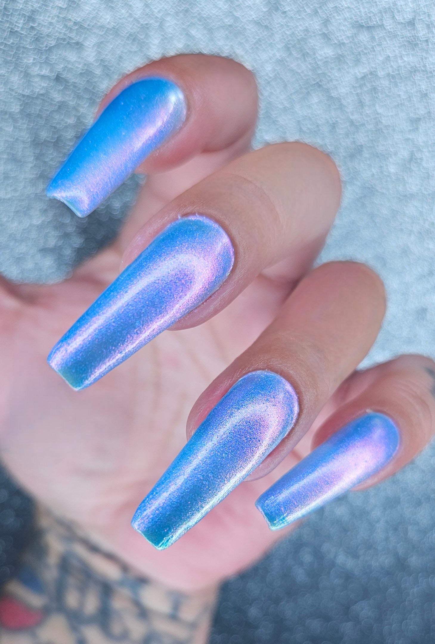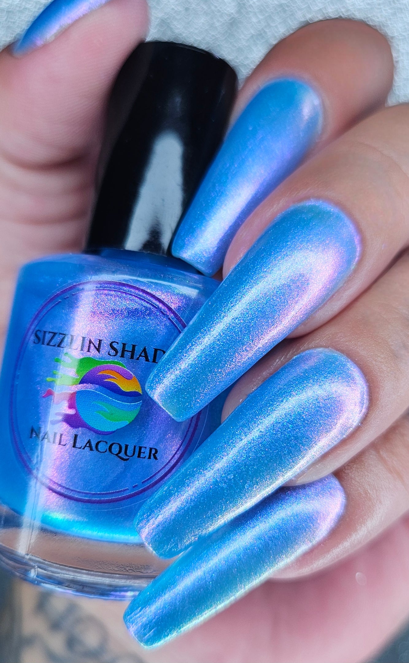 Blueberry Iced Tea is a cornflower blue polish with a purple/pink shimmer