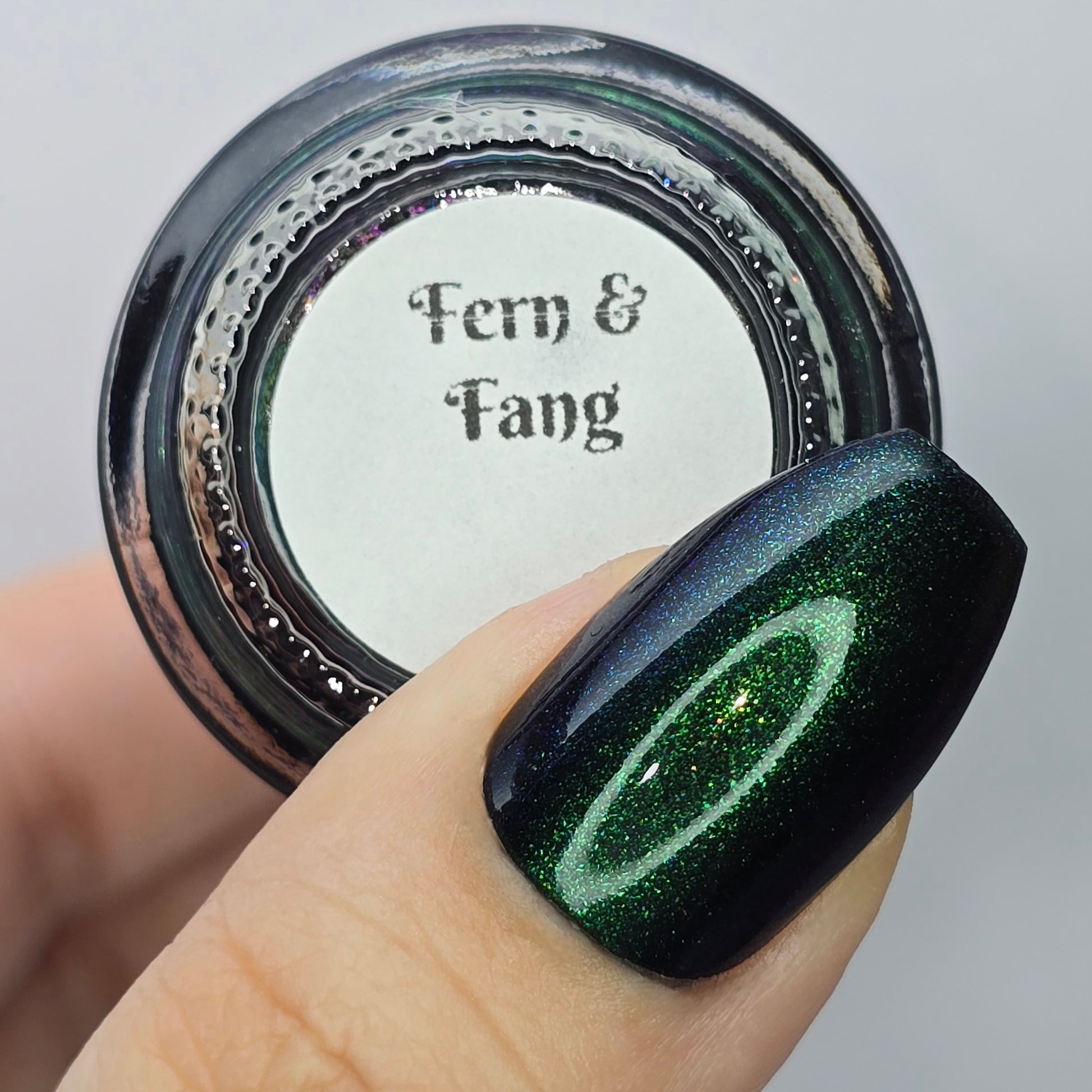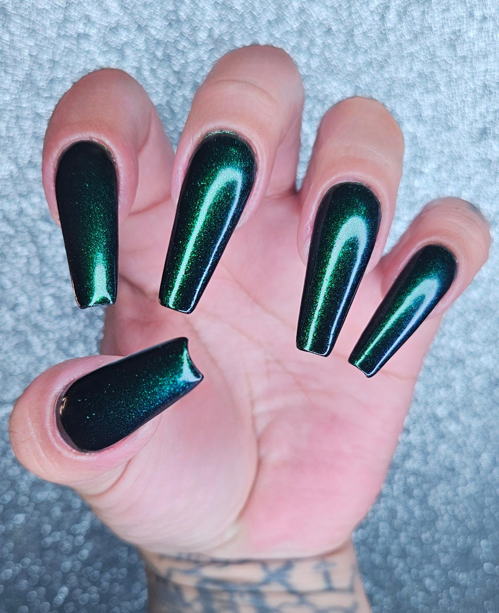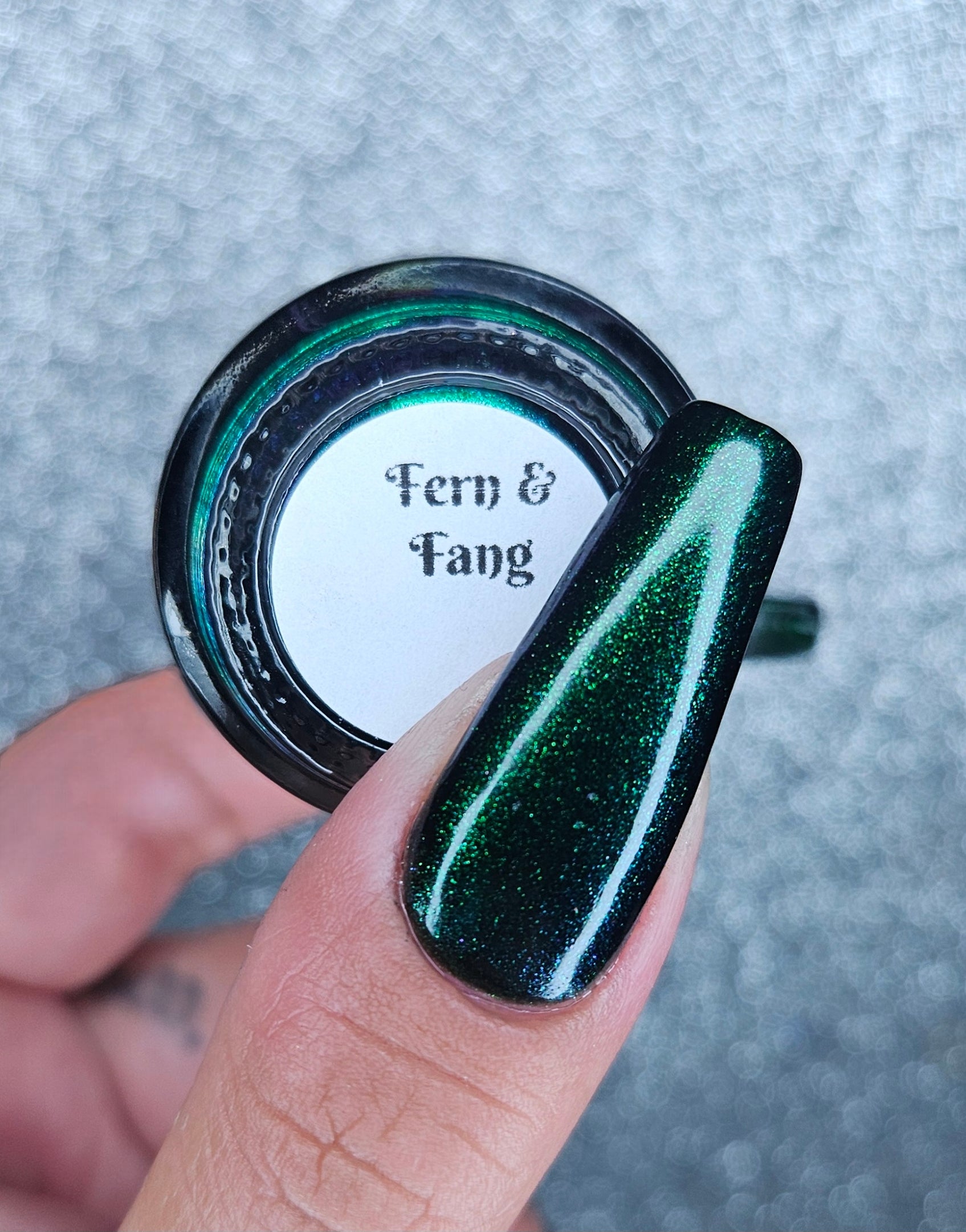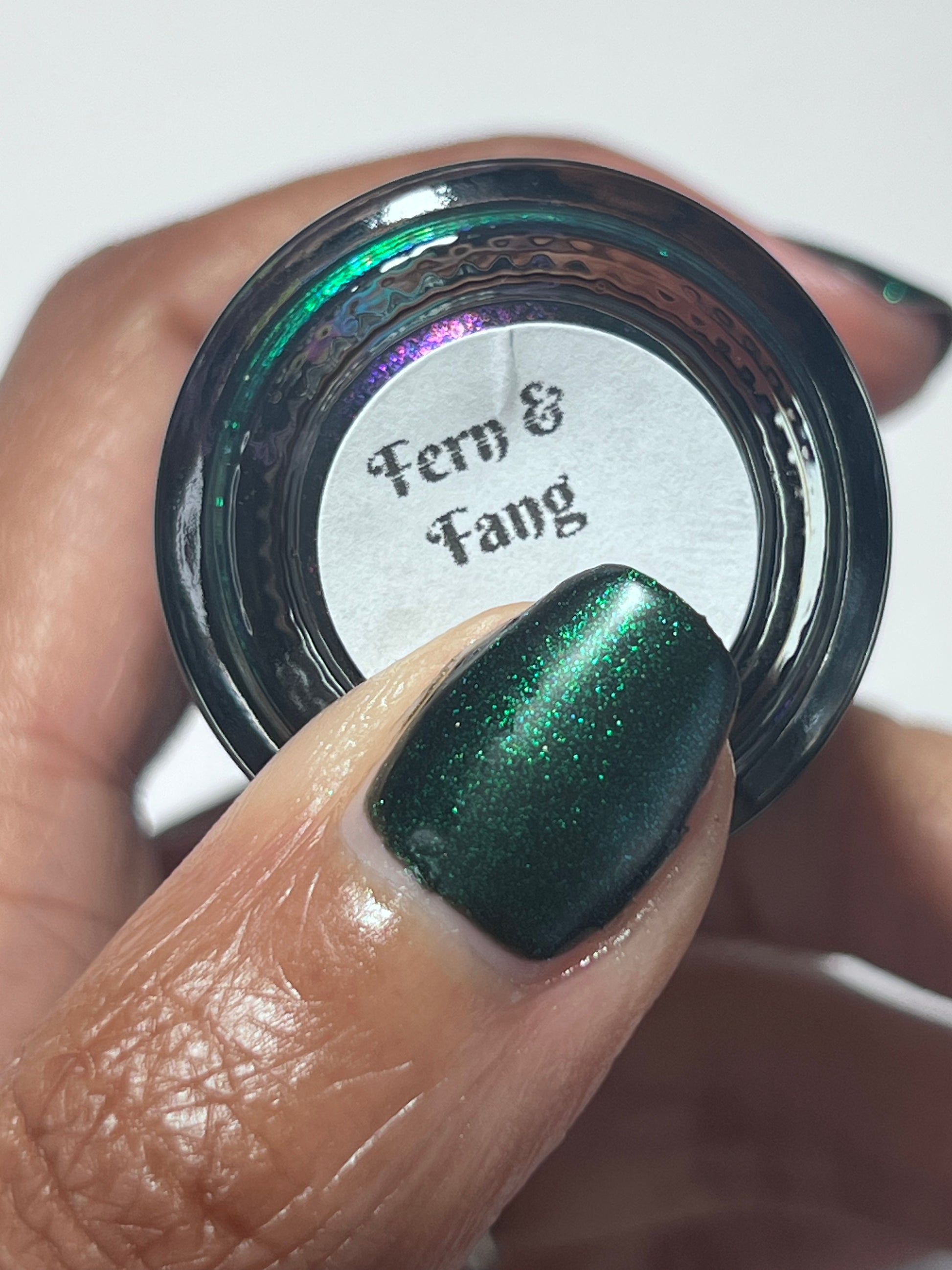 Fern & Fang is a dark green shifting shimmer polish that shifts dark green, purple, and blue at certain angles.
