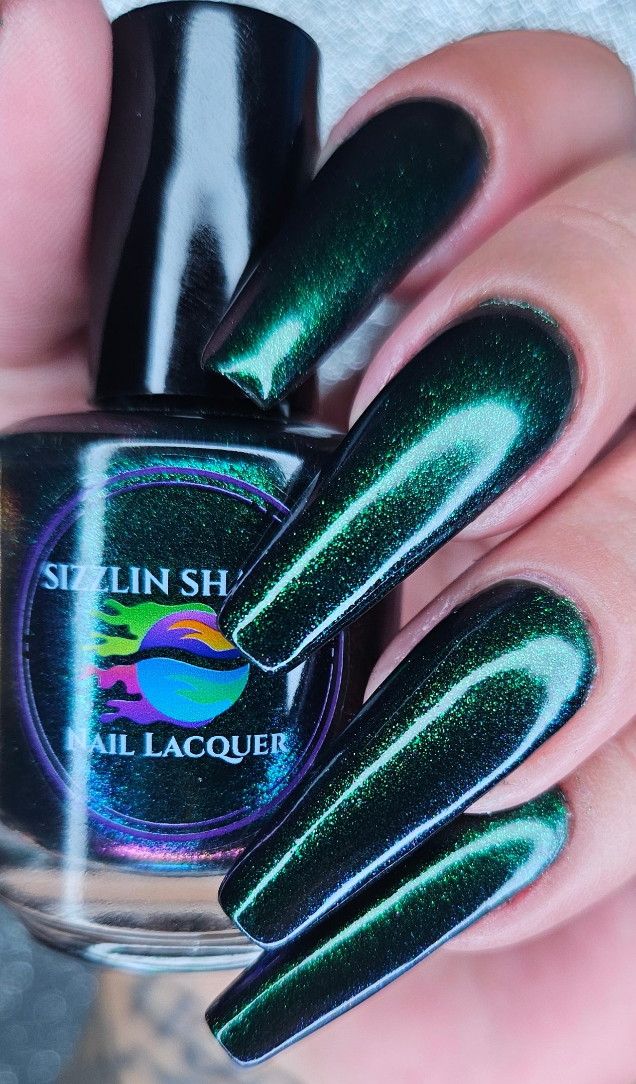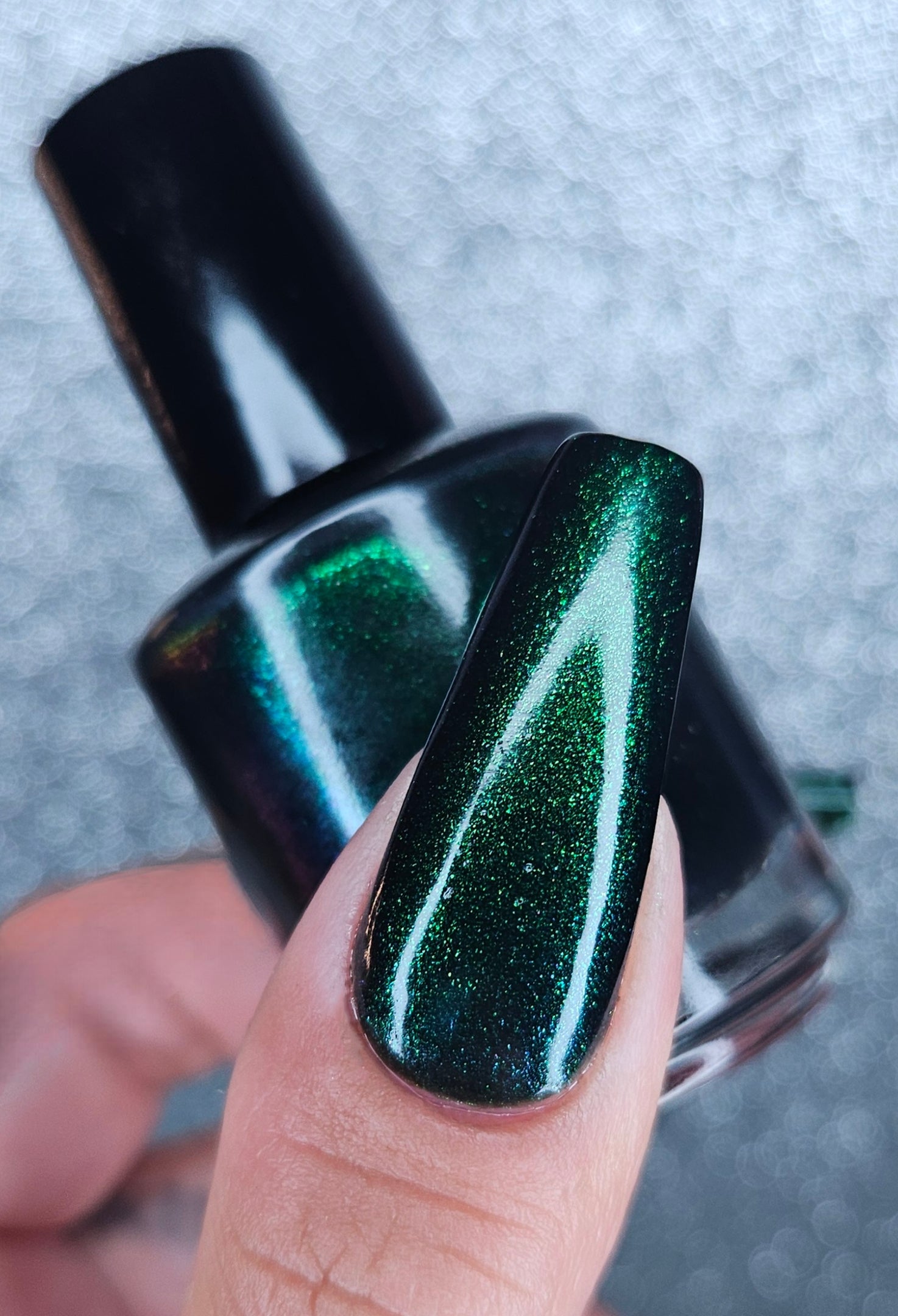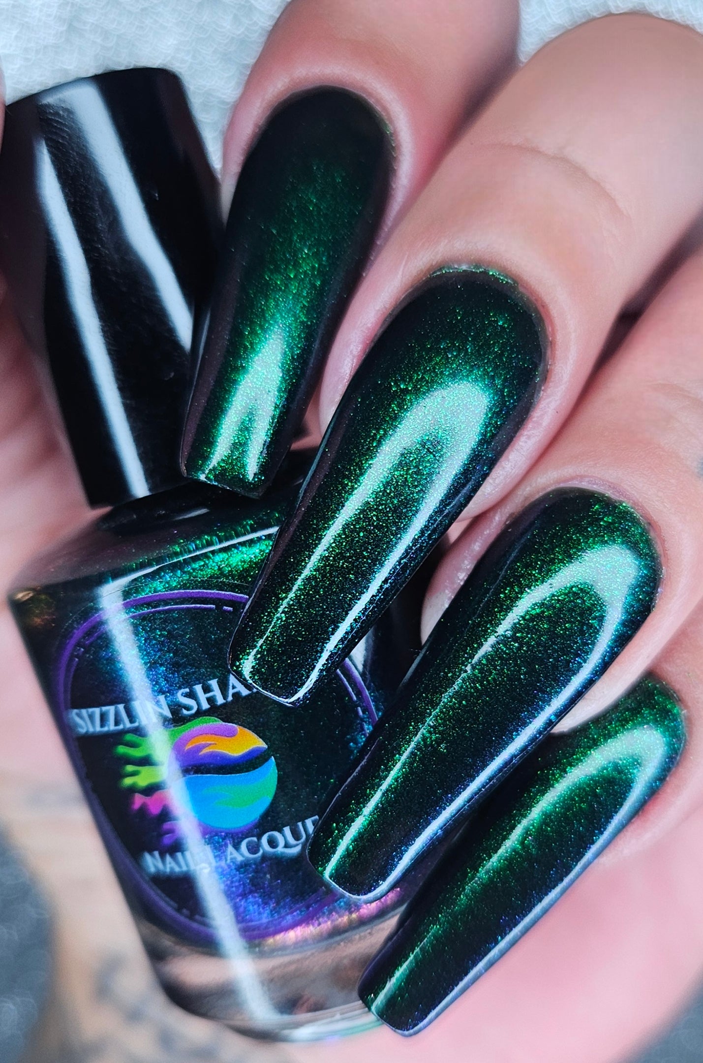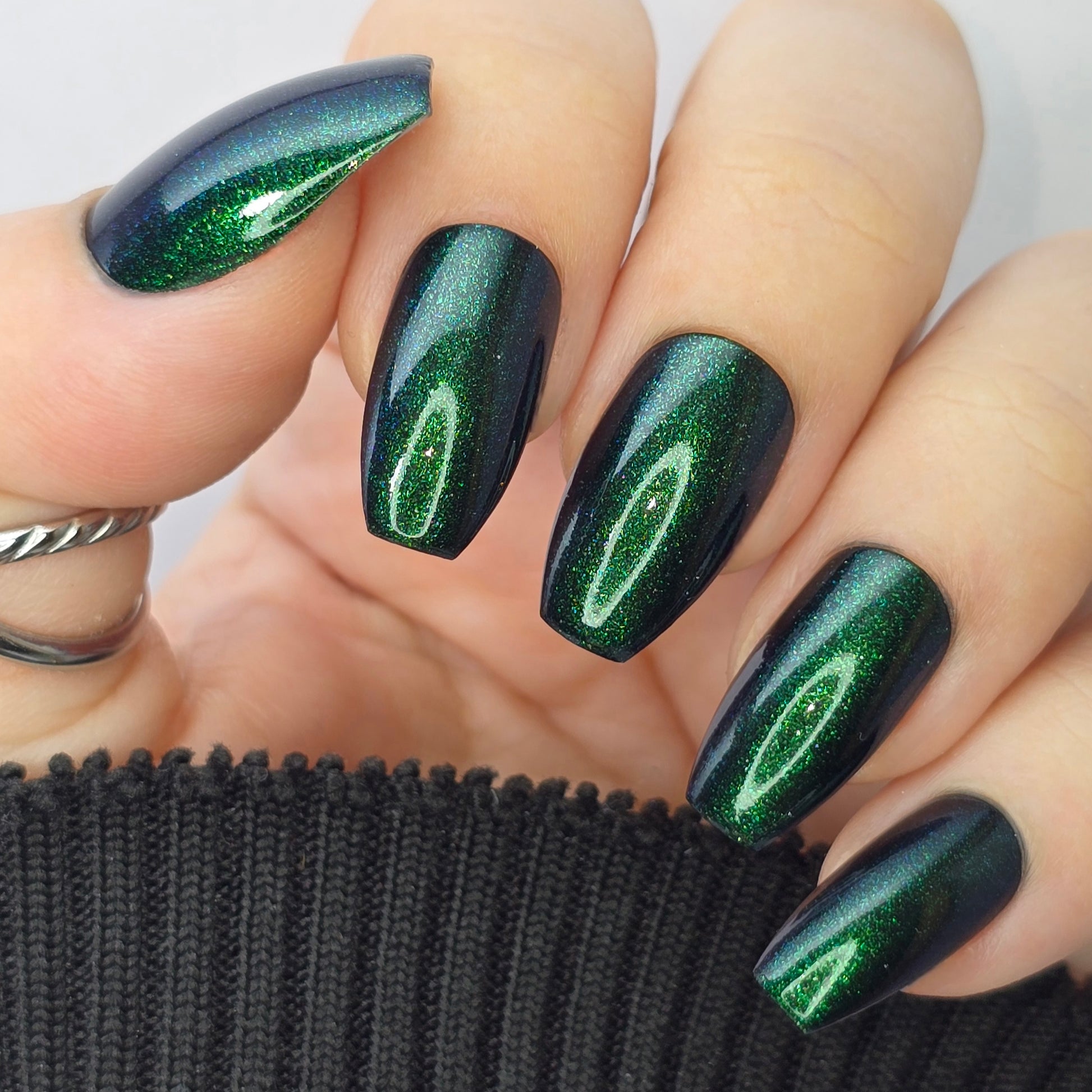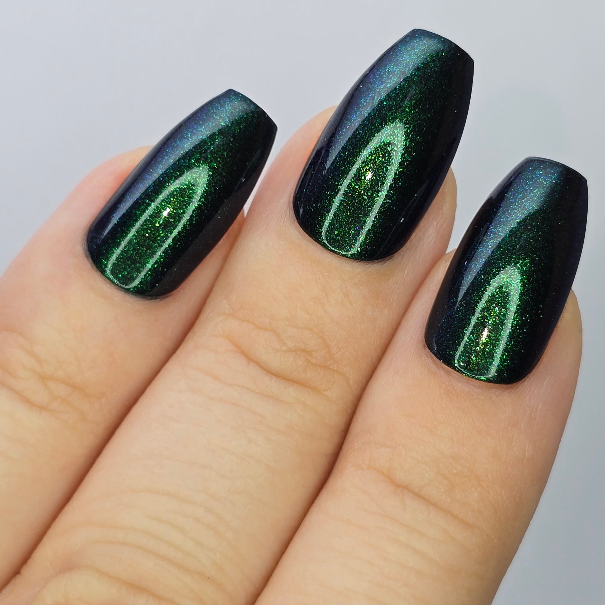 Fern & Fang is a dark green shifting shimmer polish that shifts dark green, purple, and blue at certain angles.