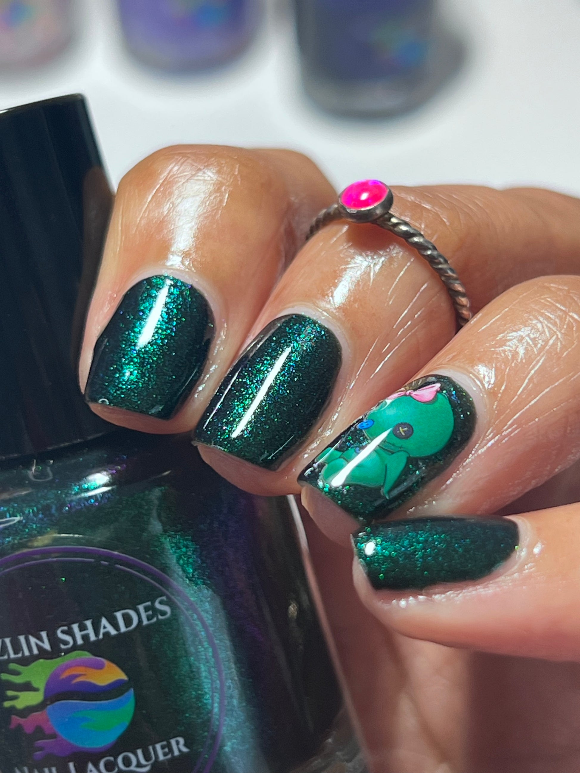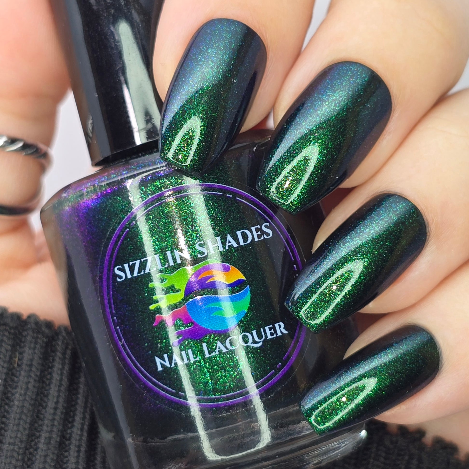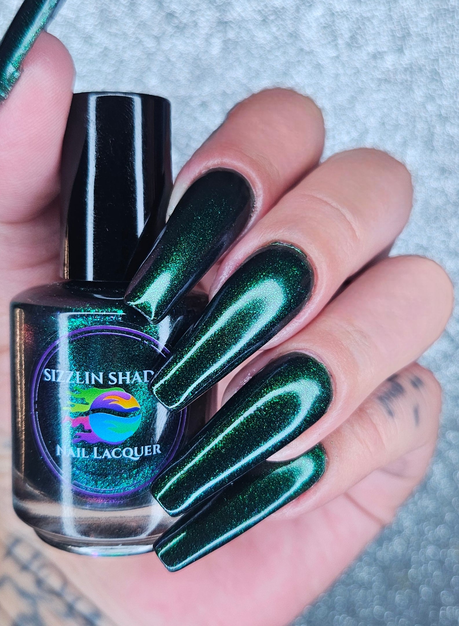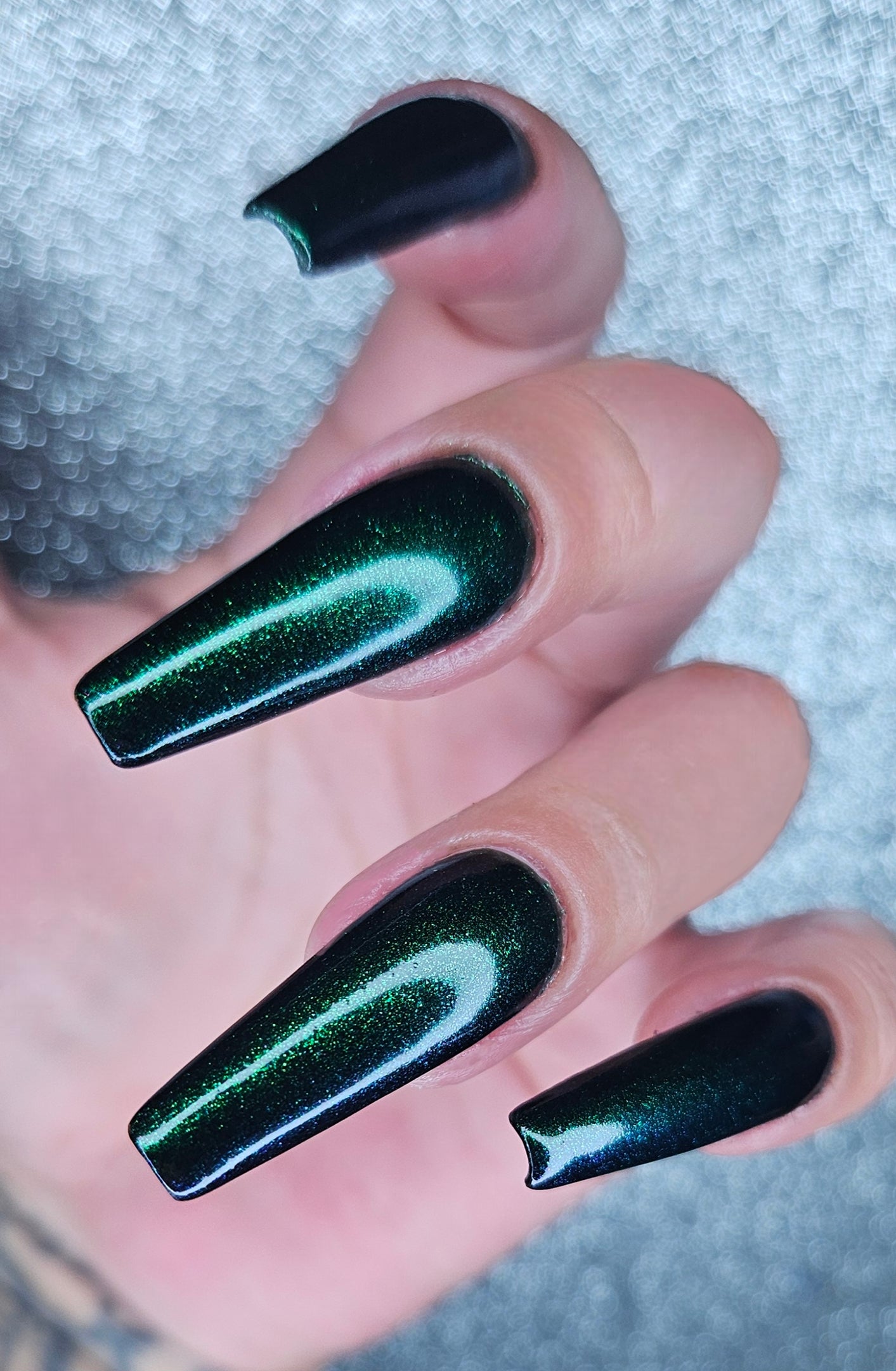 Fern & Fang is a dark green shifting shimmer polish that shifts dark green, purple, and blue at certain angles.