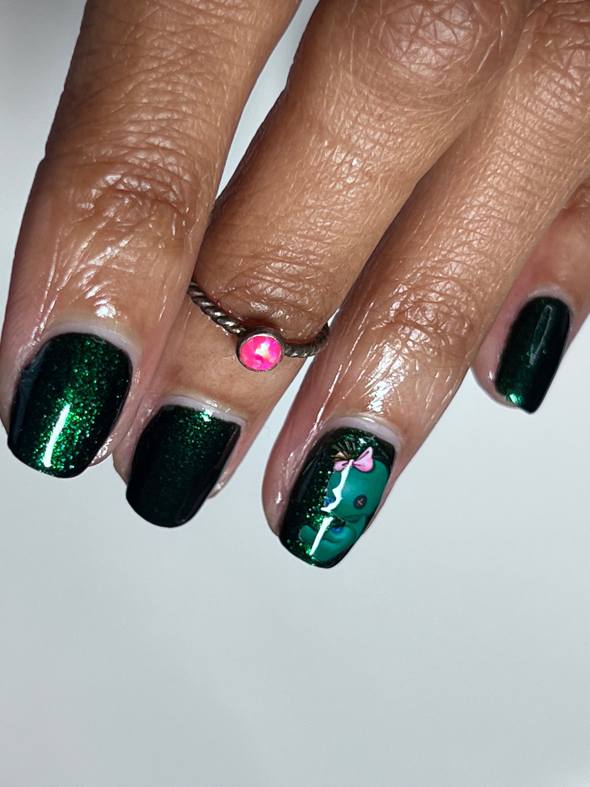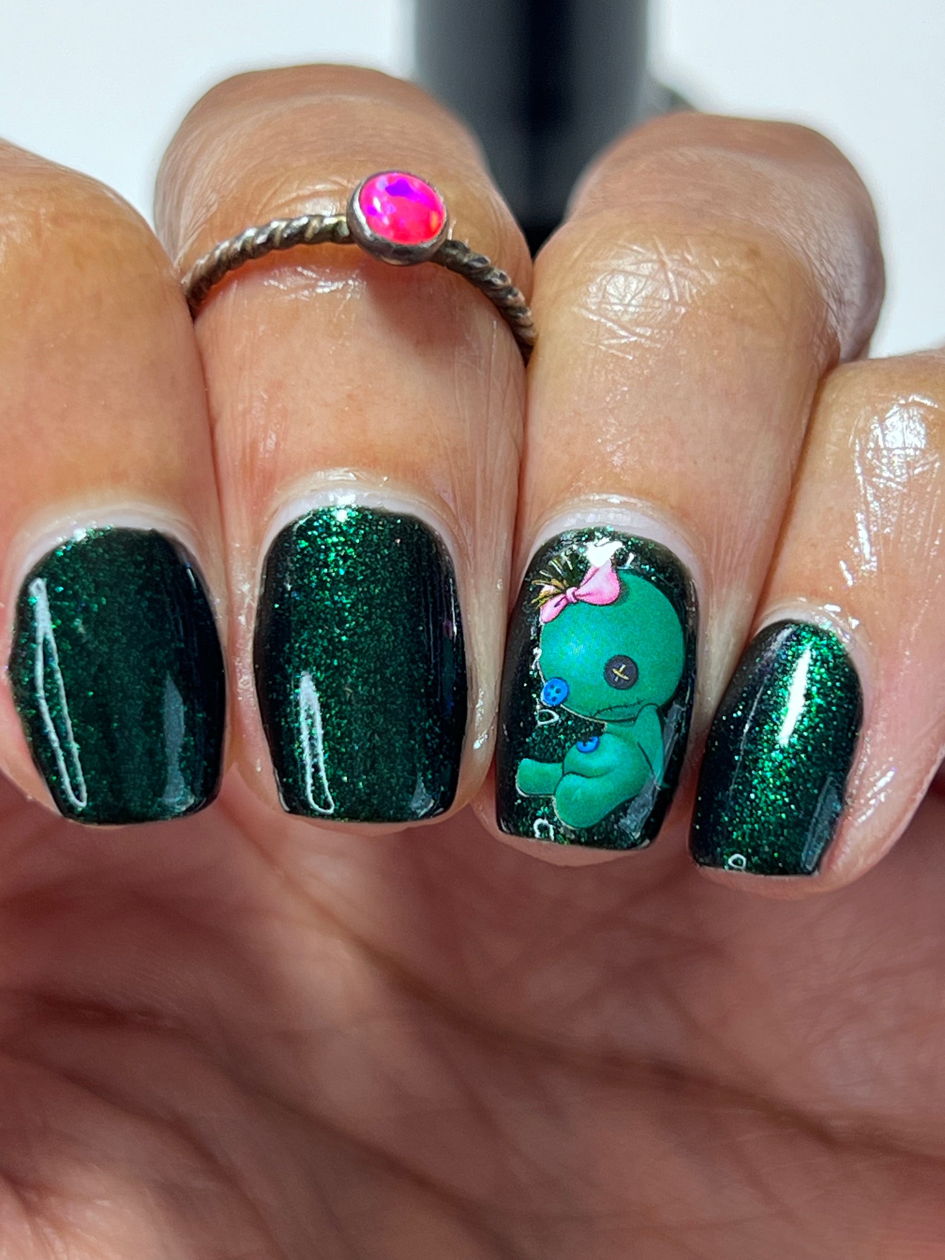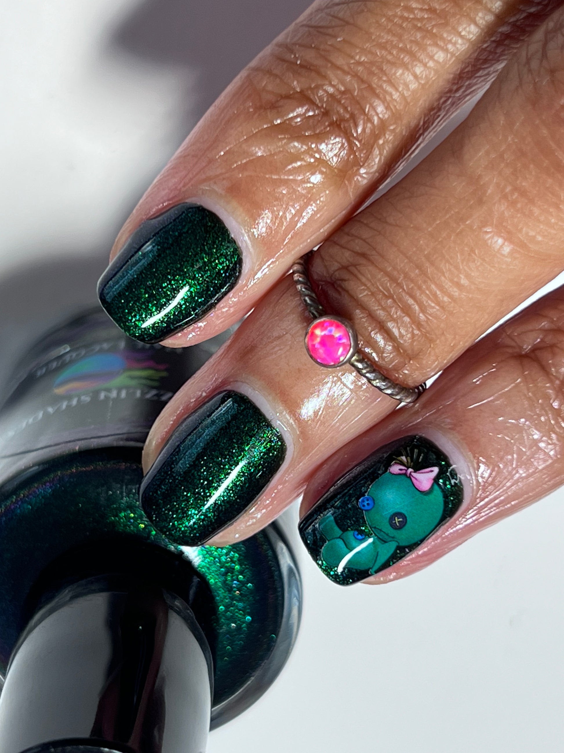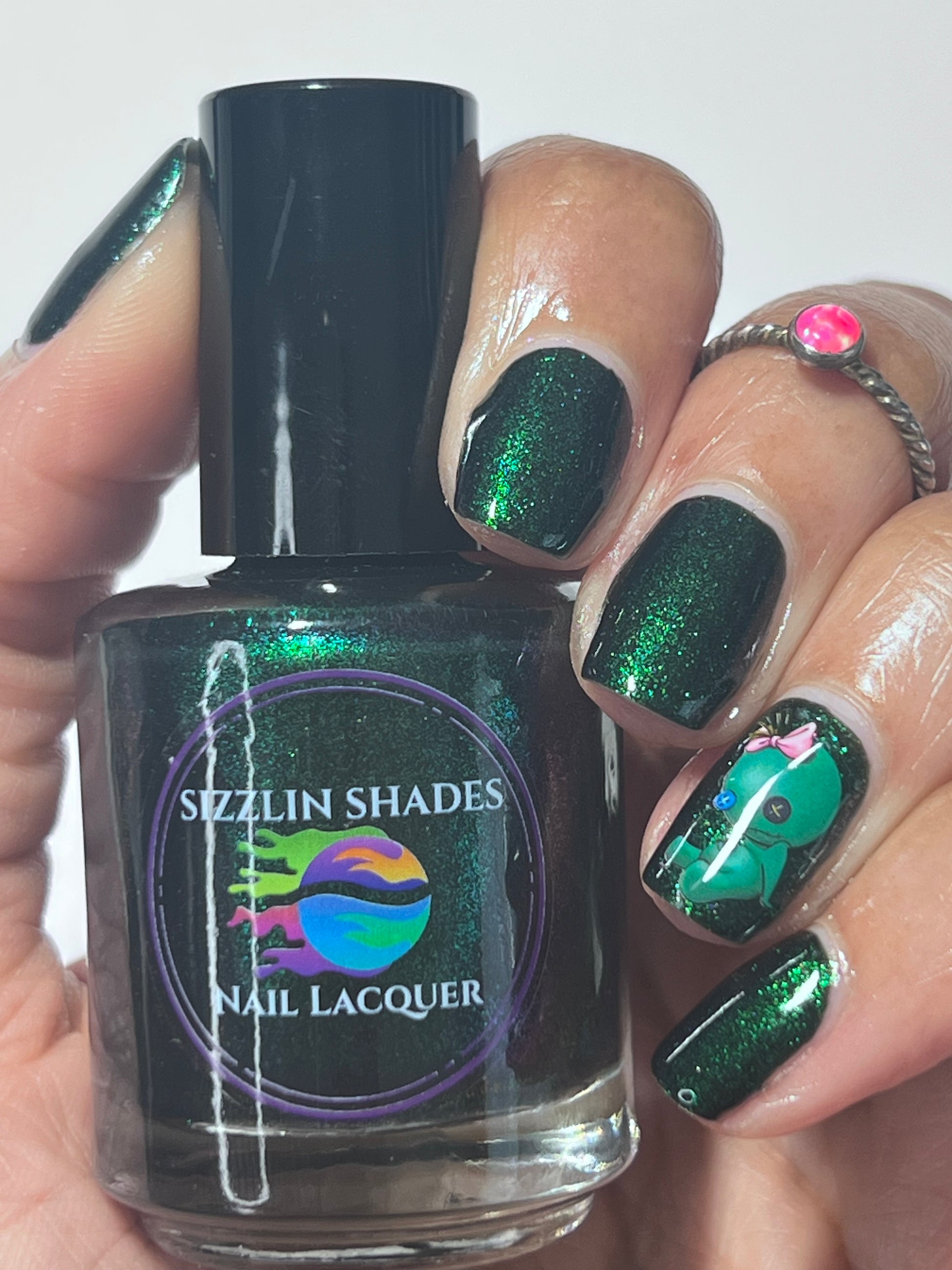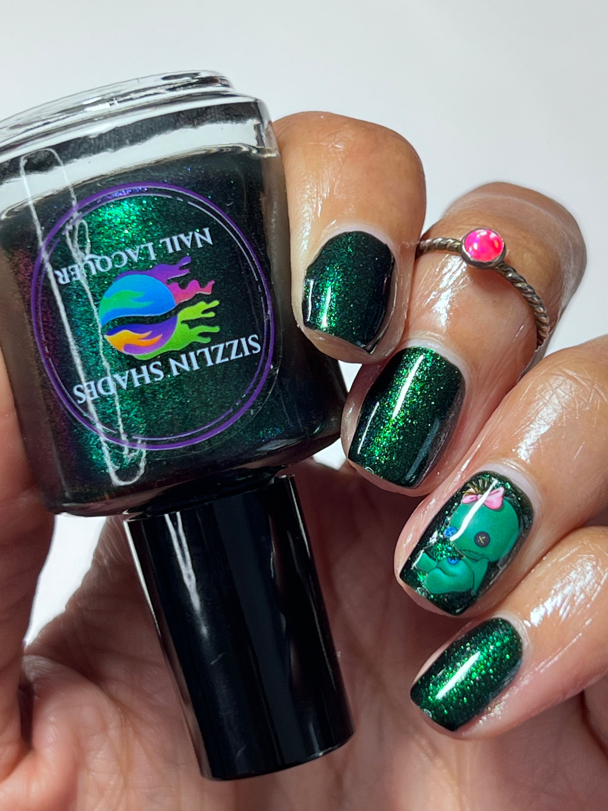 Fern & Fang is a dark green shifting shimmer polish that shifts dark green, purple, and blue at certain angles.