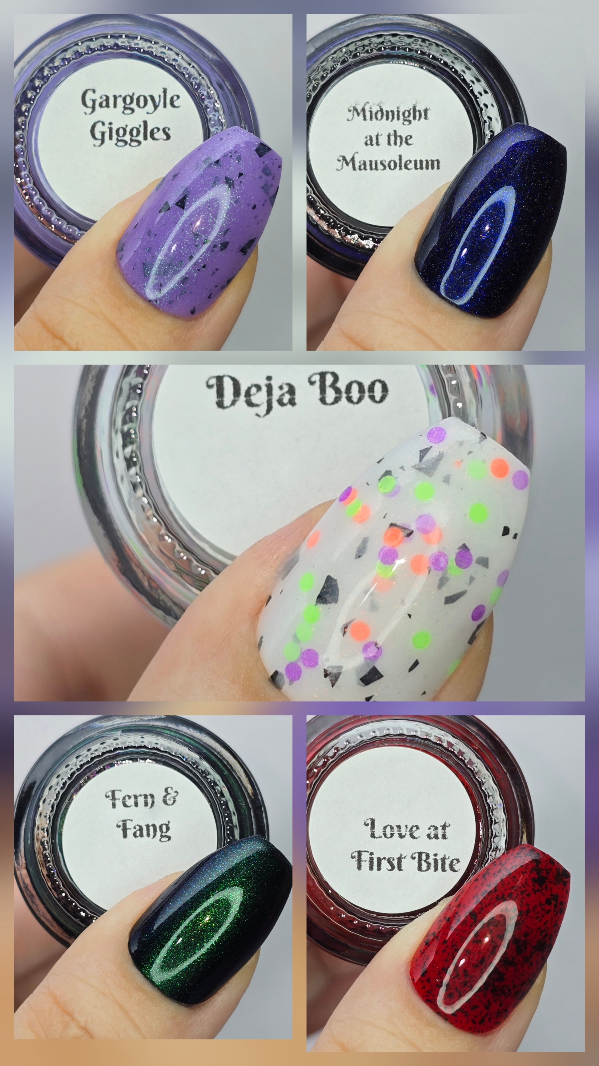Deja Boo a white crelly polish with purple, orange, and green neon glitter, black shreds and an orange shifting shimmer.