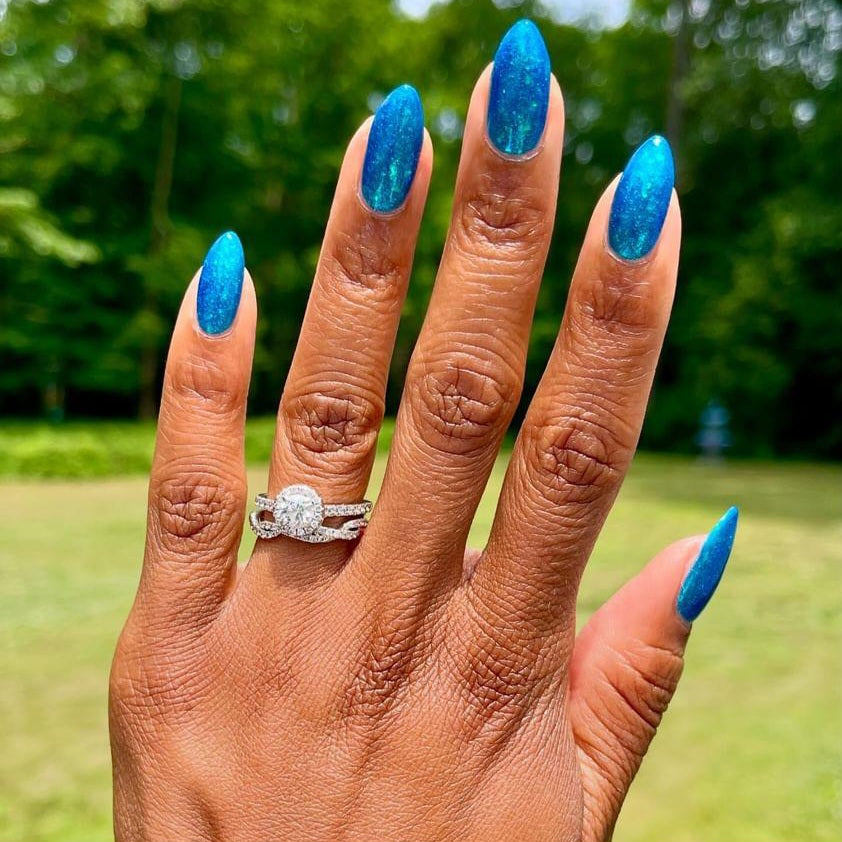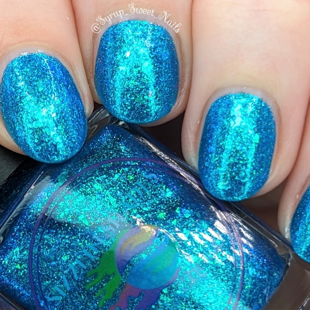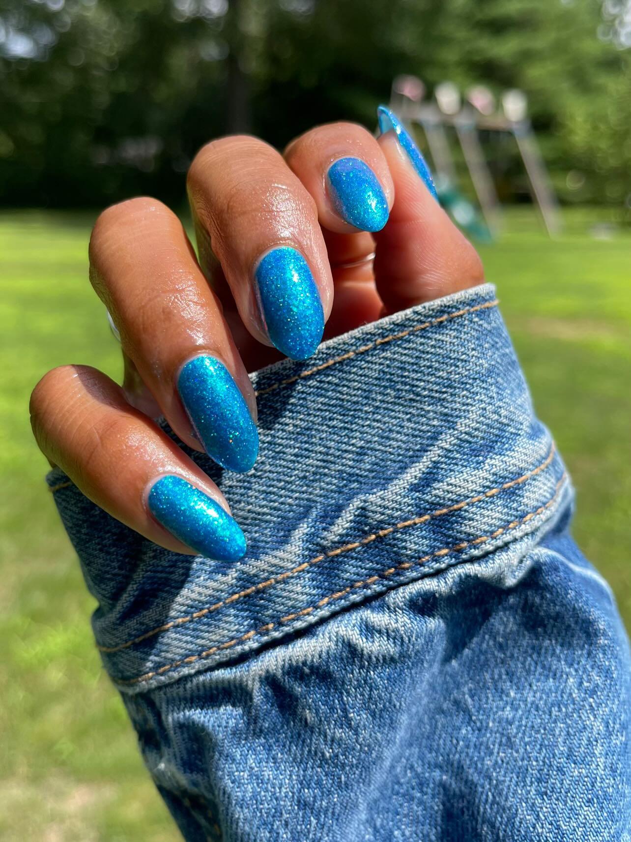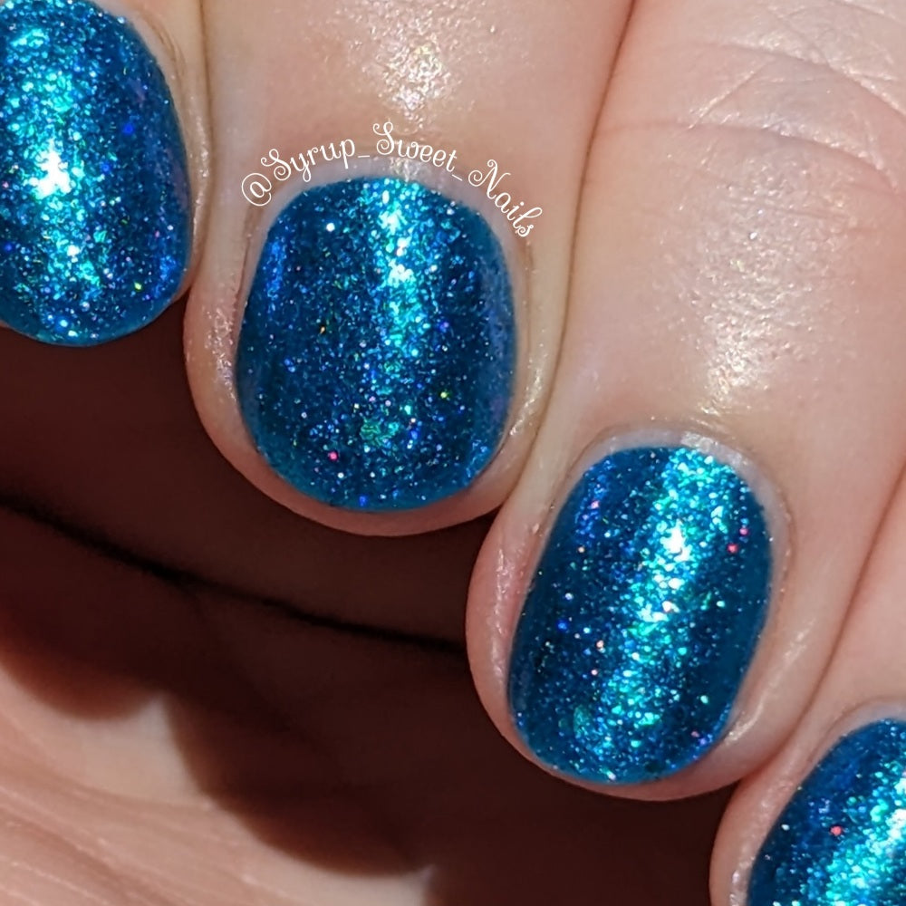 Lady of the lake is a polish based on the Lady of the lake legend from White Rock Lake in Texas. The polish is a blue base with blue/purple/teal shifting flakies, silver holo glitter, and teal/blue/purple shifting shimmer.