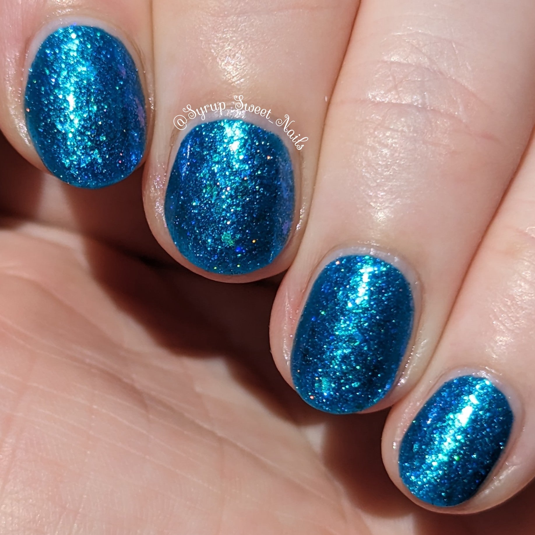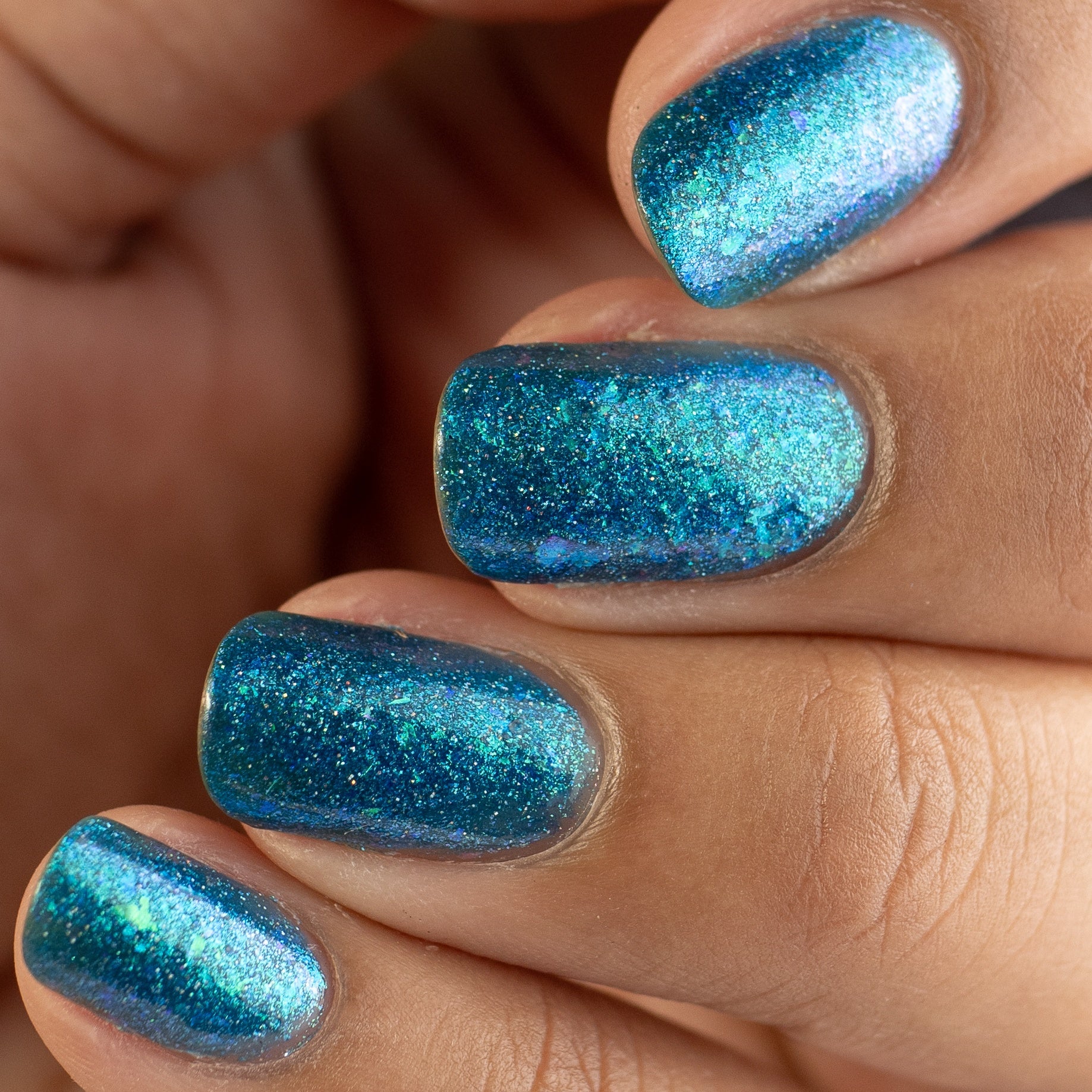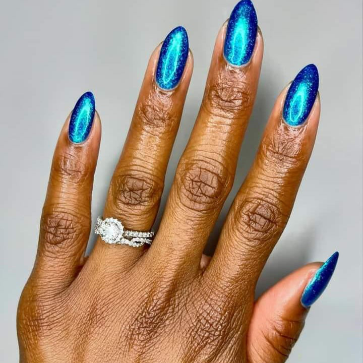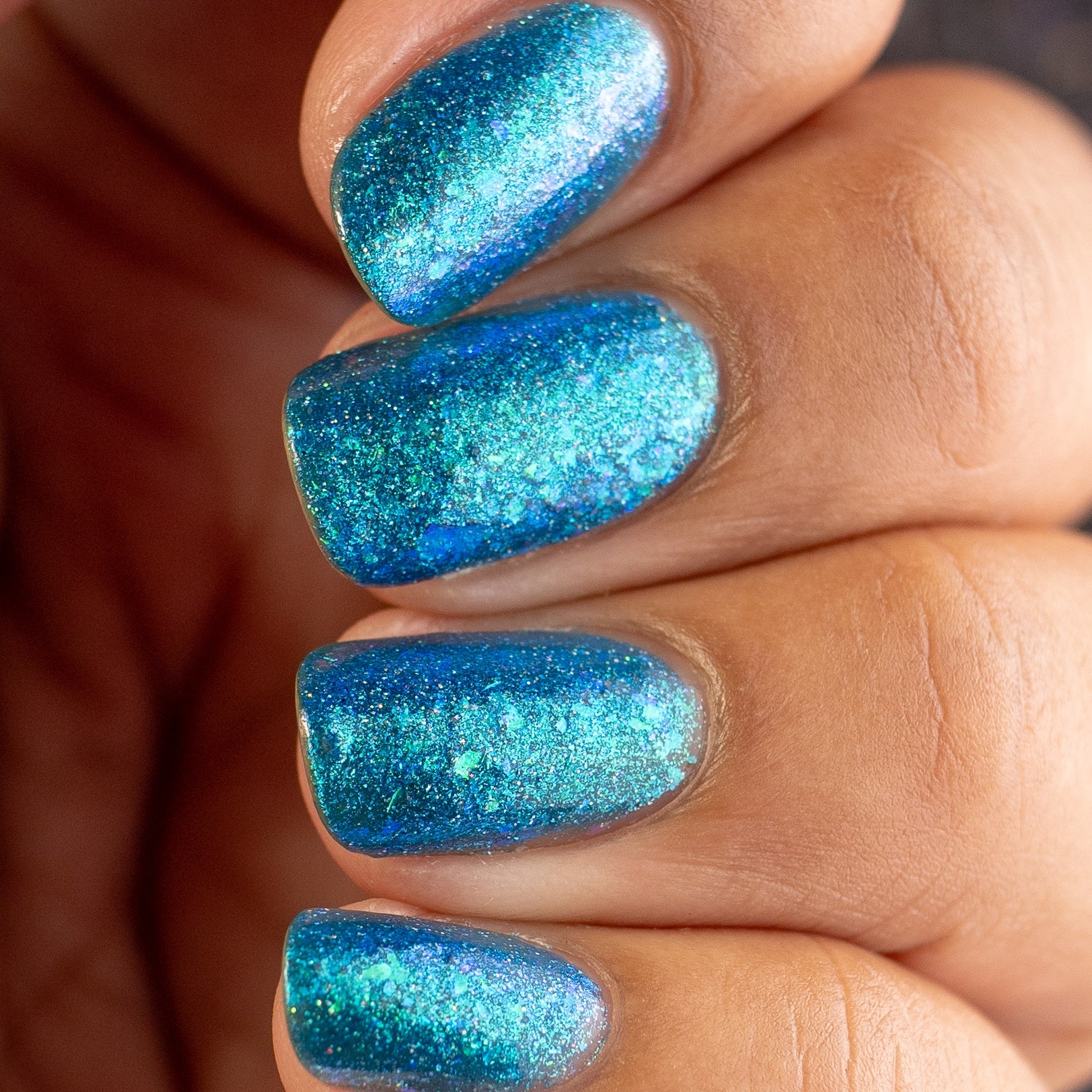 Lady of the lake is a polish based on the Lady of the lake legend from White Rock Lake in Texas. The polish is a blue base with blue/purple/teal shifting flakies, silver holo glitter, and teal/blue/purple shifting shimmer.
