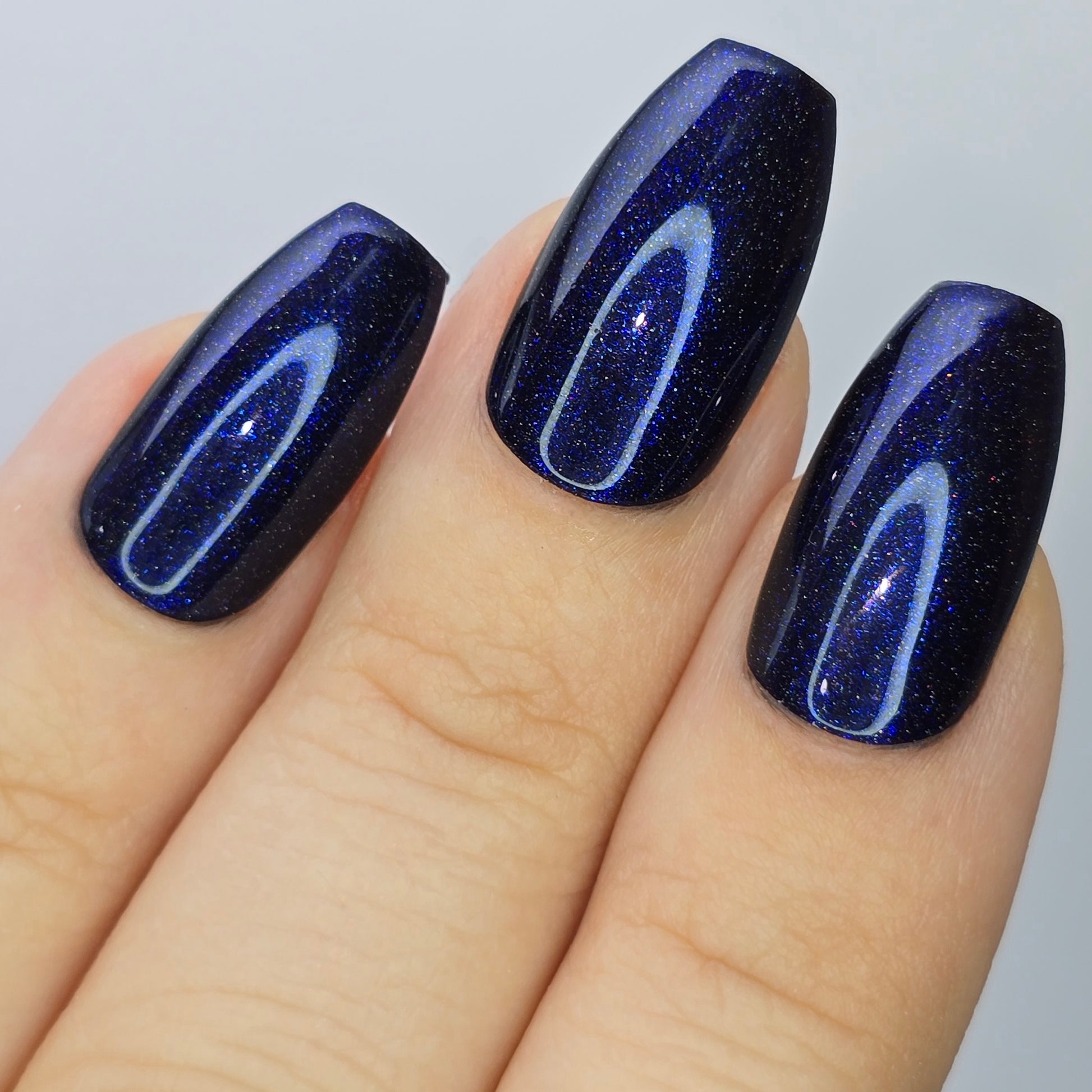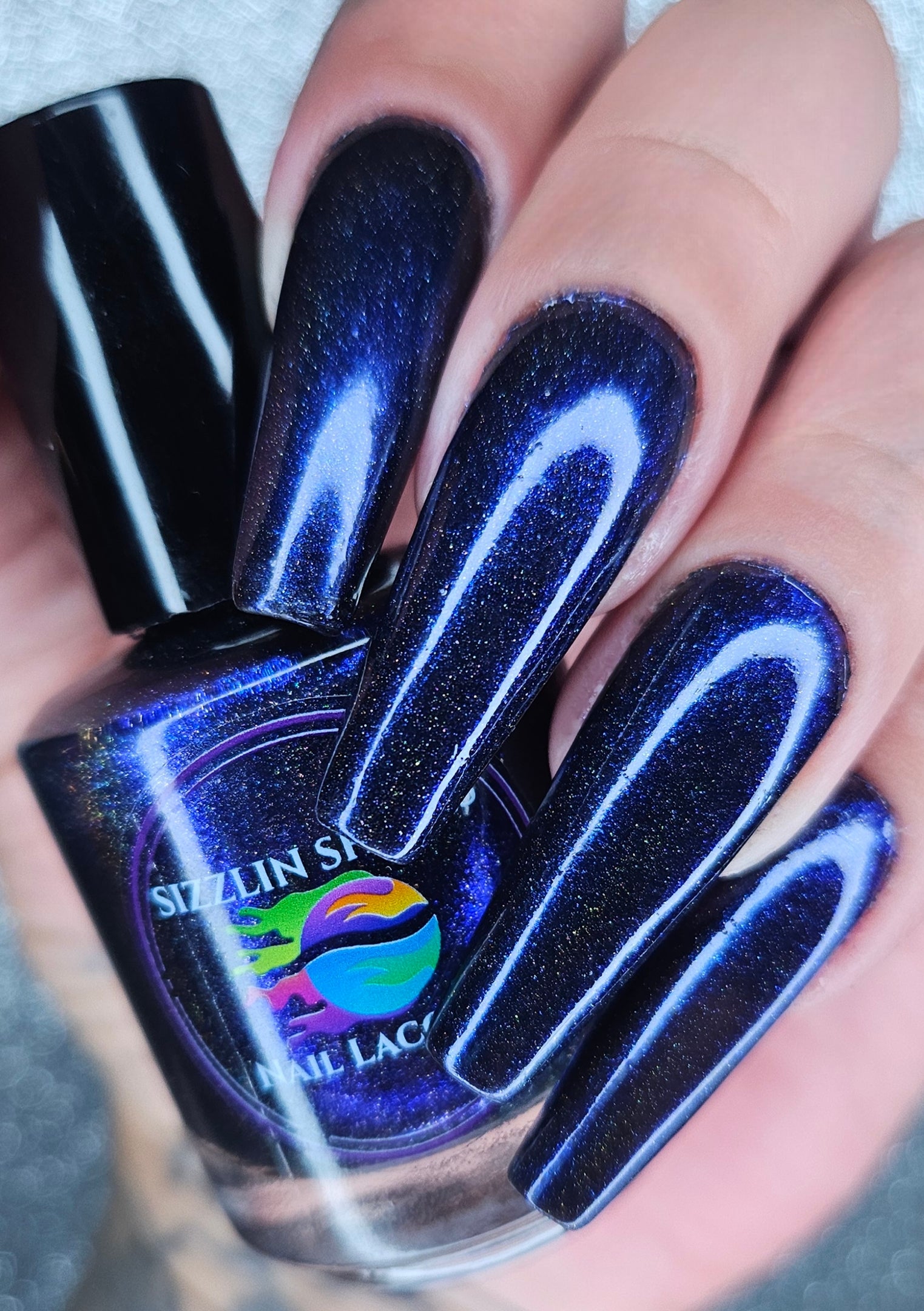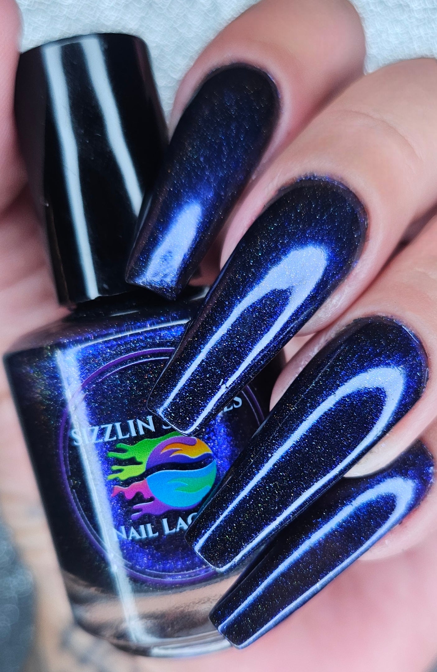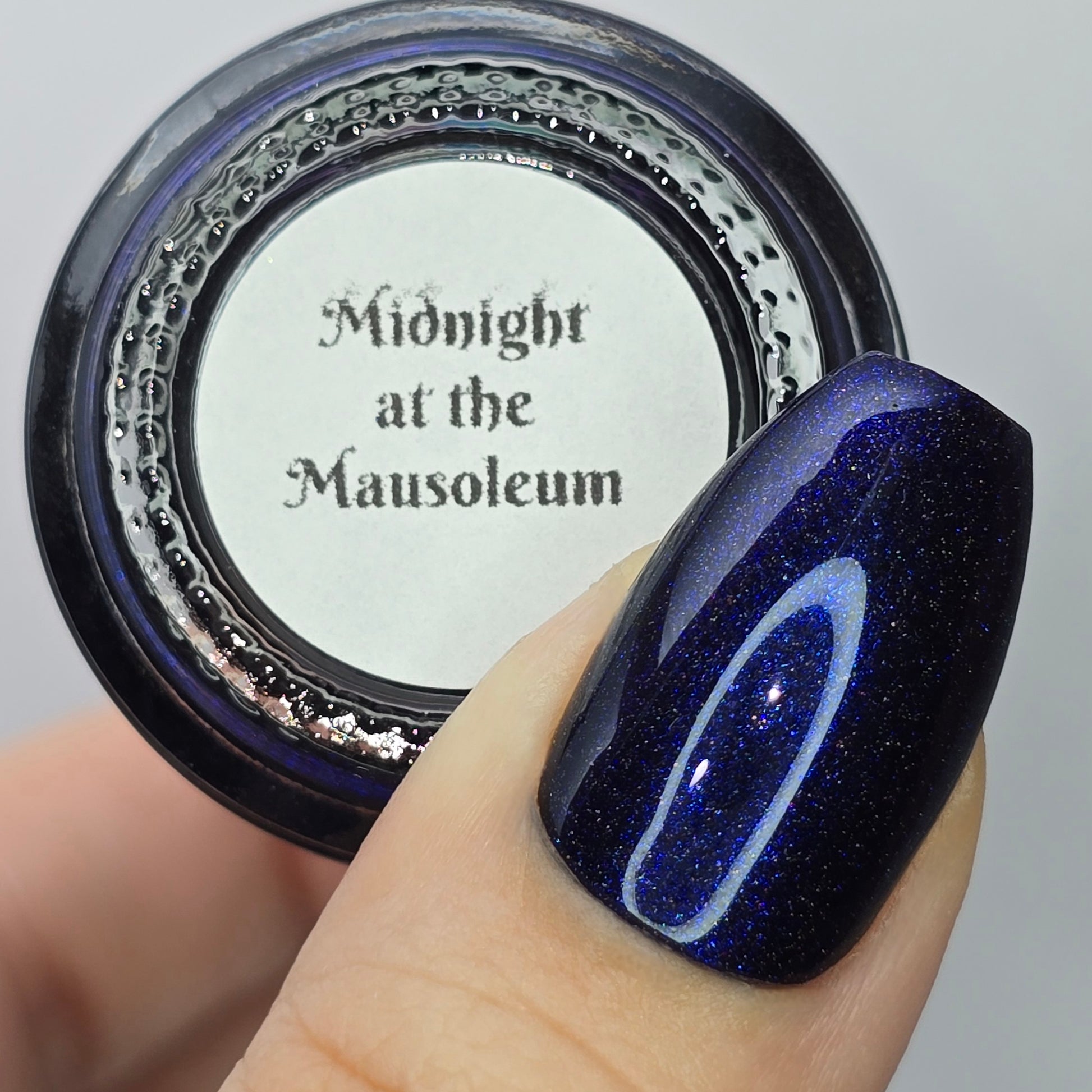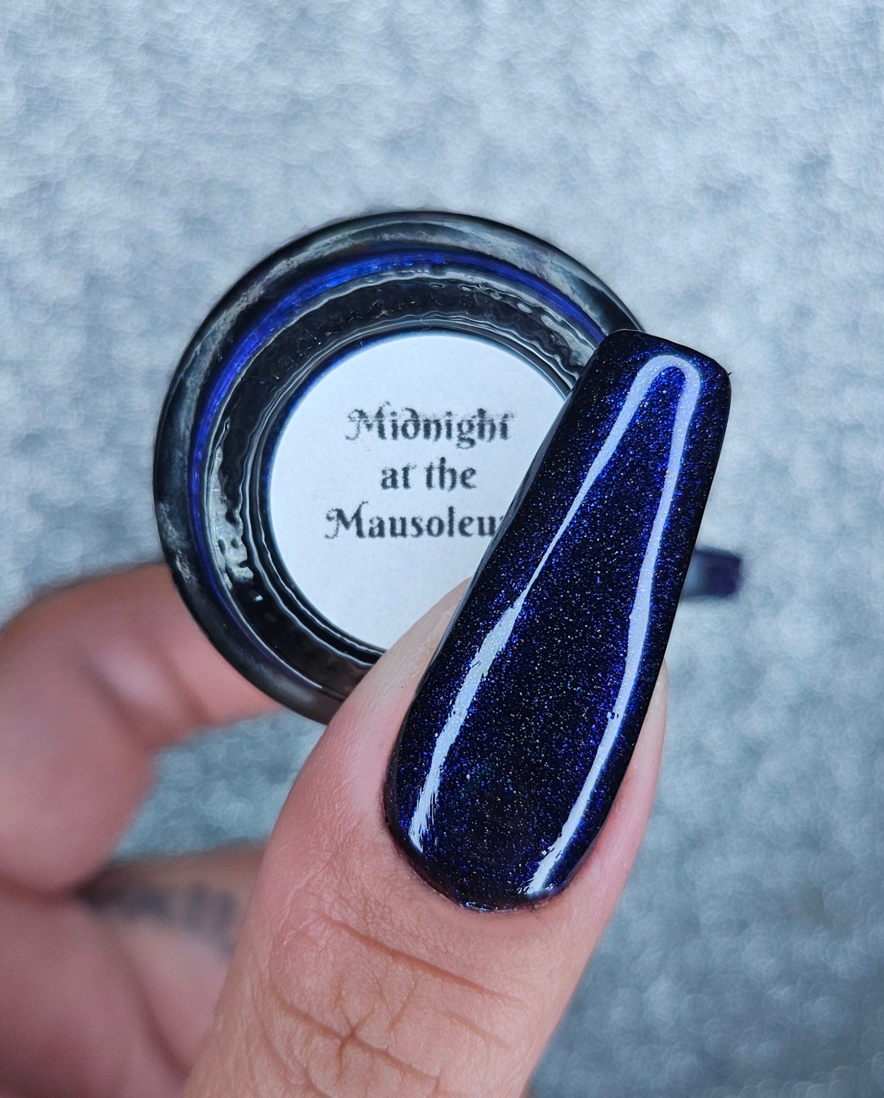 Midnight at the Mausoleum is a black polish with linear holo, and a bright blue shimmer.