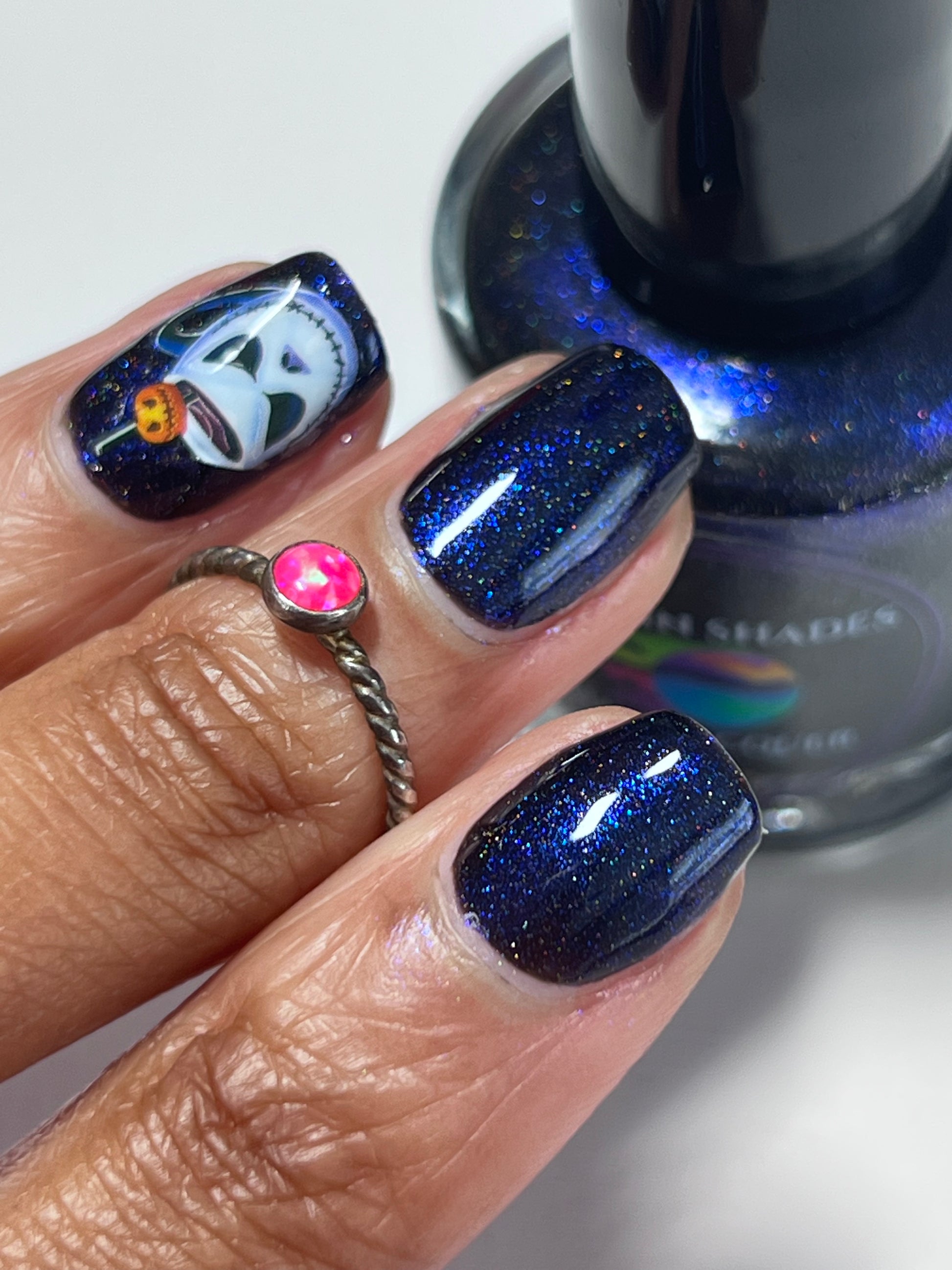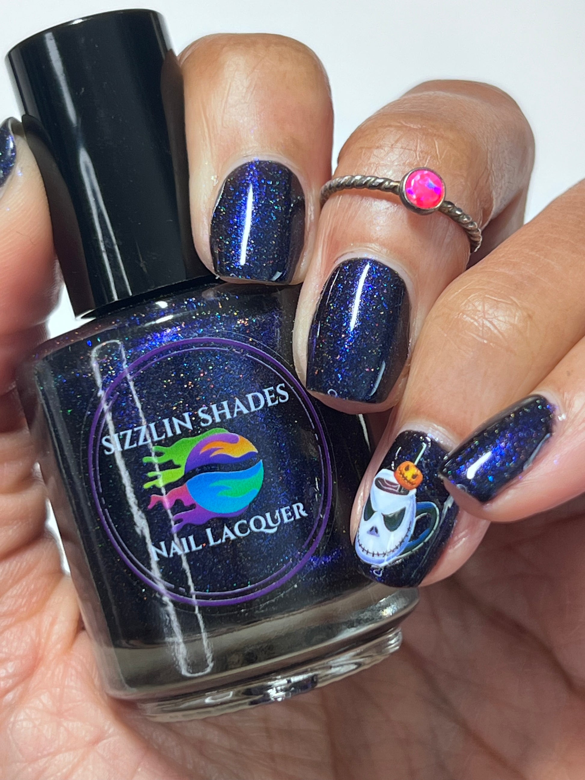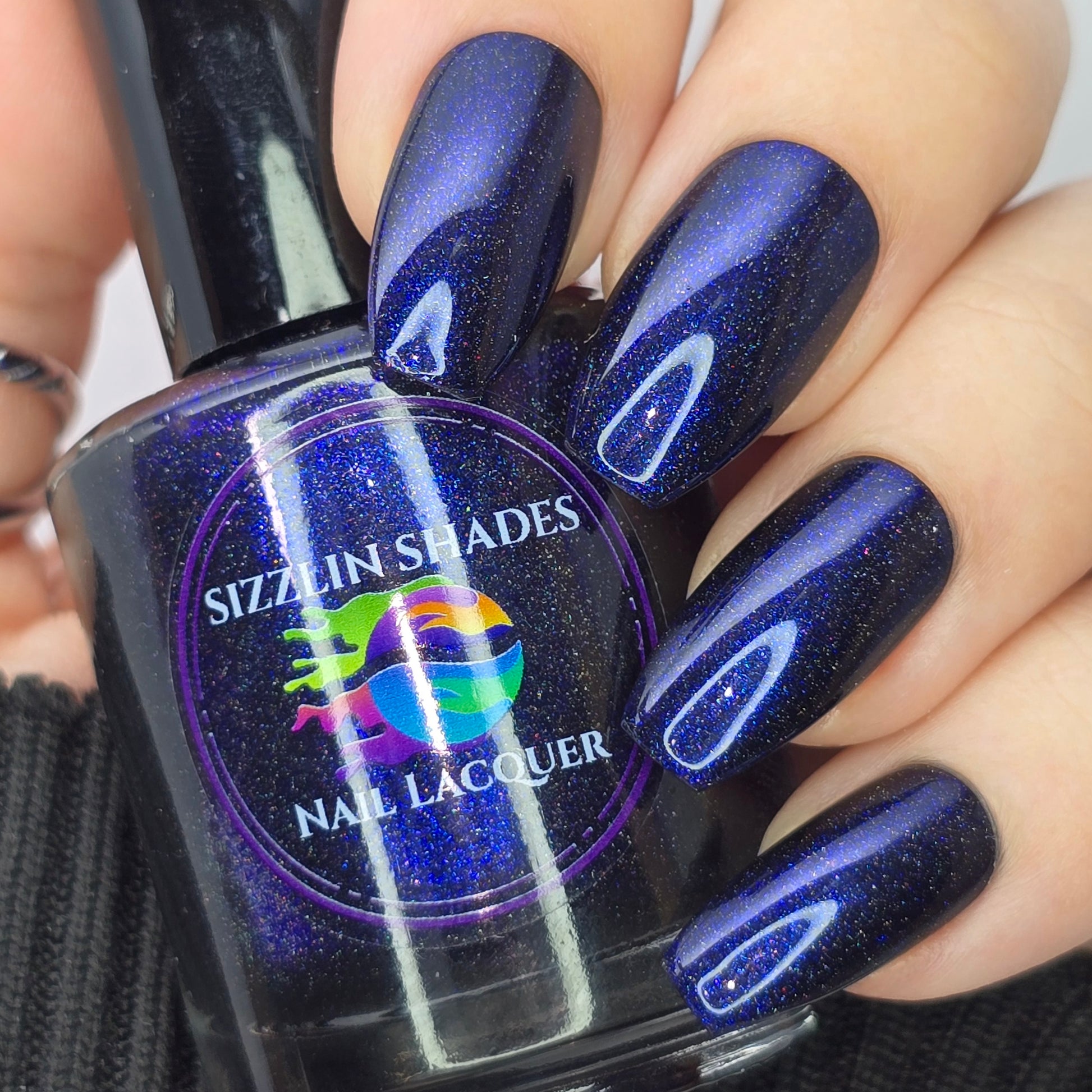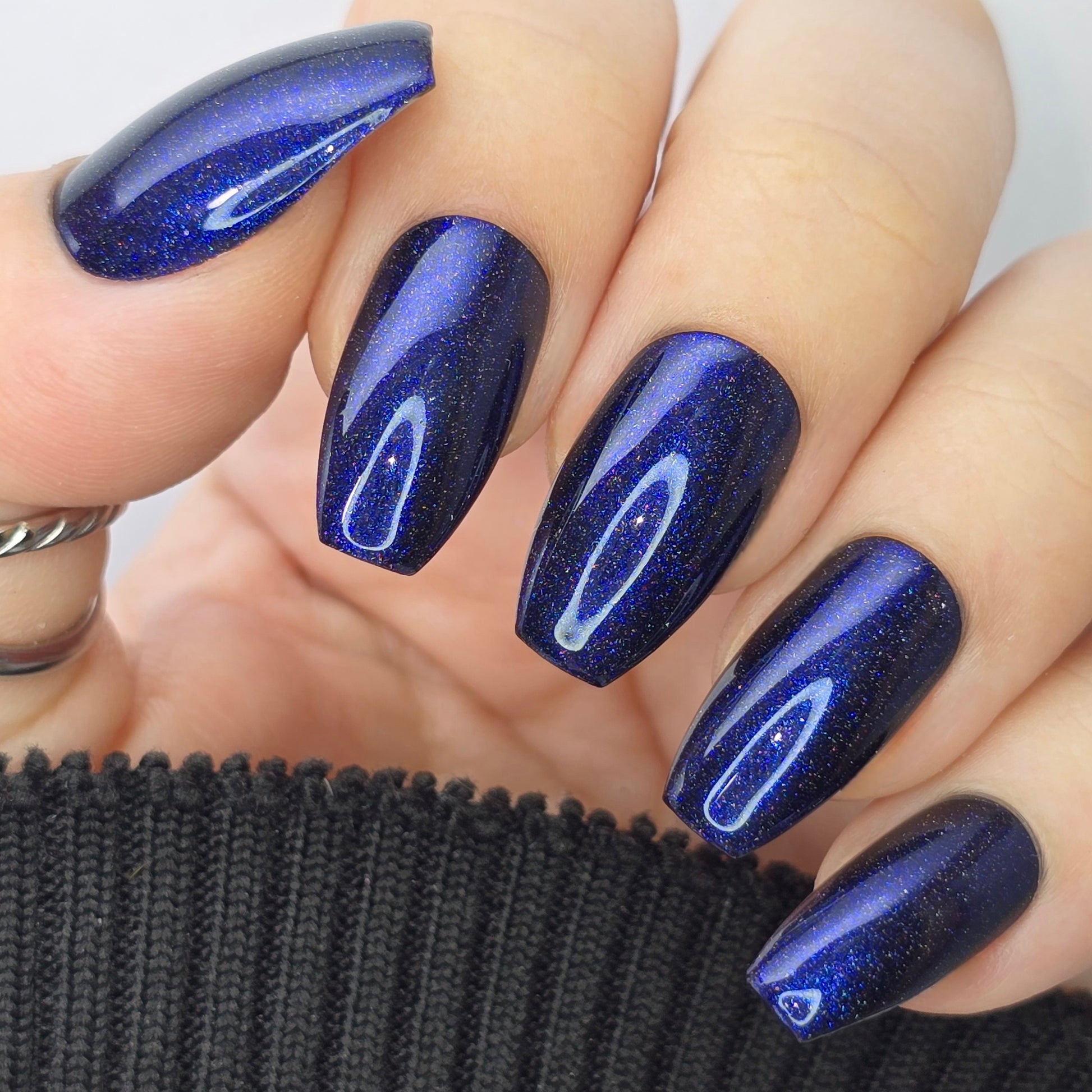 Midnight at the Mausoleum is a black polish with linear holo, and a bright blue shimmer.
