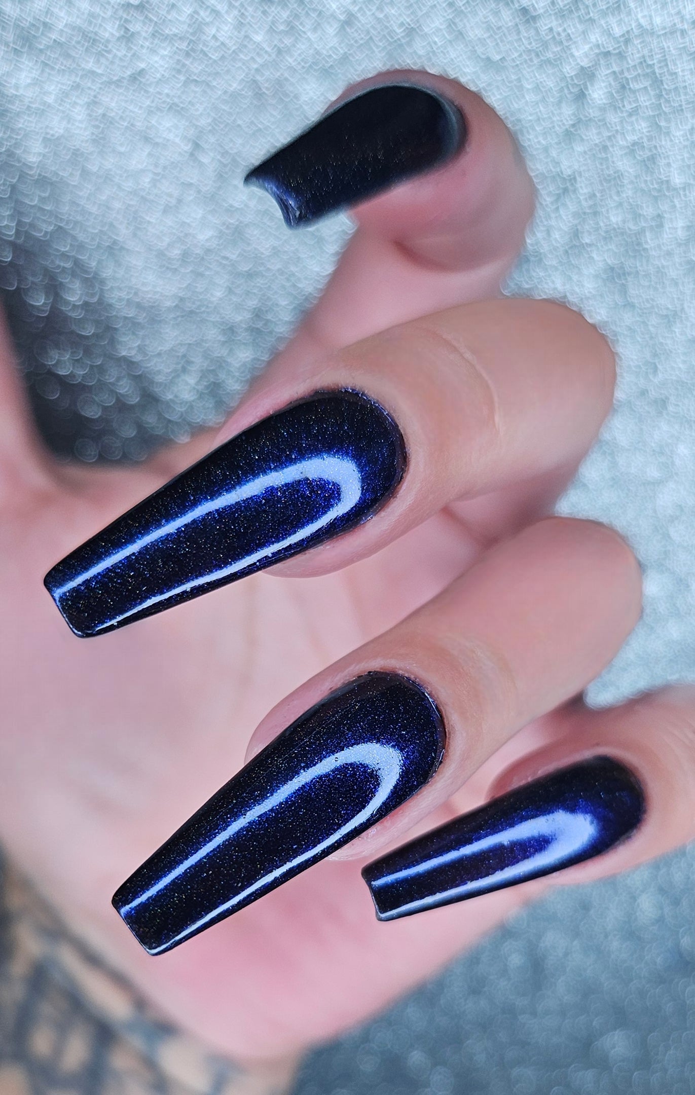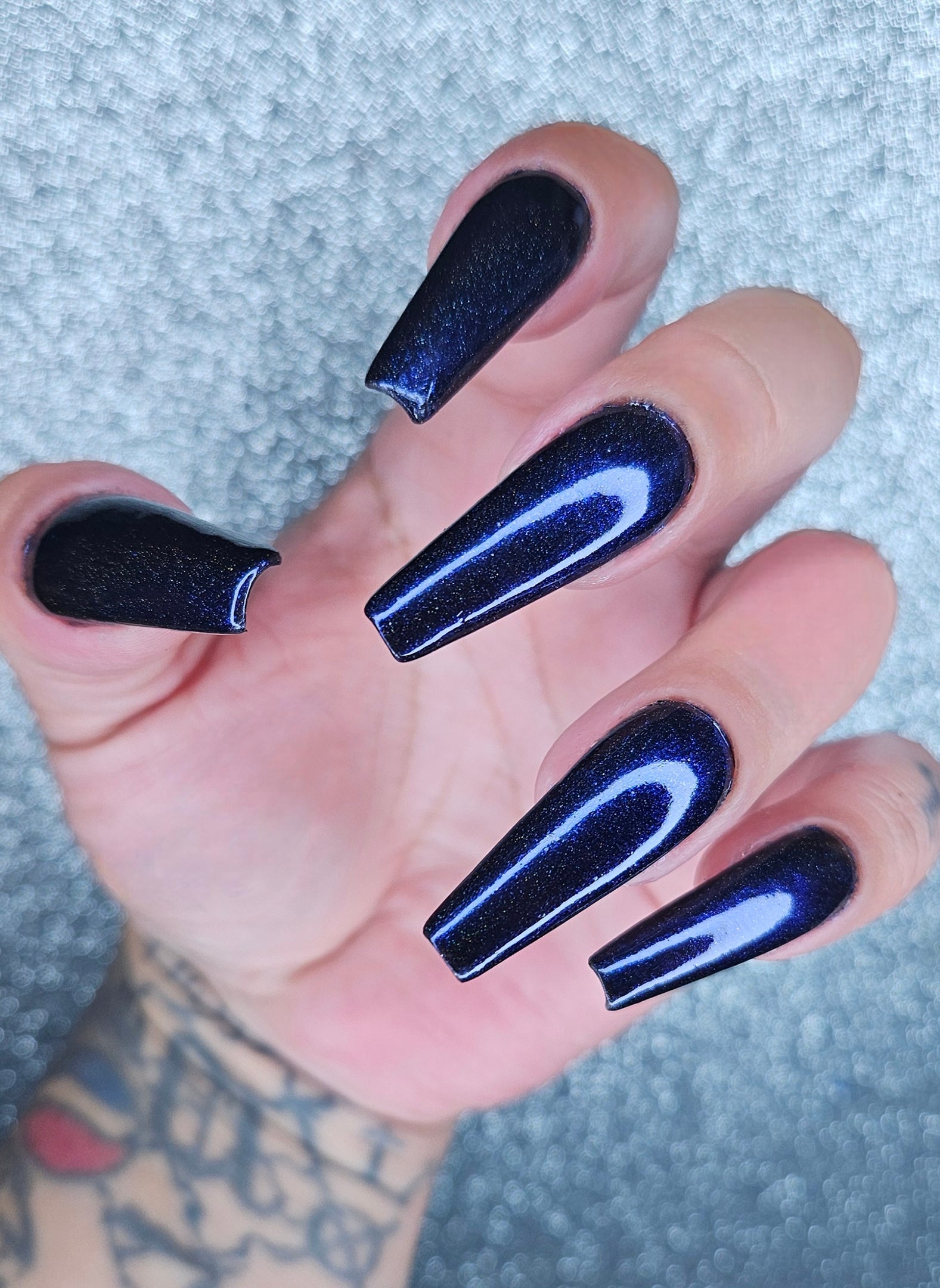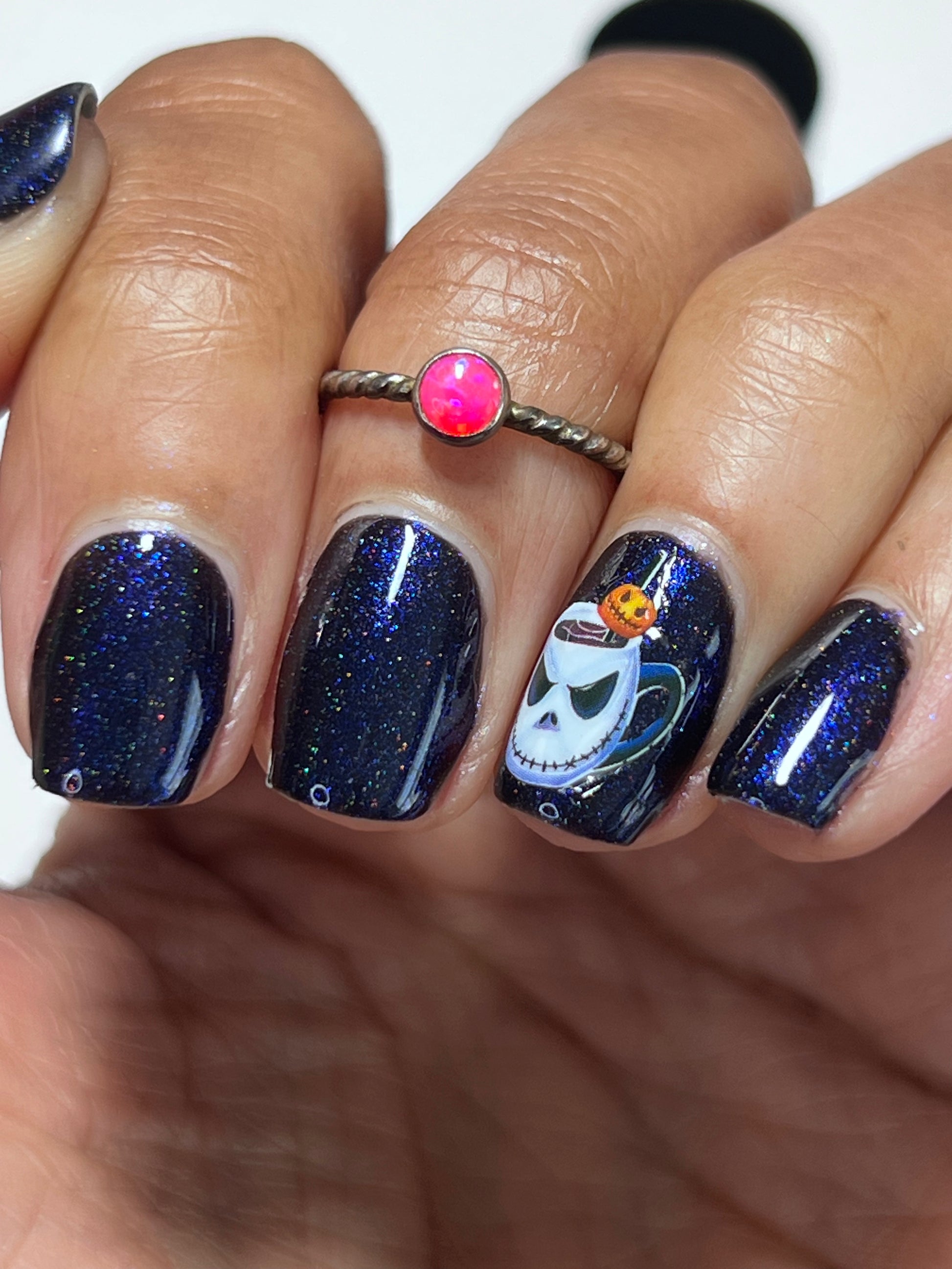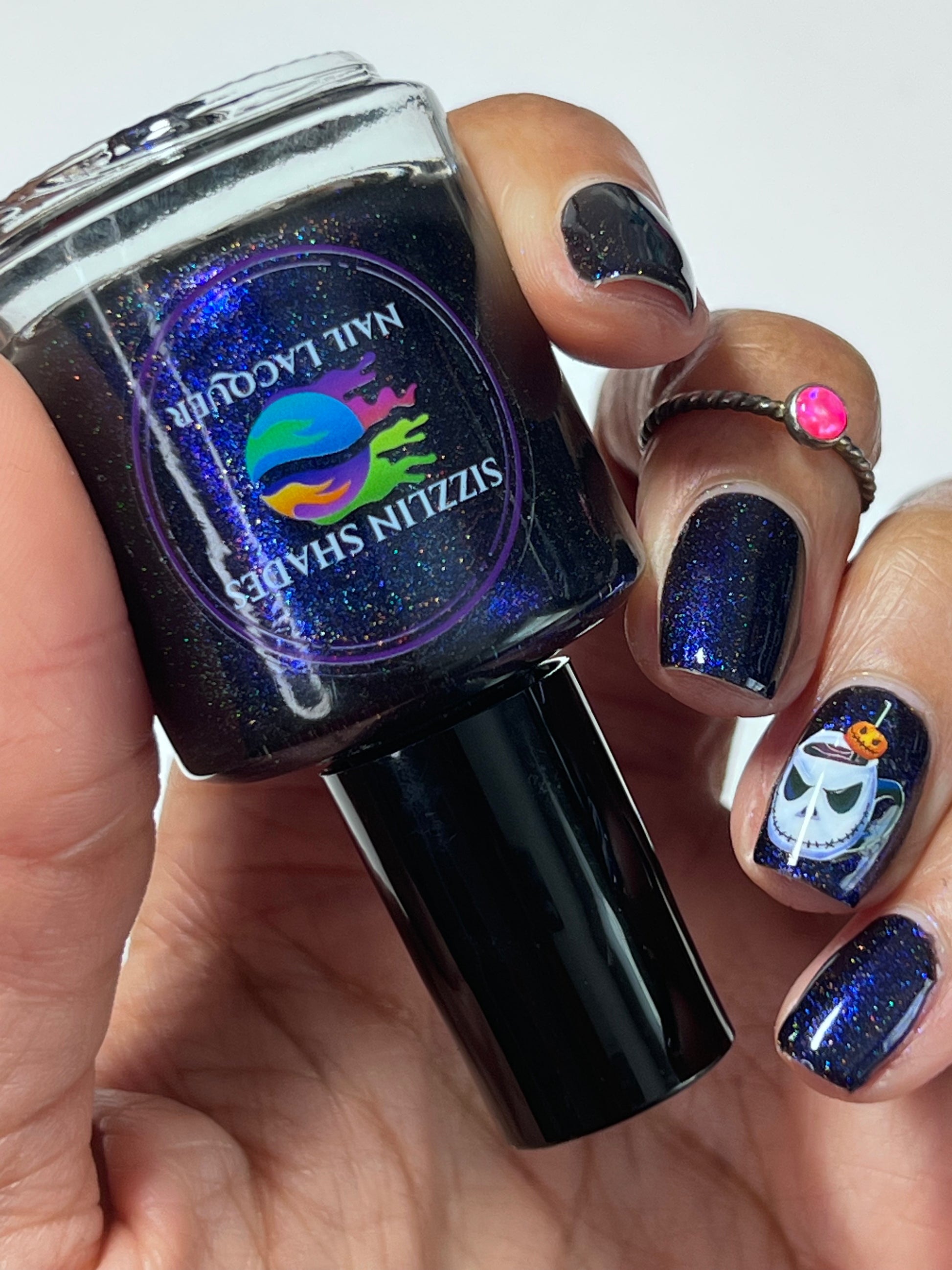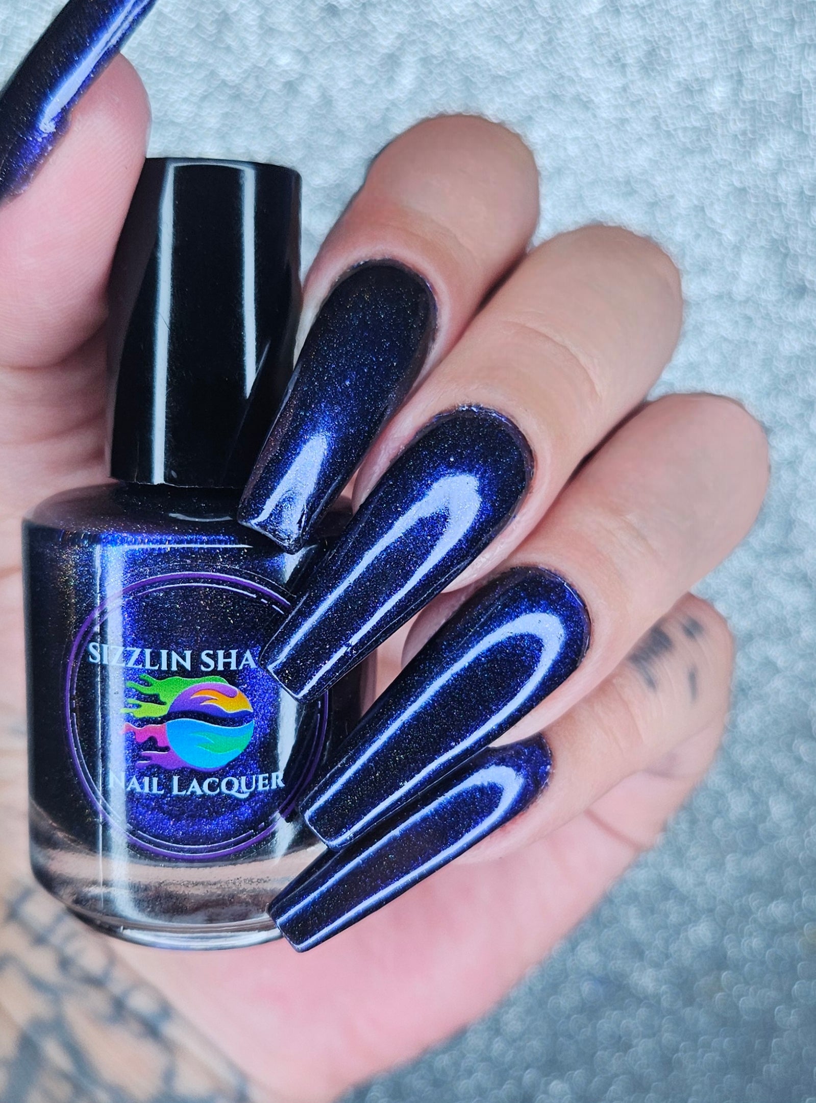Midnight at the Mausoleum is a black polish with linear holo, and a bright blue shimmer.