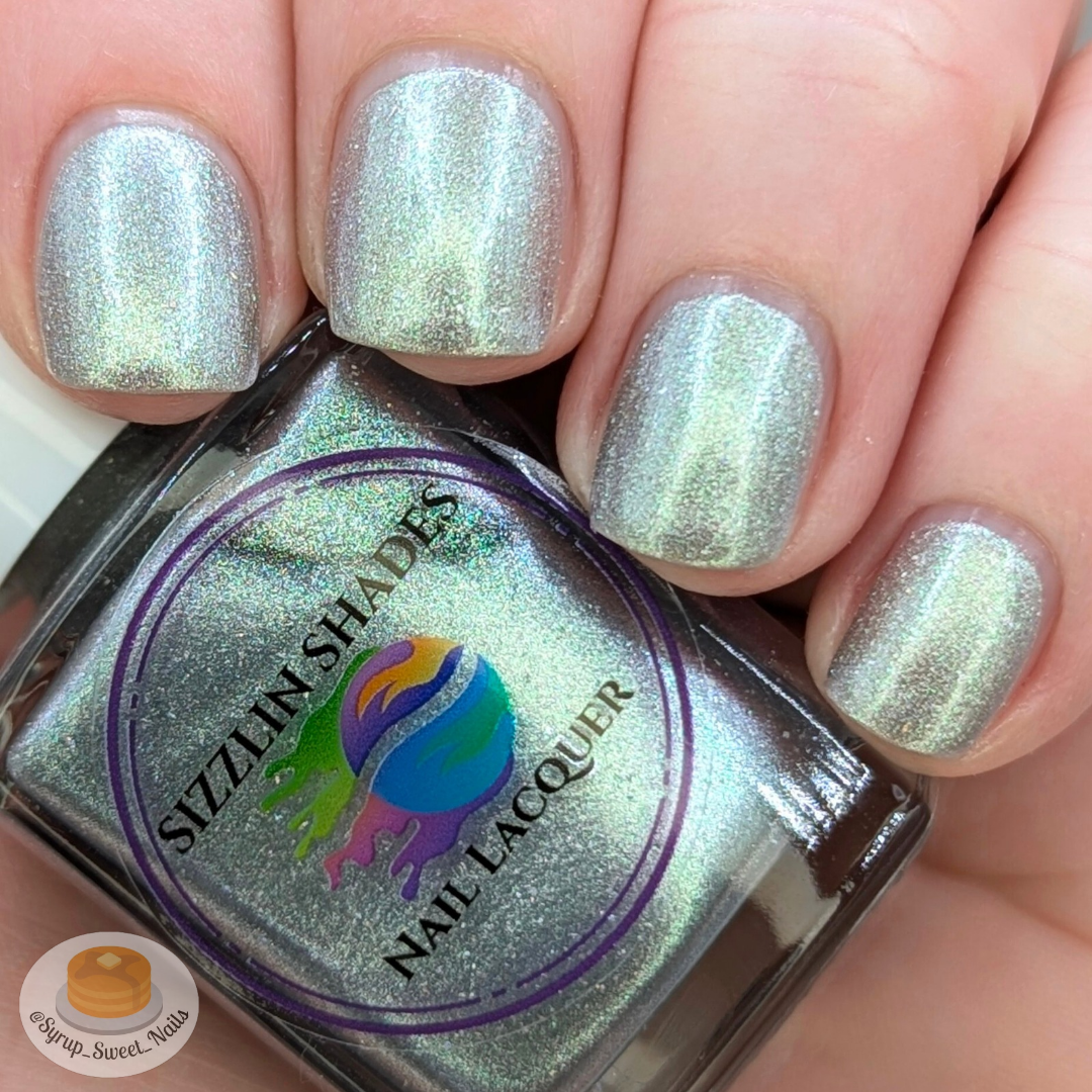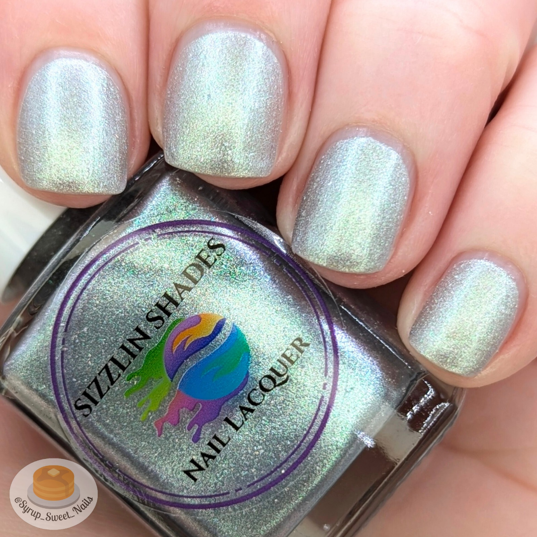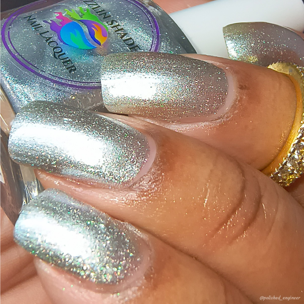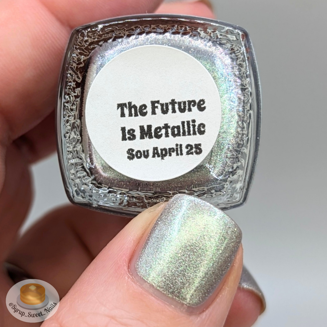 The Future is Metallic is a silver polish with holo flake, and a teal/blue/ purple shimmer. Inspired by the year 2000, and the idea I had as a teenager that everything would be metallic, from clothing, to cars, etc.