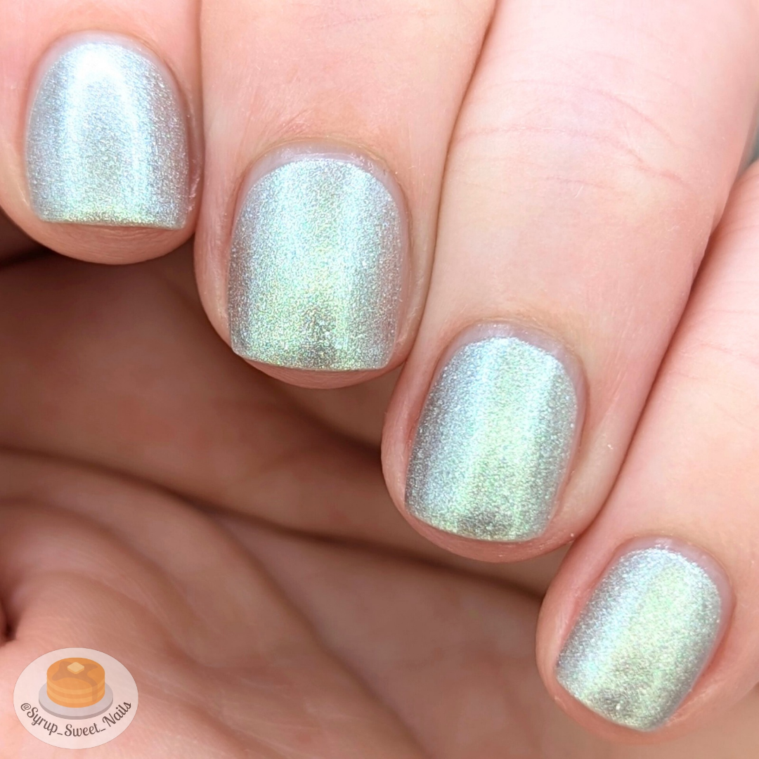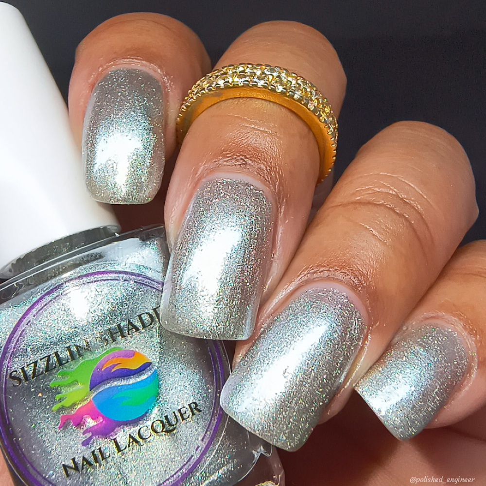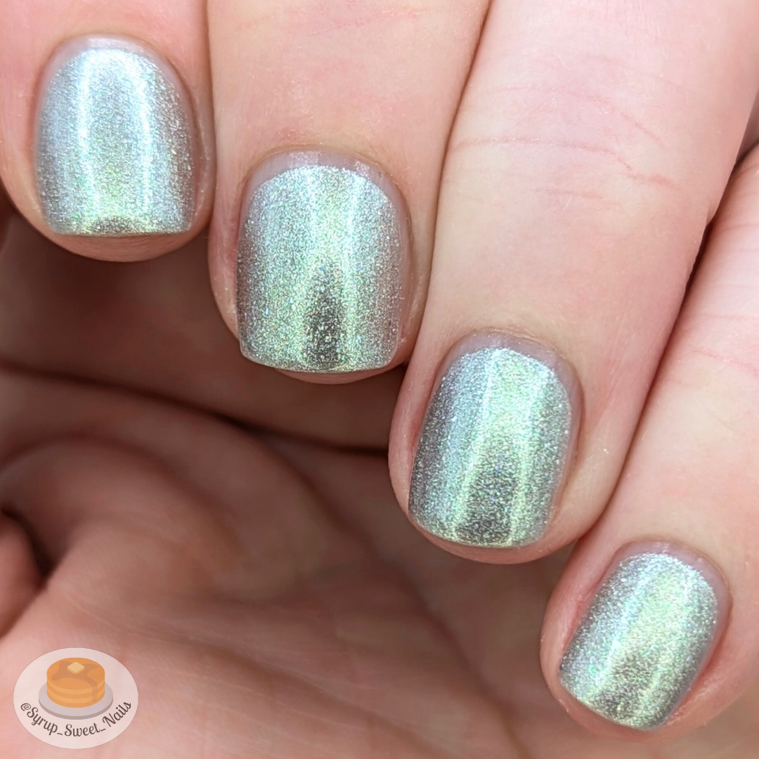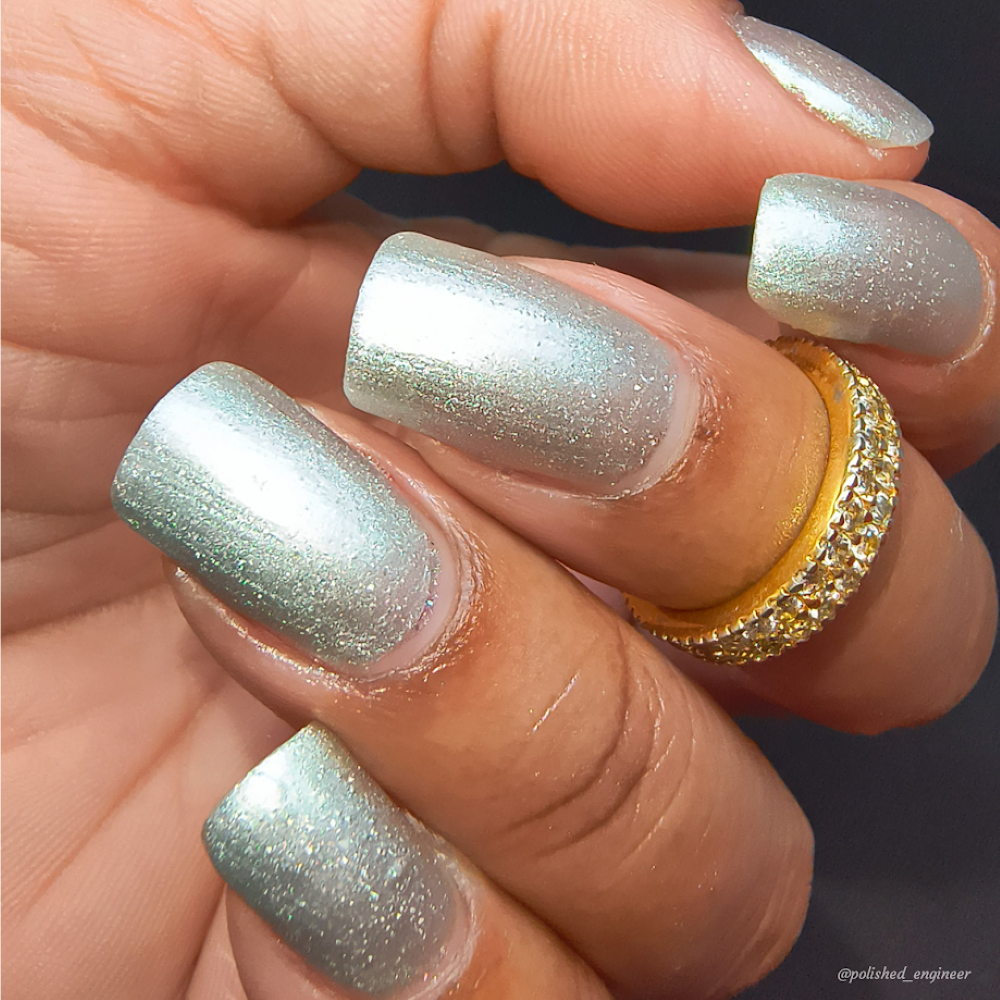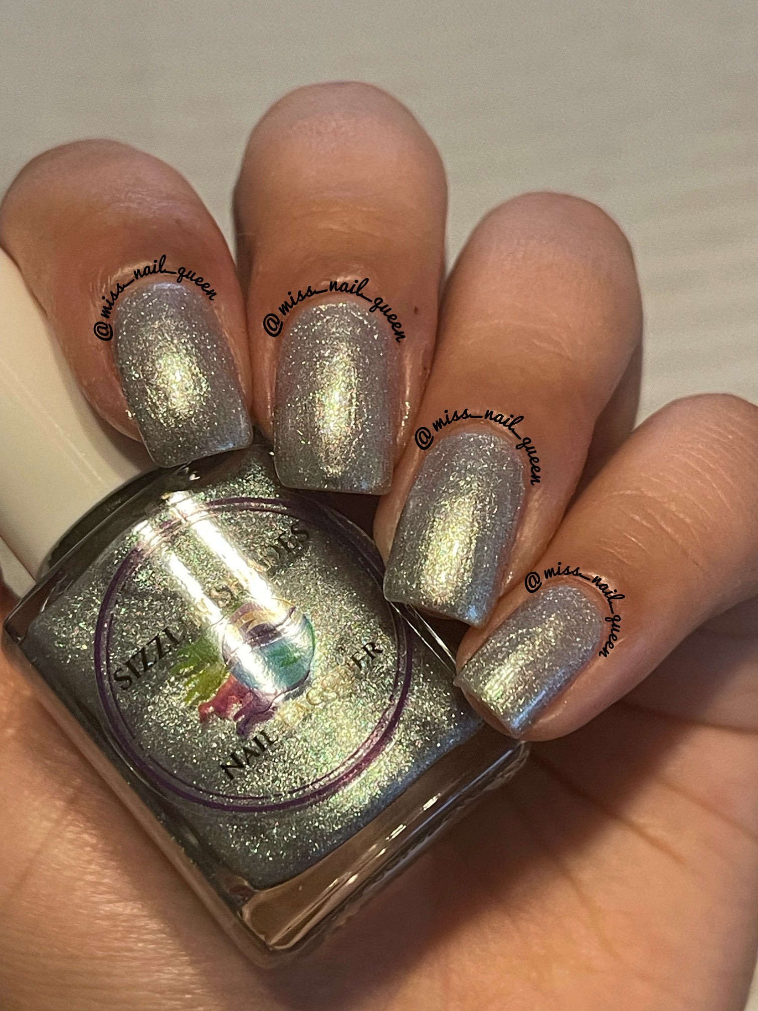 The Future is Metallic is a silver polish with holo flake, and a teal/blue/ purple shimmer. Inspired by the year 2000, and the idea I had as a teenager that everything would be metallic, from clothing, to cars, etc.