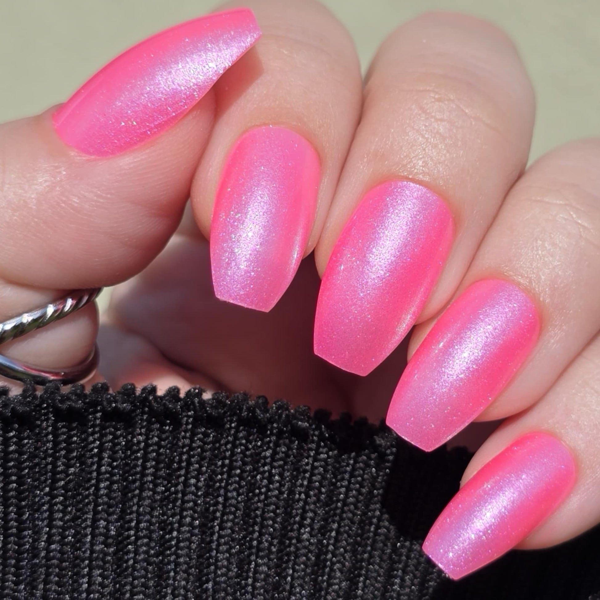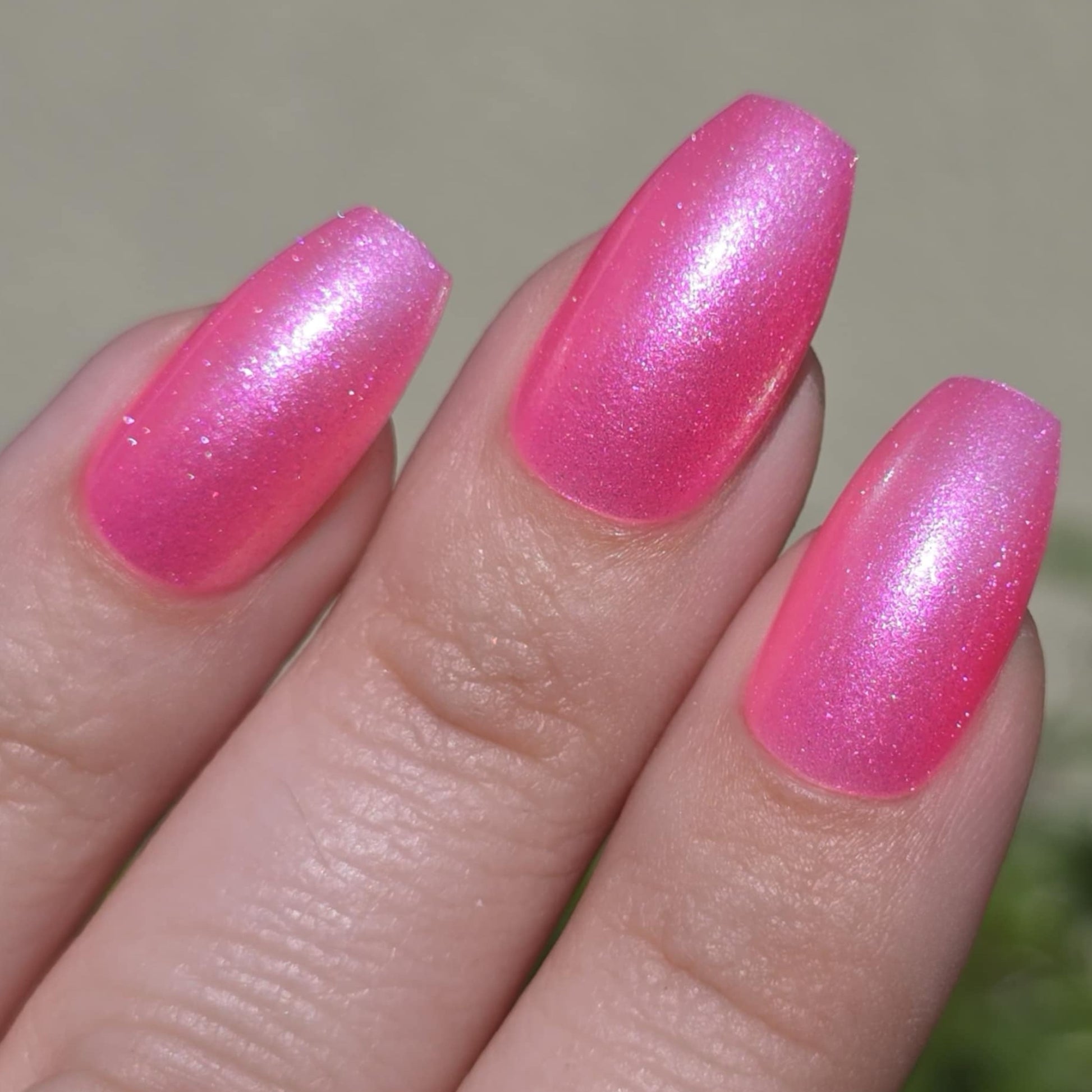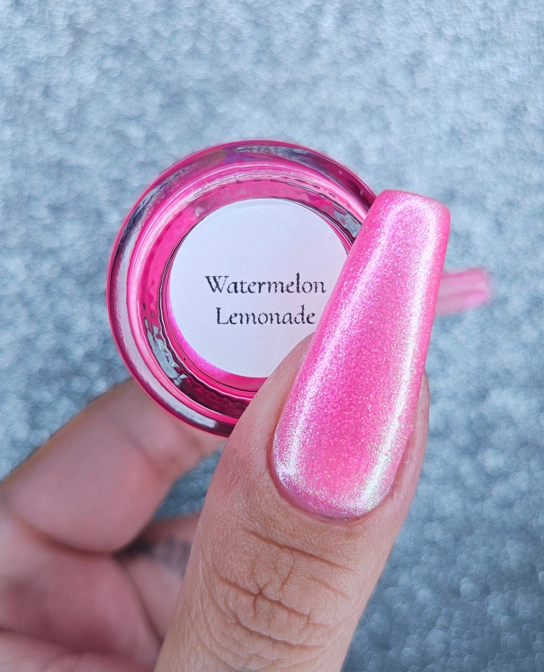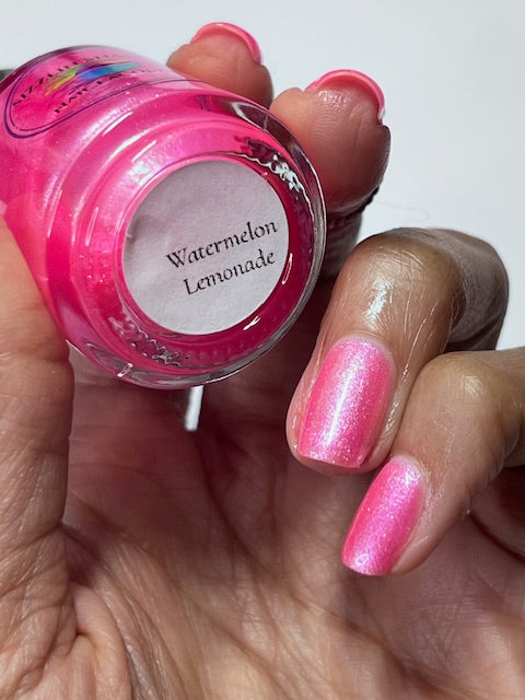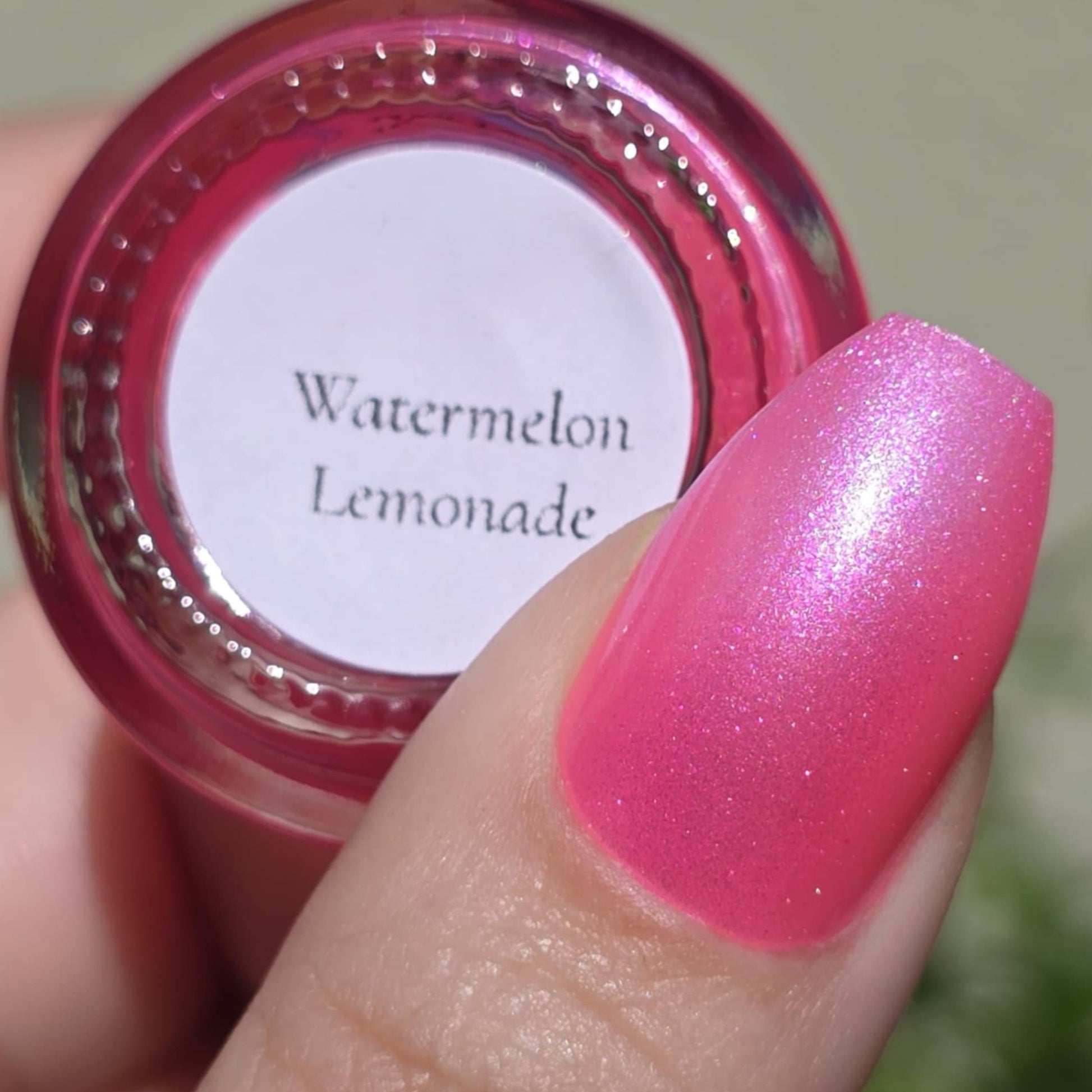 Watermelon Lemonade is a pink nail polish with green/gold shimmer.