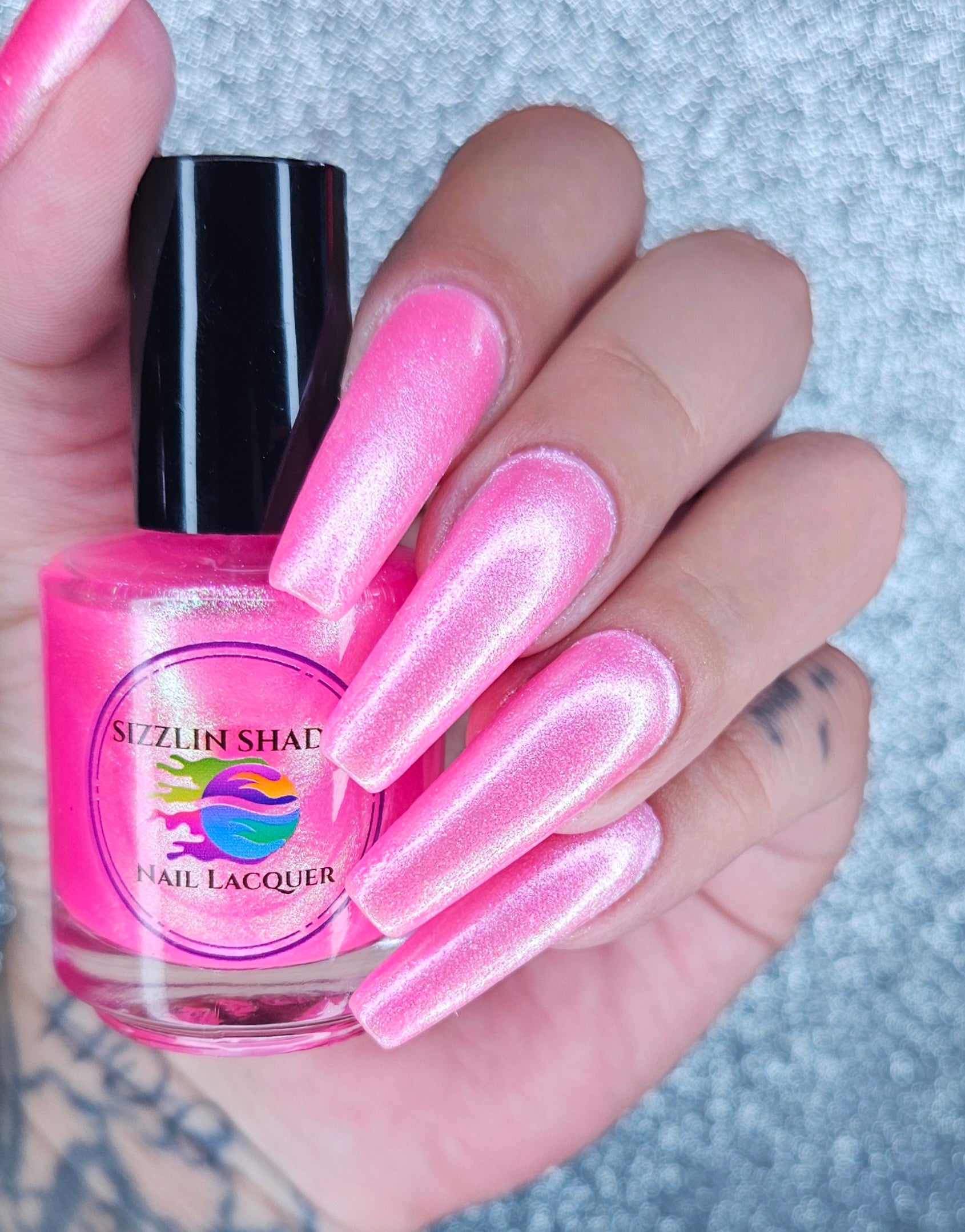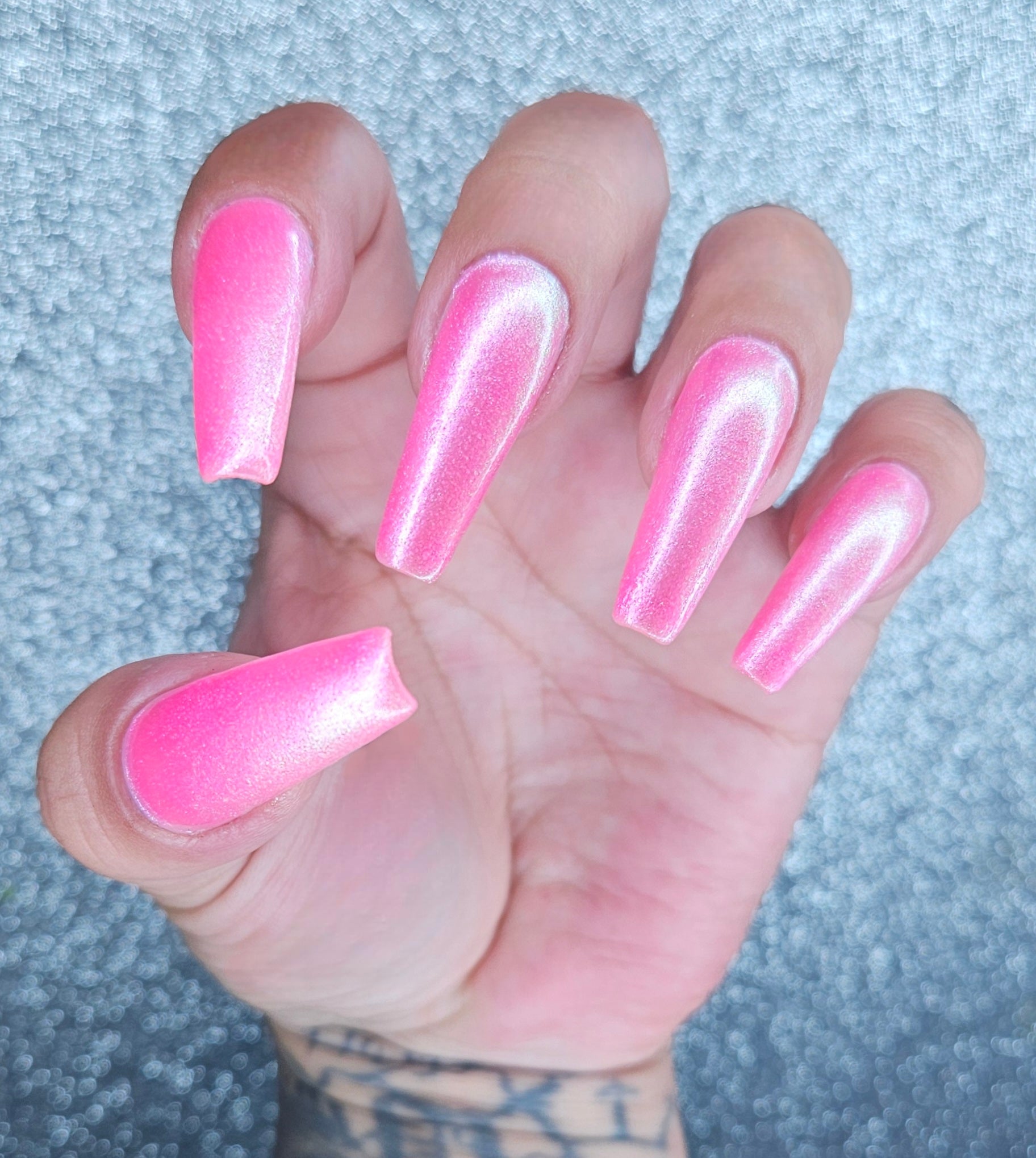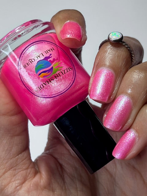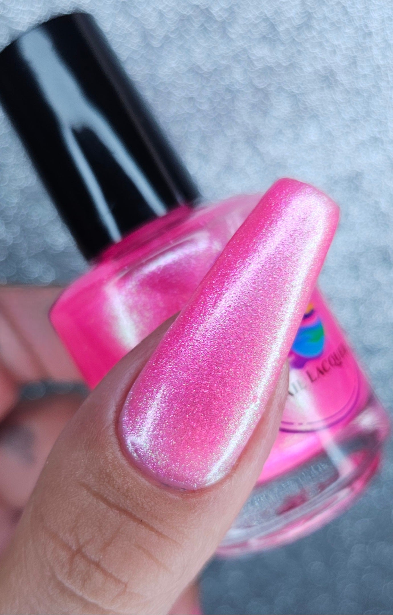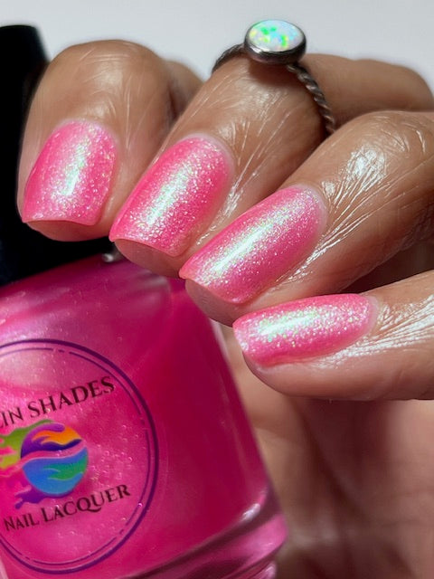 Watermelon Lemonade is a pink nail polish with green/gold shimmer.