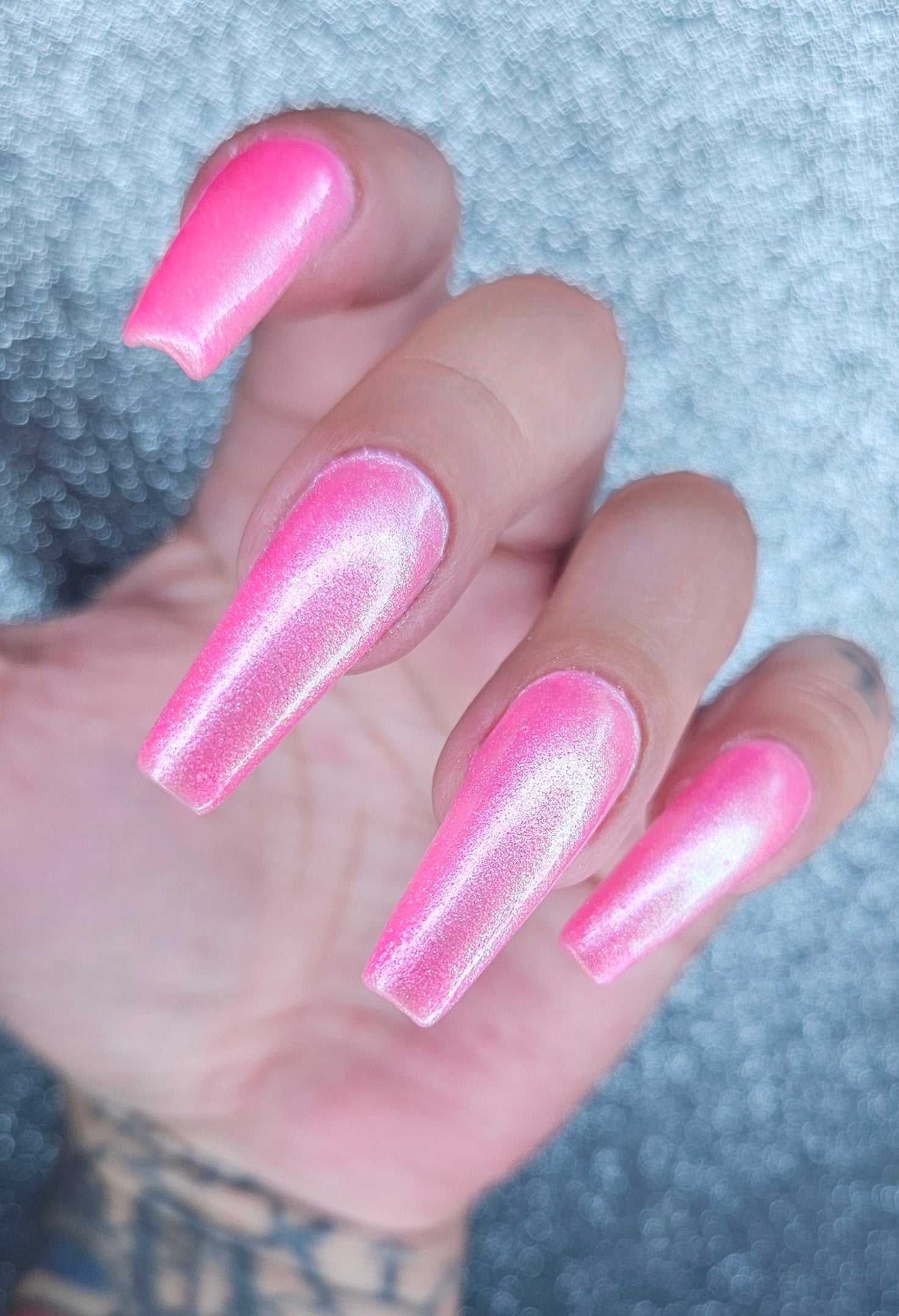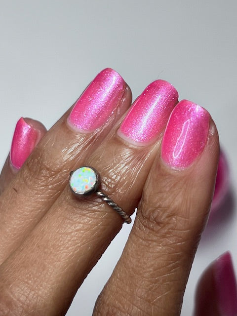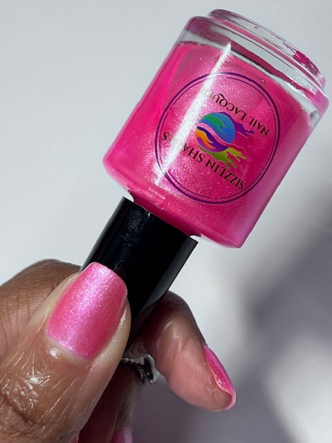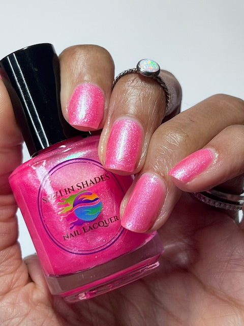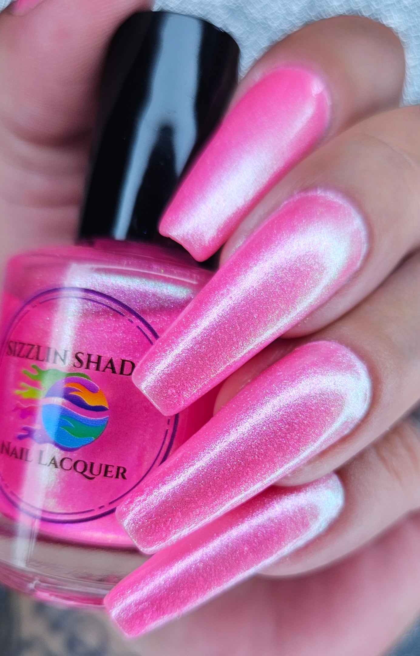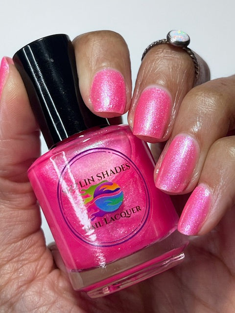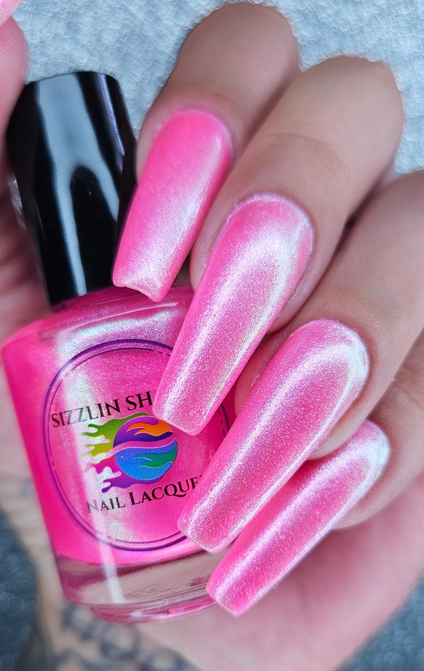 Watermelon Lemonade is a pink nail polish with green/gold shimmer.